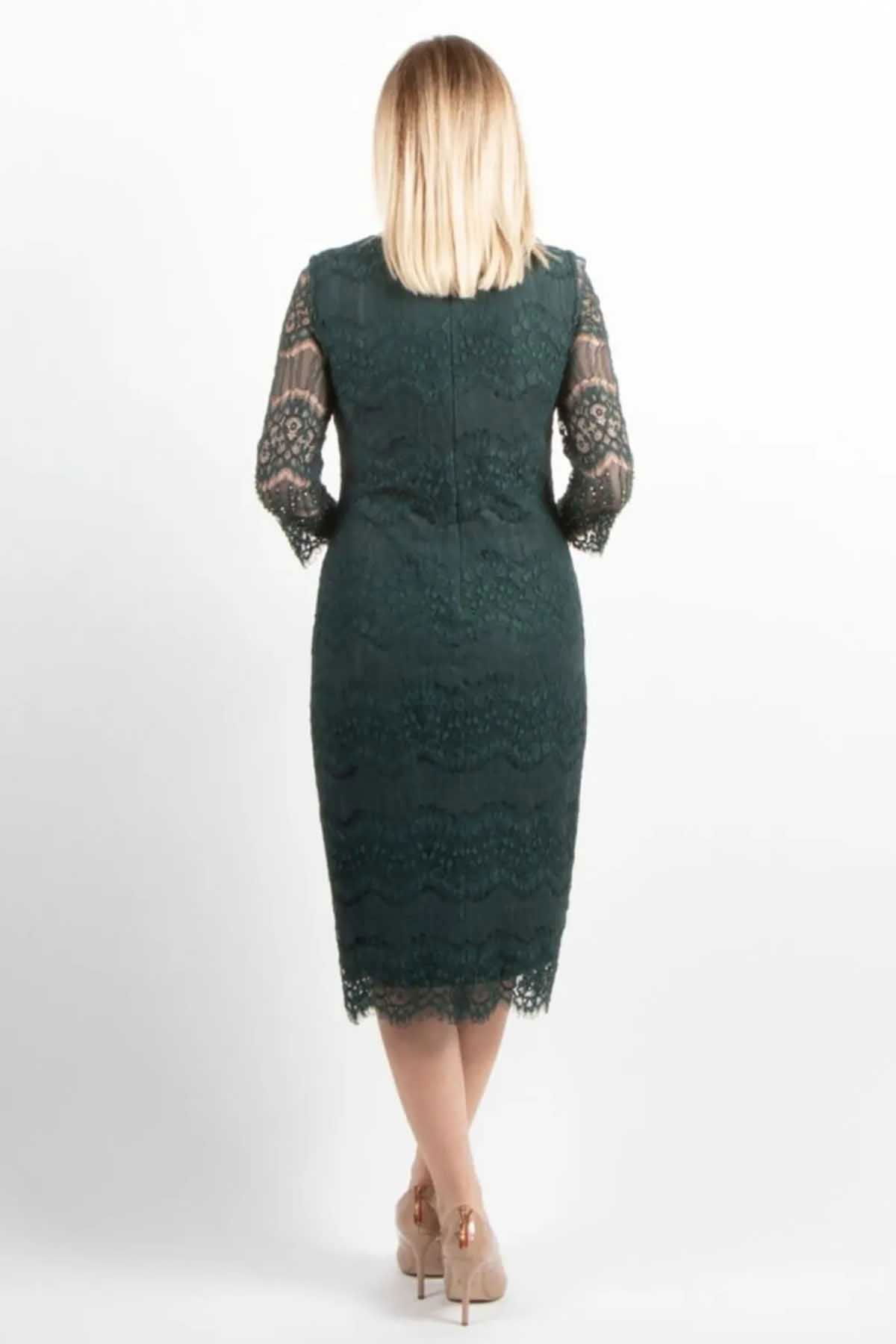 Detay: Dantel dokuma ve taş işlemeli, yuvarlak yaka, midi boy, astarlı abiye elbise;