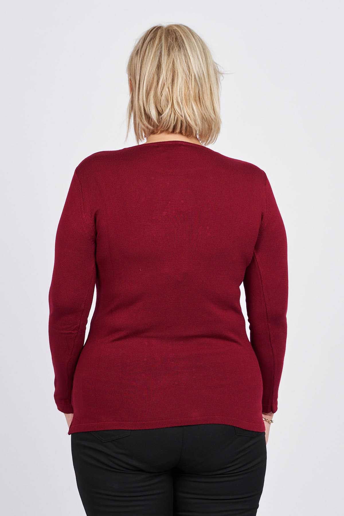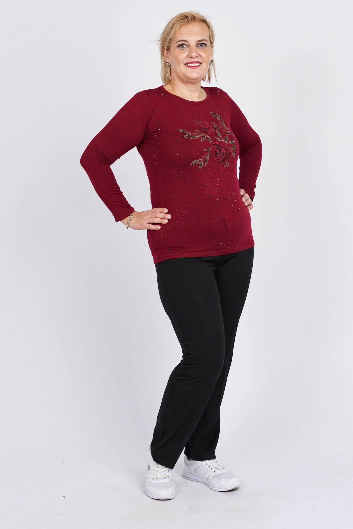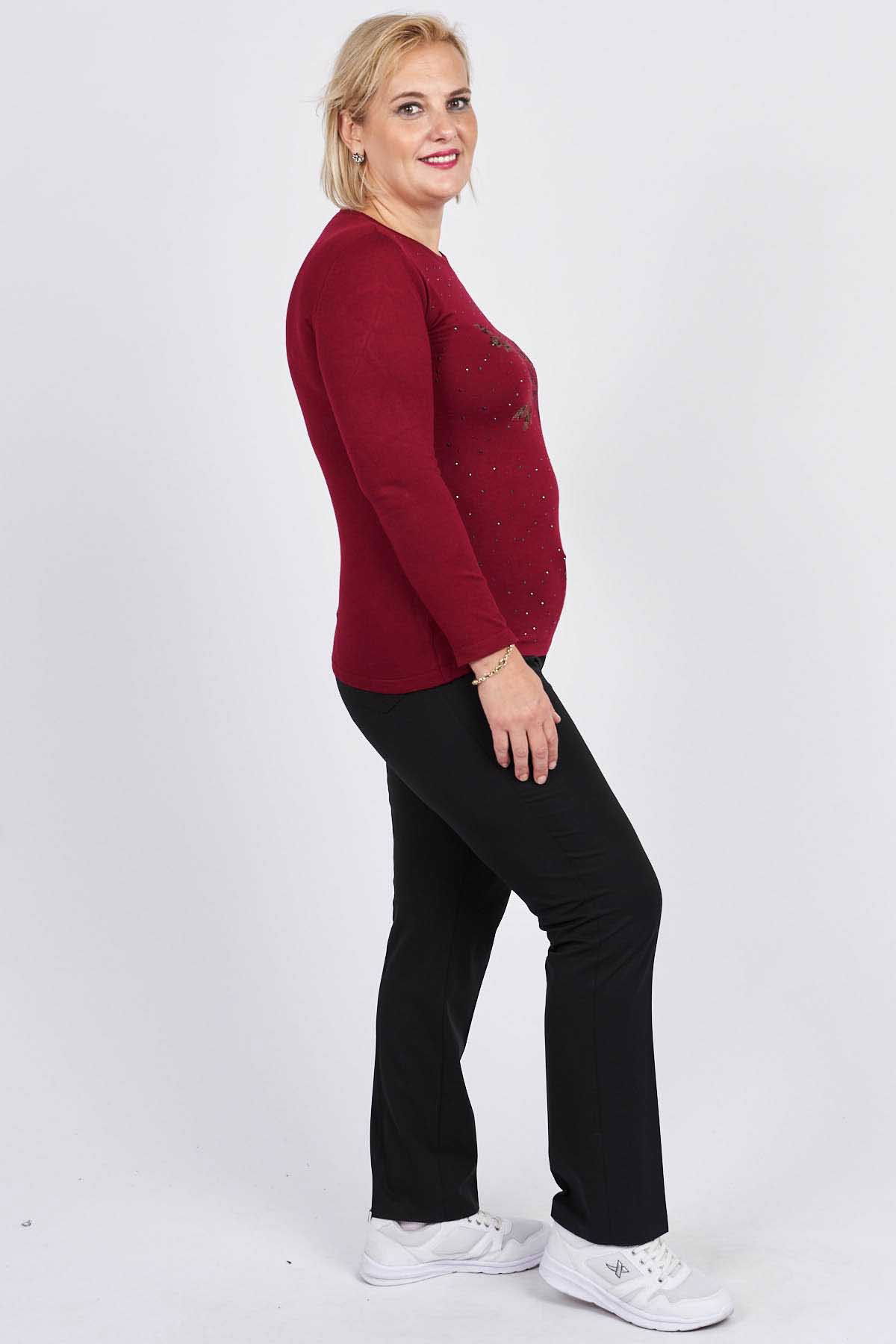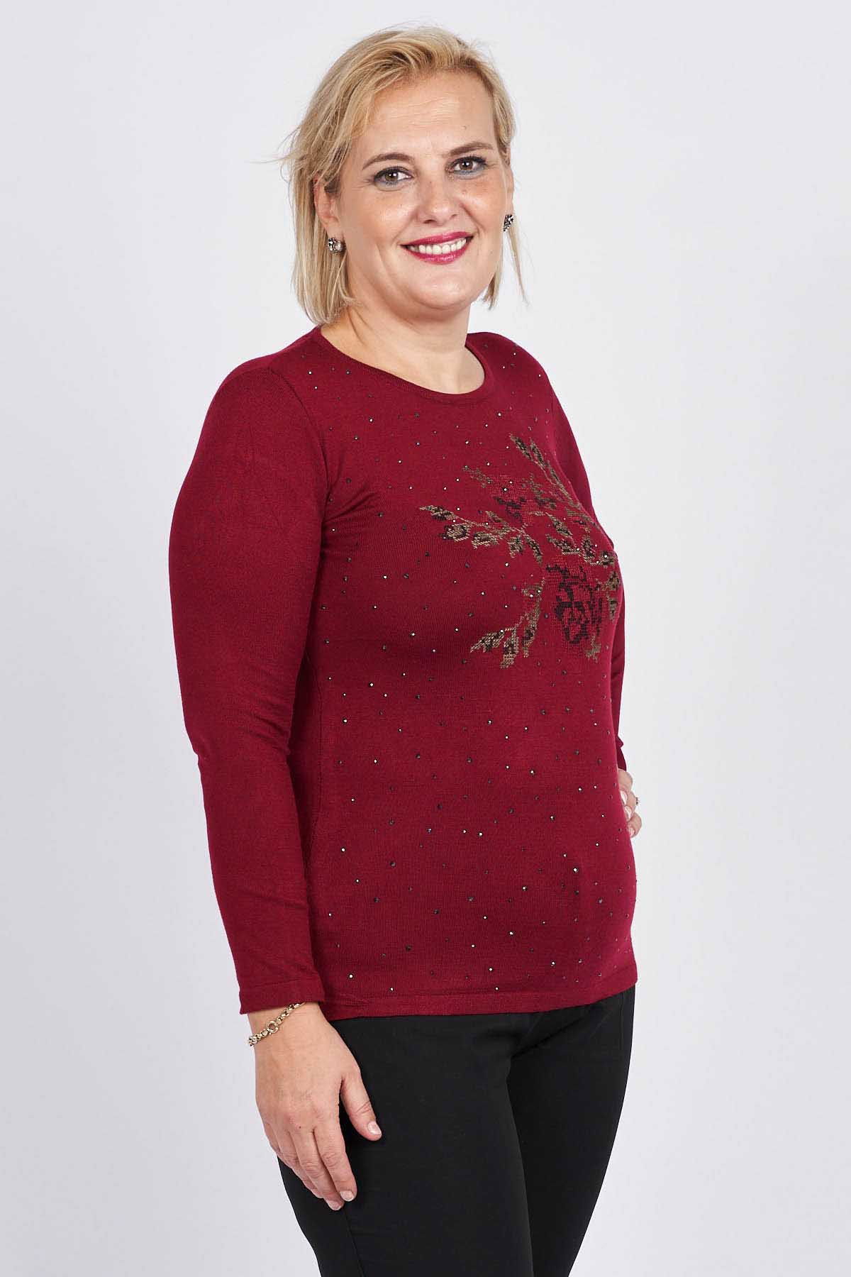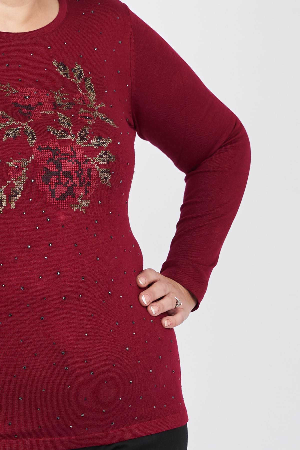 Detay: Önü Gül Nakış ve Taş İşlemeli, Uzun Kollu, Yuvarlak Yaka Bluz;