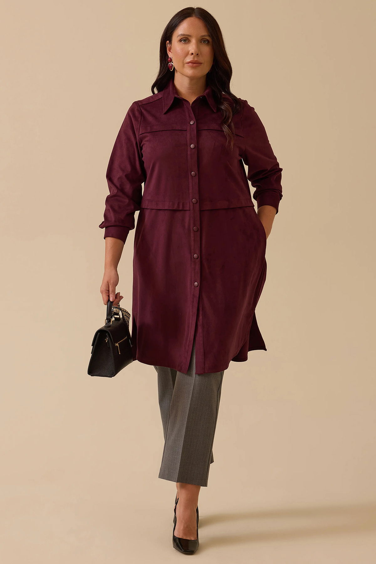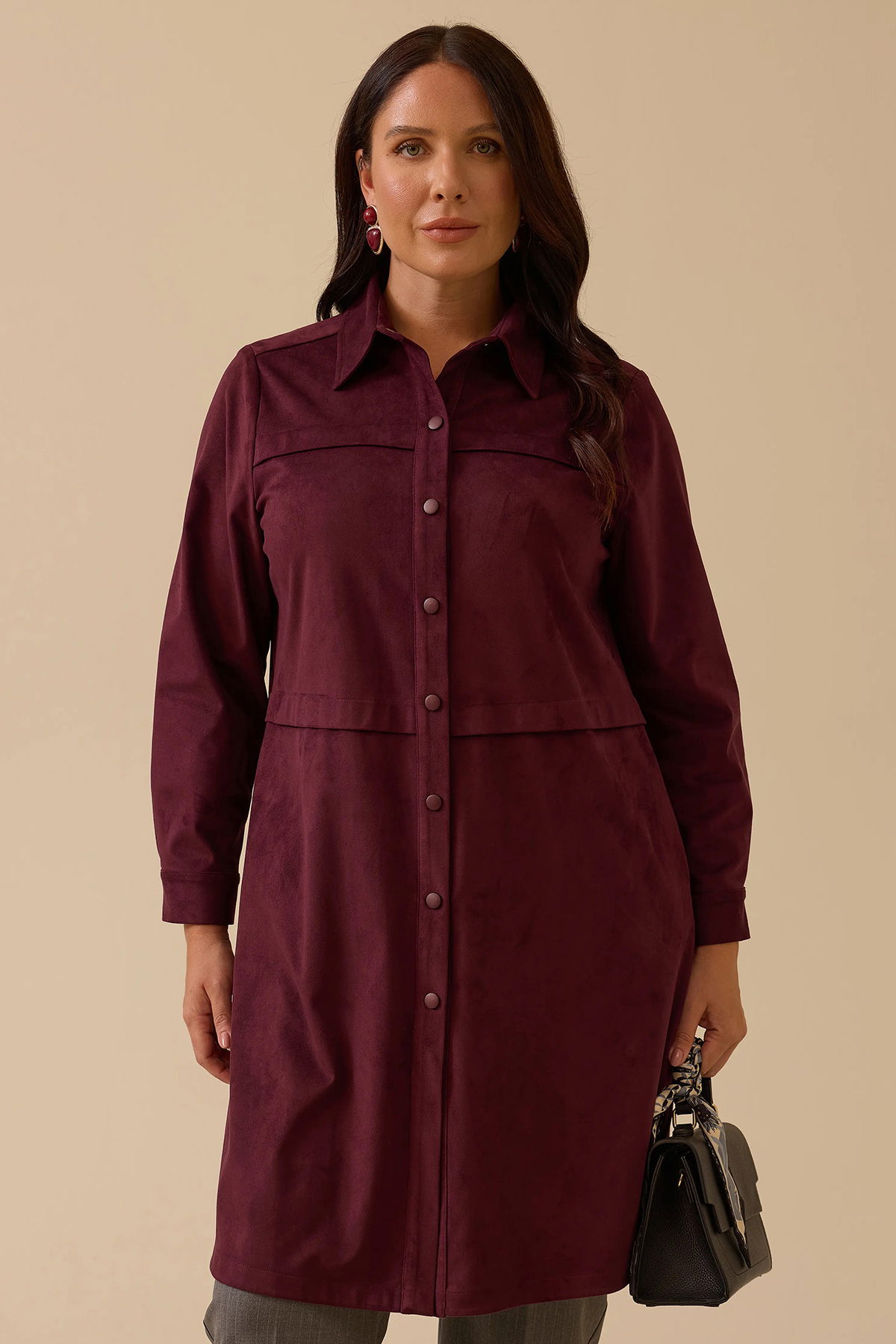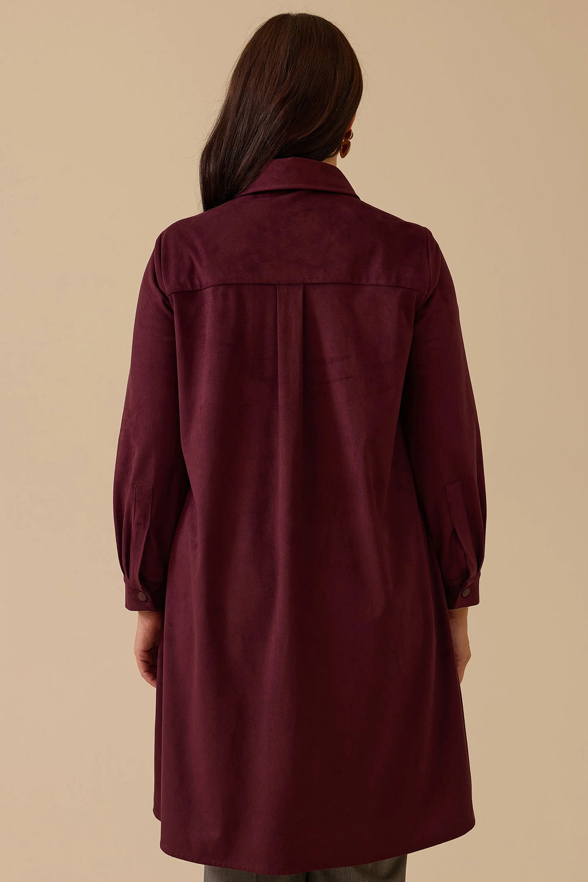Detay: Düz süet dokuma kumaştan tasarlanmış bu relax kesim tunik, günlük stilinize konforlu ve şık bir dokunuş katıyor. Basen altı boyu ve uzun kol yapısıyla mevsim geçişlerinde ideal bir kullanım sunarken, gömlek yaka ve takma kol detayıyla klasik duruşu modern bir çizgiyle buluşturuyor. Düğmeli kapama özelliği ve sade tasarımıyla öne çıkan bu tunik, düğme aksesuarları sayesinde zarif bir detayla tamamlanıyor. Rahatlık ve stilin dengeli birleşimini arayanlar için ideal bir parça;