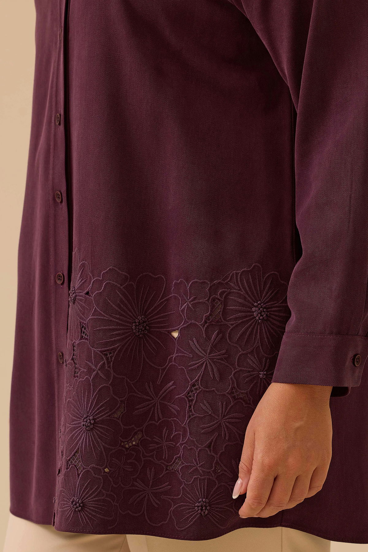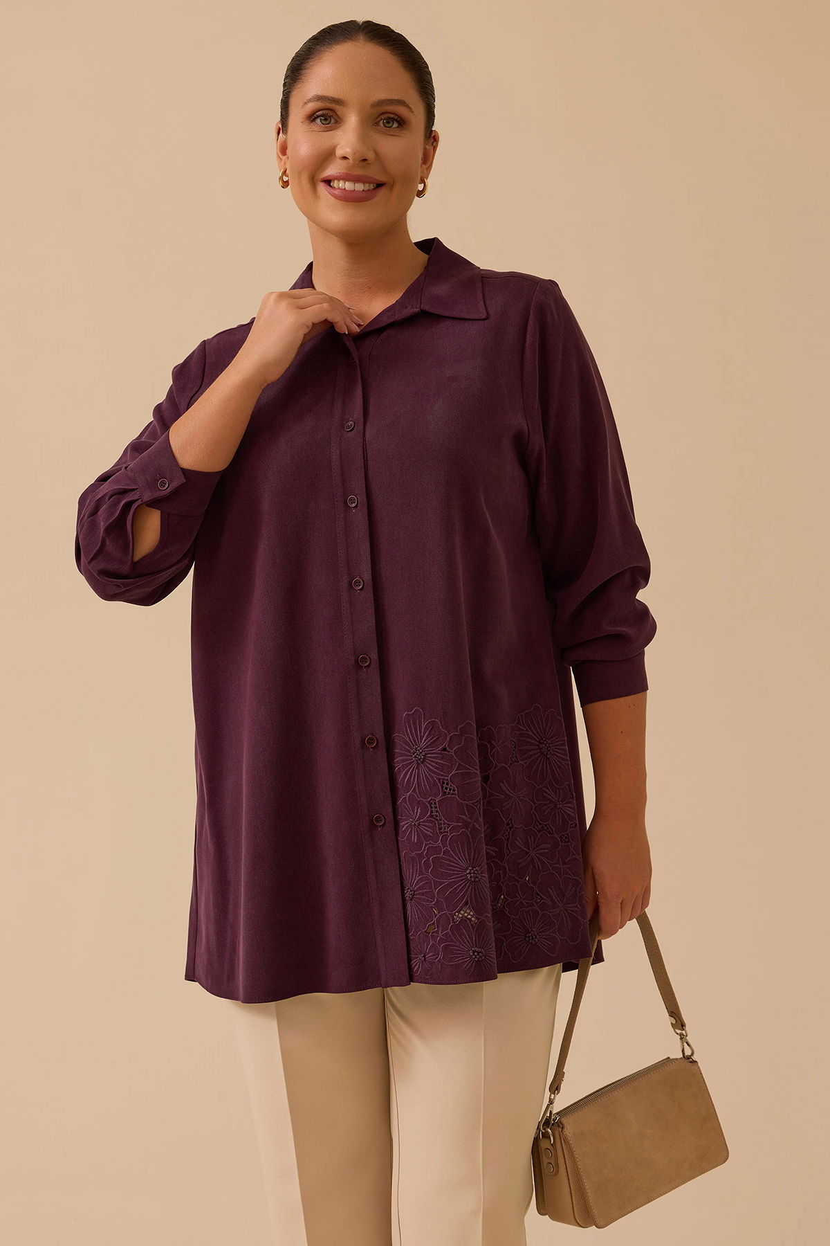 Detay: Büyük beden çiçek işlemeli düğmeli tunik, zarif detayları ve rahat kesimiyle hem şıklığı hem de konforu bir arada sunuyor. Düğmeli ön kapama sayesinde pratik kullanım sağlarken, çiçek işlemeleriyle feminen ve romantik bir hava katıyor. Günlük stilinizde veya özel günlerde rahatlıkla tercih edebileceğiniz bu tunik, büyük beden tasarımıyla vücut hatlarını nazikçe sararak özgüvenli bir görünüm sağlar;