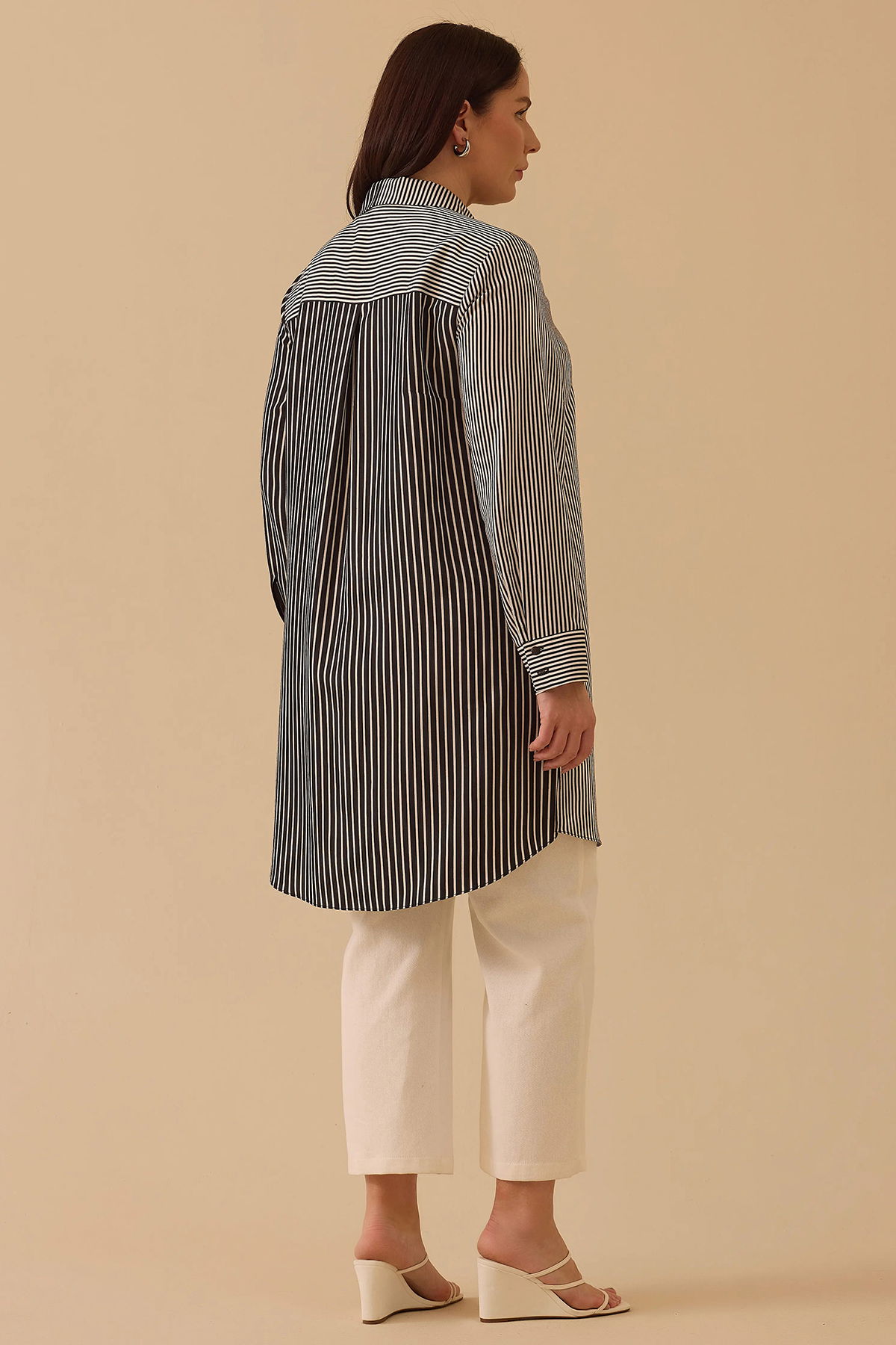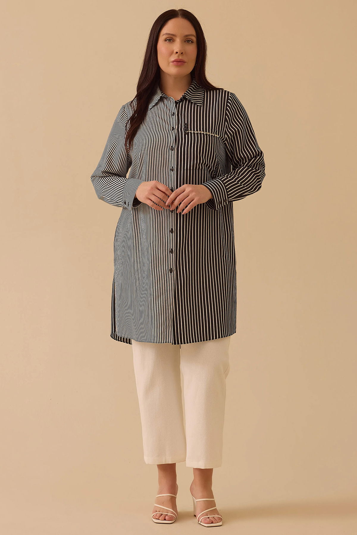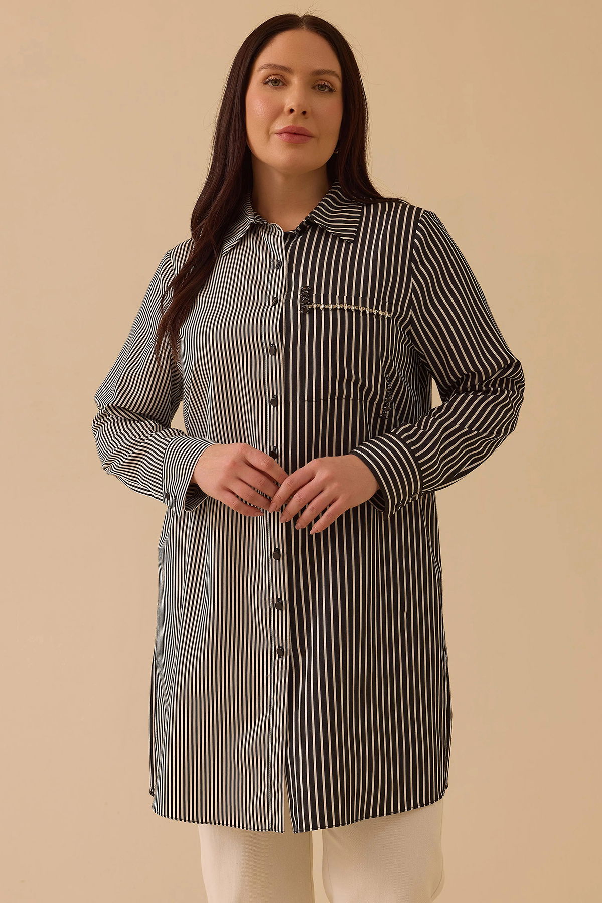 Detay: Viskon dokuma kumaştan üretilen, astarsız, regular fit kesim, basen altı boy, normal bel, gömlek yaka, uzun kollu ve düğmeli bu tunik modeli tüm bu özellikleri ile klasik ve şık bir görünüm sunar. Çizgili kumaş özelliği modern bir dinamizm katarken taşlı aksesuar detayı tunikte zarif bir ışıltı sağlar. Gömlek yaka tasarımı resmi bir hava verirken regular fit kesim rahat bir kullanım sunar. Uzun kol formu mevsim geçişlerinde ideal olurken düğmeli kapama şekli pratiklik ve klasik bir dokunuş kazandırır;