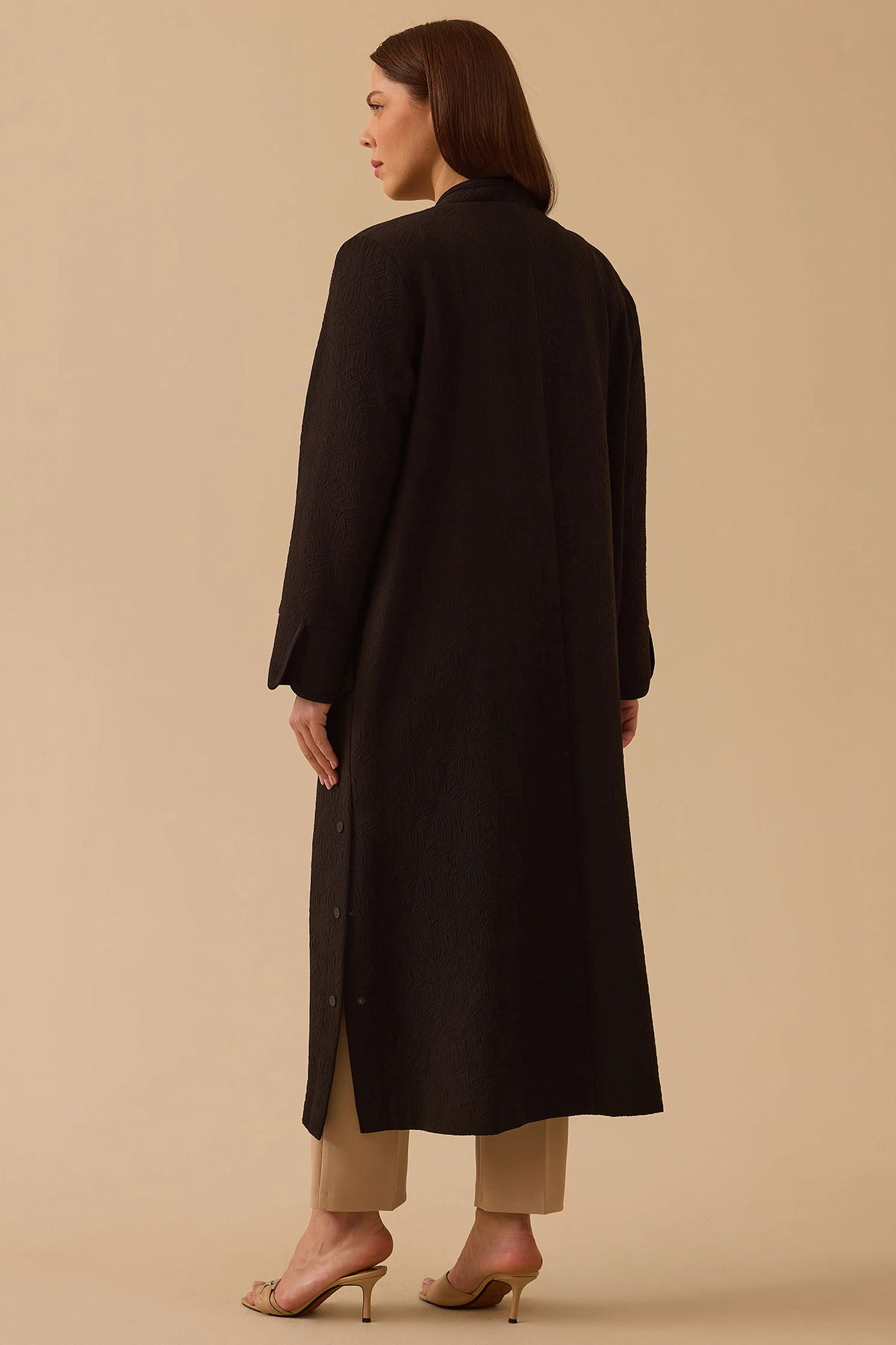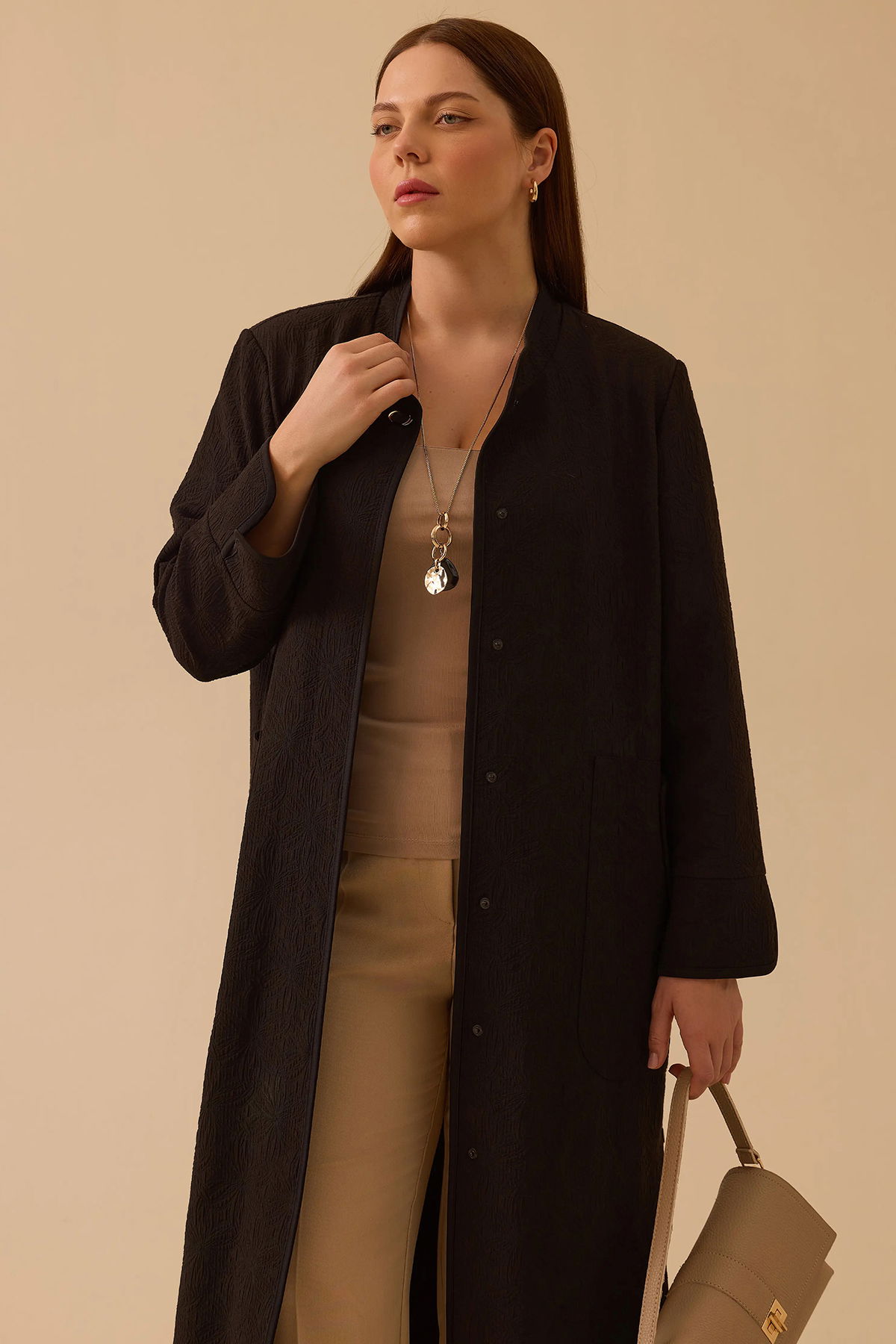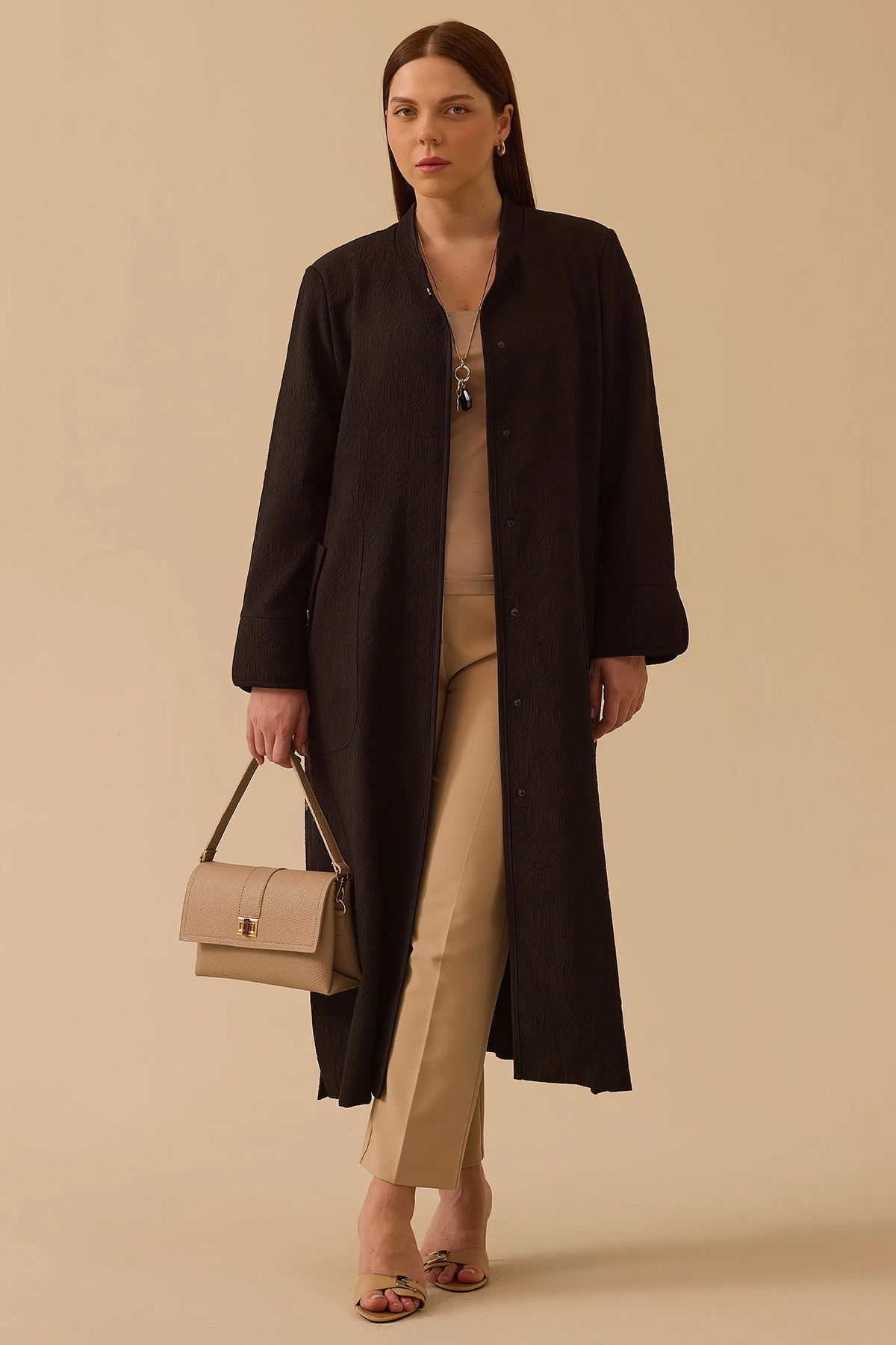 Detay: Dokuma tipinde polyester kumaştan üretilen bu pardesü, astarsız yapısıyla hafif bir kullanım sunarken hakim yaka tasarımıyla resmi etkinliklere uygun zarif bir görünüm sergiliyor. Normal bel kesimi ve diz altı boyu klasik bir duruş sağlarken, uzun takma kollar ve desenli kumaş modern bir şıklık katıyor. Çıt çıt kapama detayı ve cepli tasarımıyla fonksiyonel hale gelen bu pardesü, resmi davetlerden günlük şıklığa kadar geniş kullanım alanına sahip;