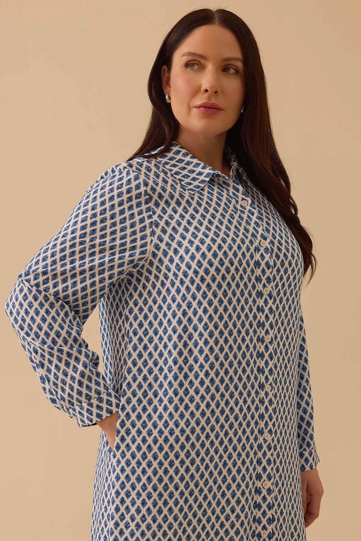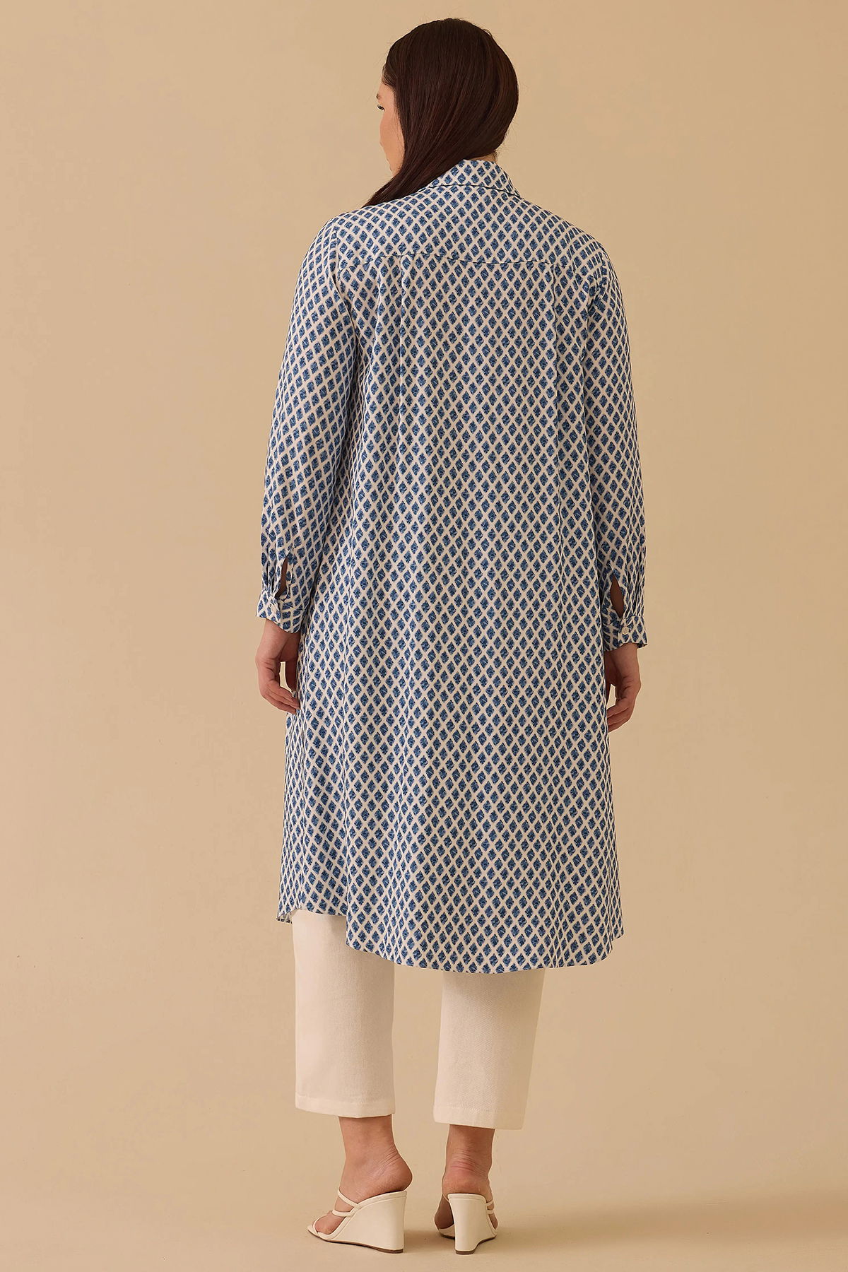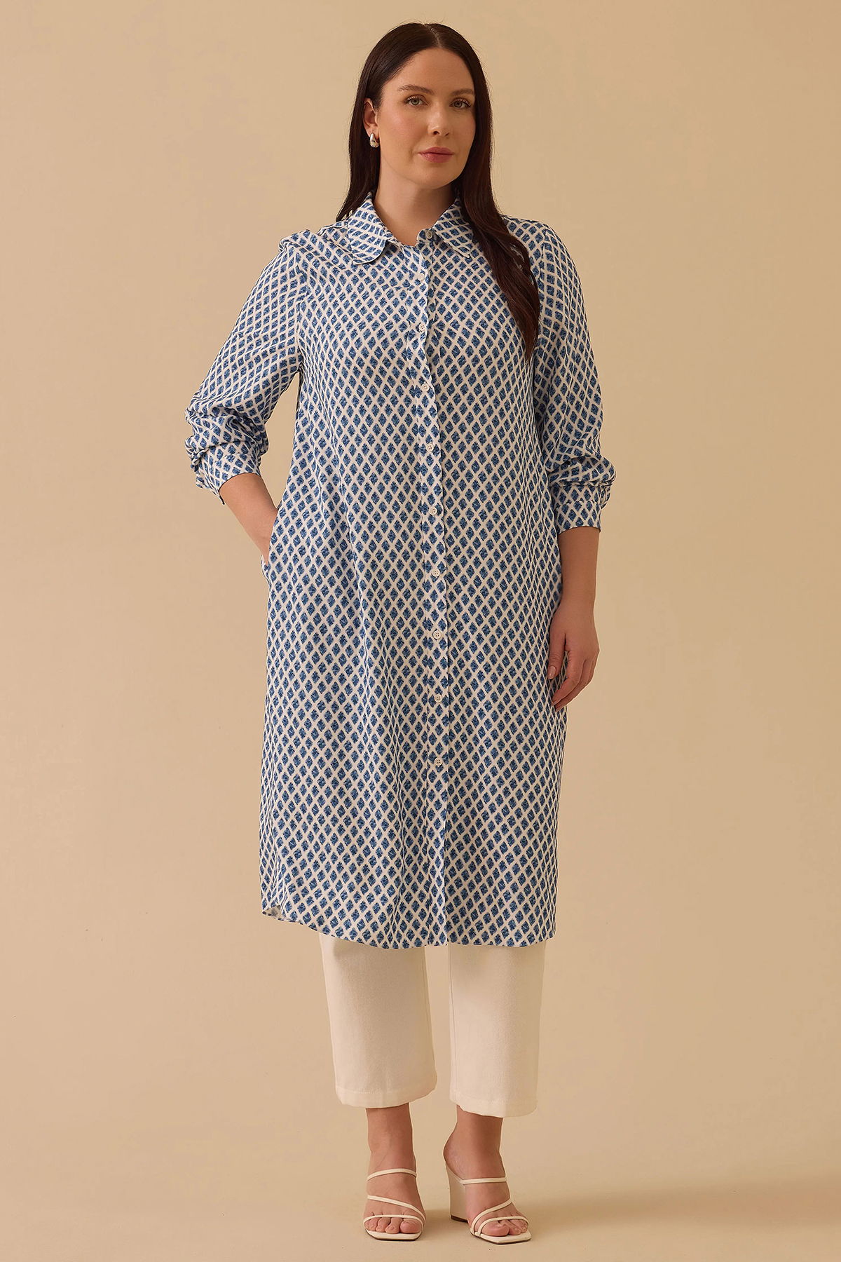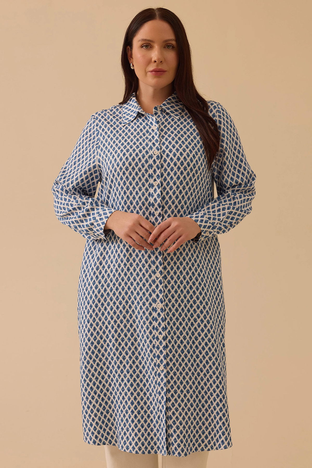 Detay: Bu tunik modeli, pamuklu dokuma kumaş yapısıyla doğal ve rahat bir kullanım sunarken desenli tasarımıyla şıklığı ön plana çıkarır. Regular kesimi günlük kullanım için ideal bir duruş sağlarken, gömlek yaka detayı klasik ve sofistike bir hava katar. Uzun kollu ve diz altı boyu sayesinde mevsim geçişlerinde şık bir tercih olur. Takma kol tasarımı modern bir görünüm kazandırırken, normal bel ölçüsü konforu artırır. Hem günlük kombinlerde hem de daha özel ortamlarda zarif bir seçenek olarak öne çıkan, kullanışlı ve stil sahibi bir parçadır;
