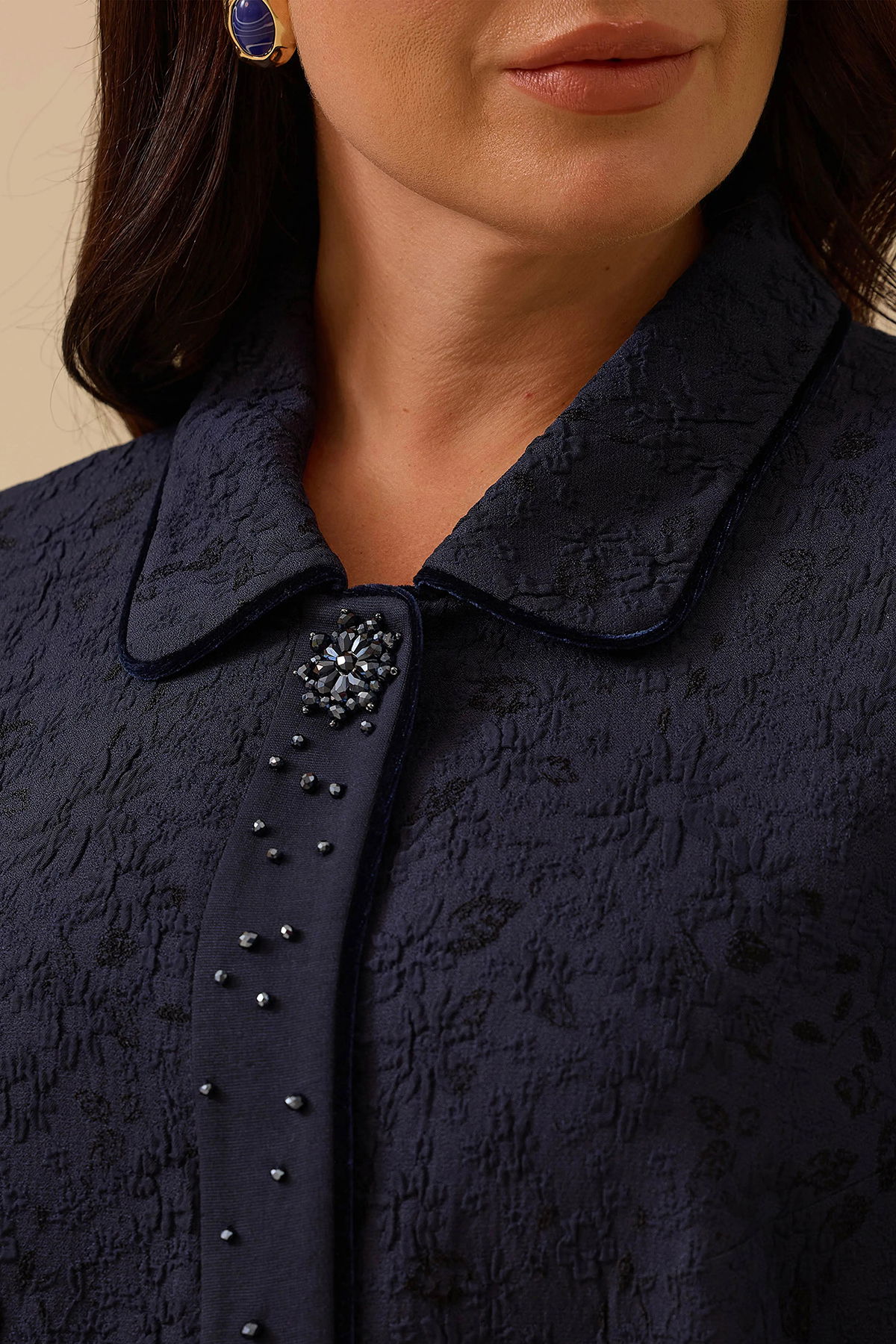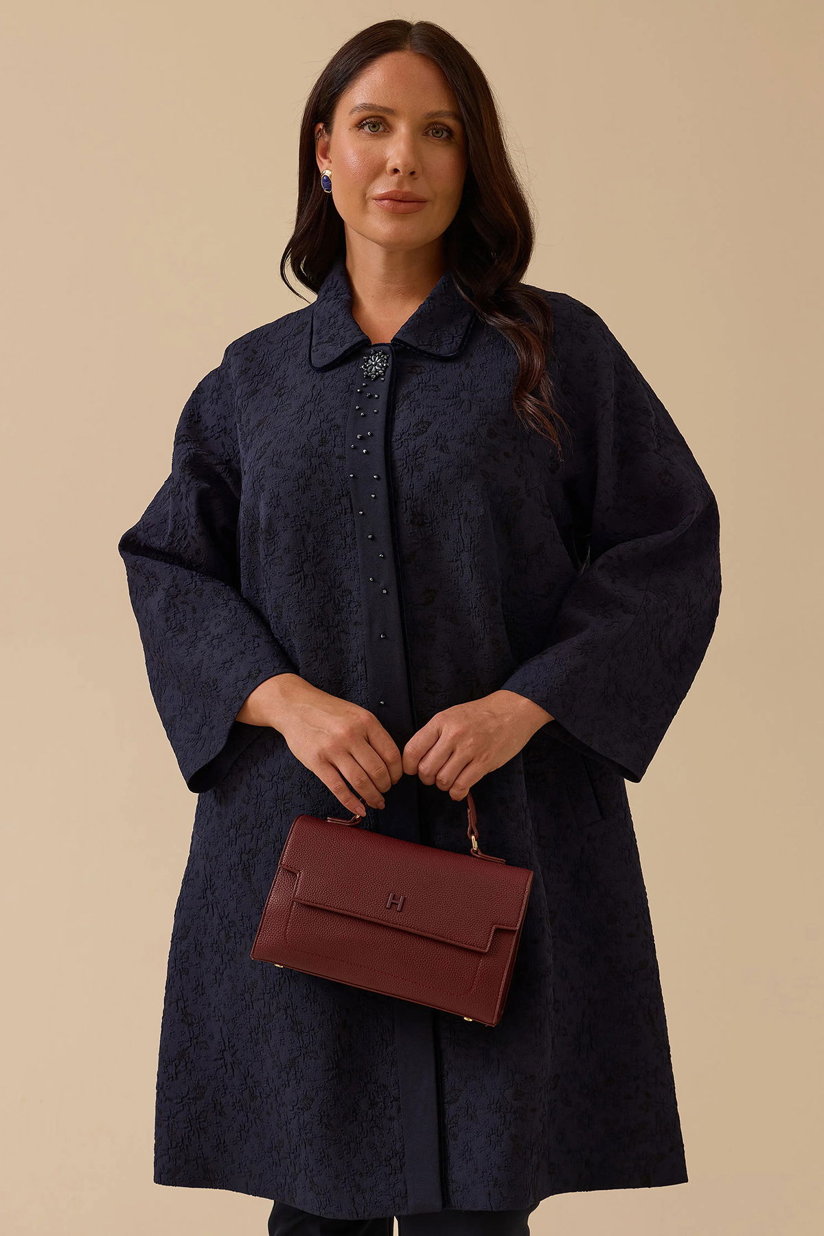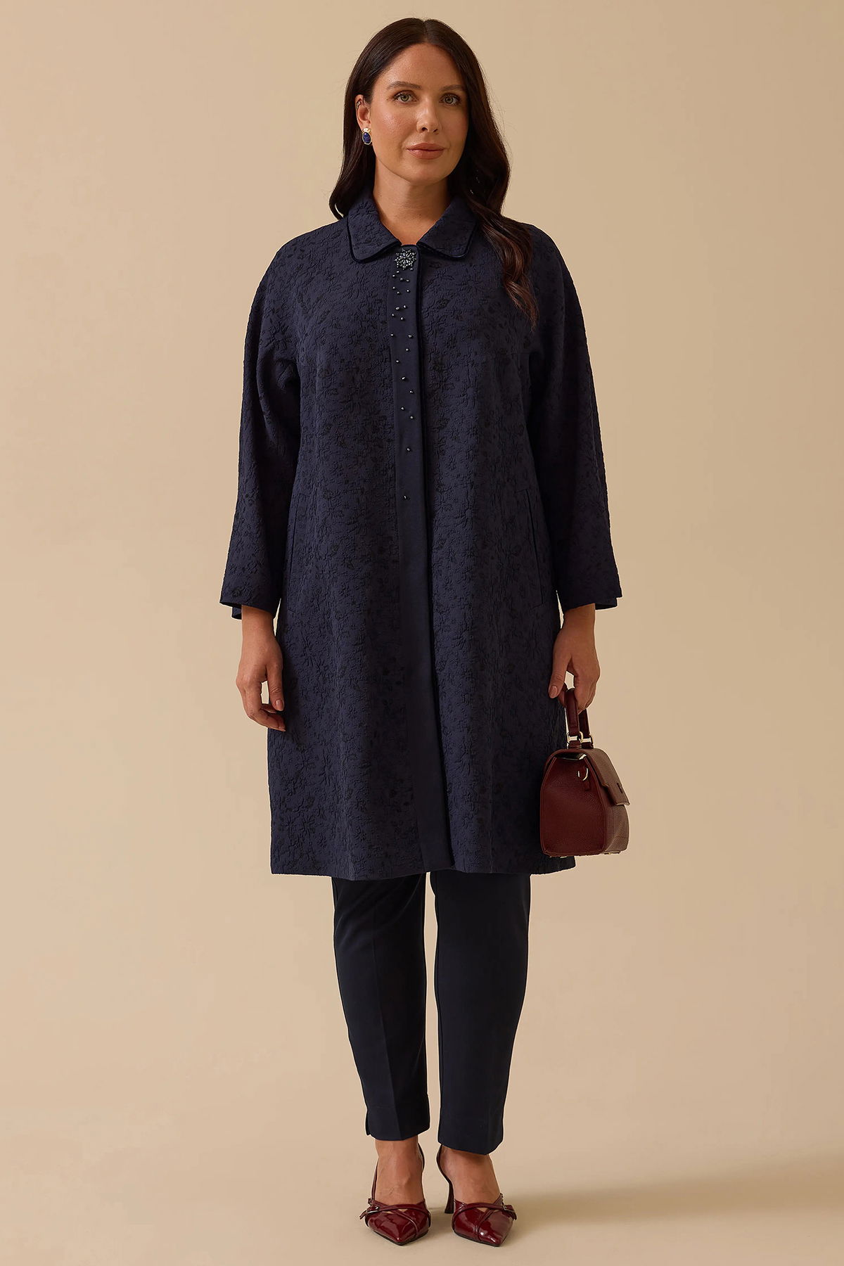 Detay: Bu kap modeli, çiçek desenli jakar dokuma kumaşıyla şık ve dikkat çekici bir görünüm sunar. Relax kesimi ve midi boyu sayesinde rahatlıkla zarafeti bir araya getirir. Gömlek yaka ve uzun yarasa kol detayı modern bir siluet oluştururken, çıt çıtlı kapama şekli pratiklik sağlar. Aksesuar detaylarıyla stilinizi tamamlayan özel bir parçadır;