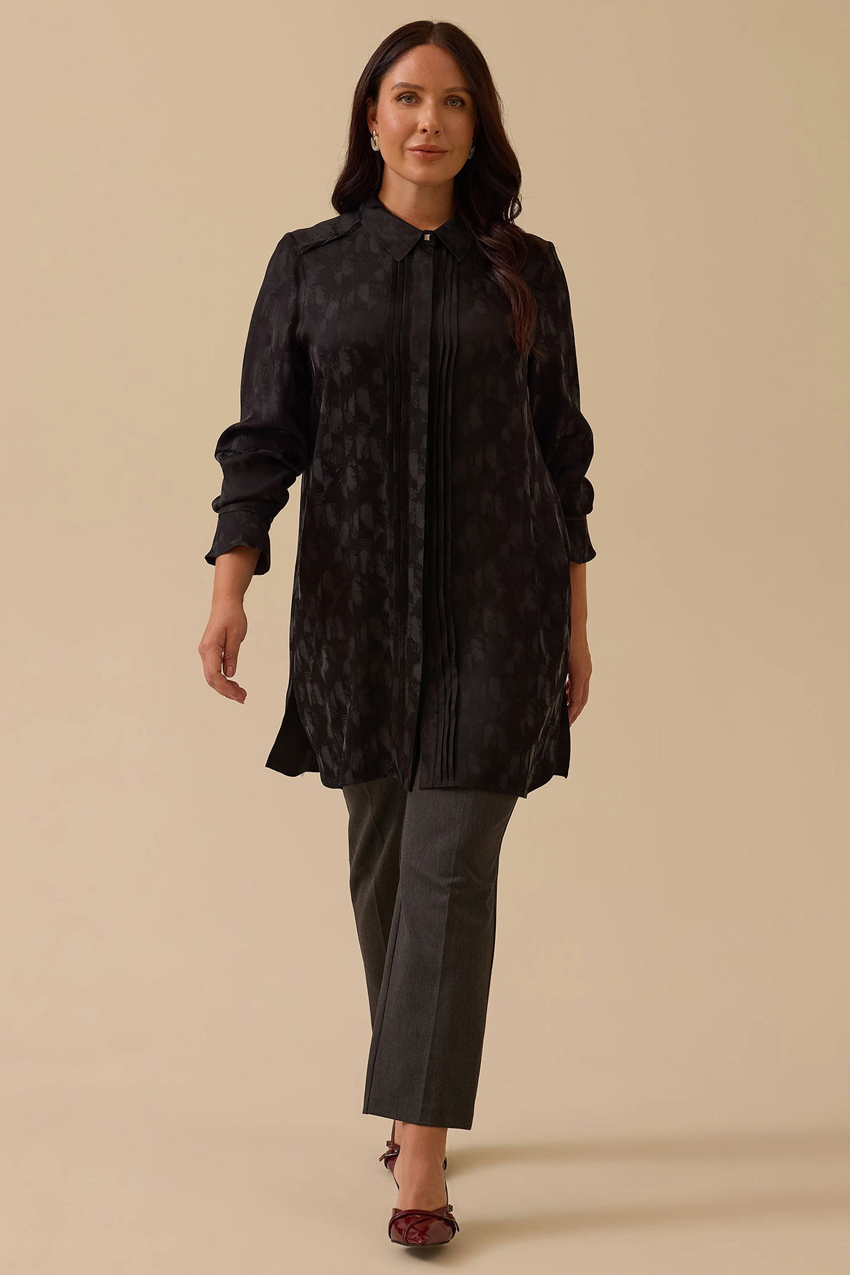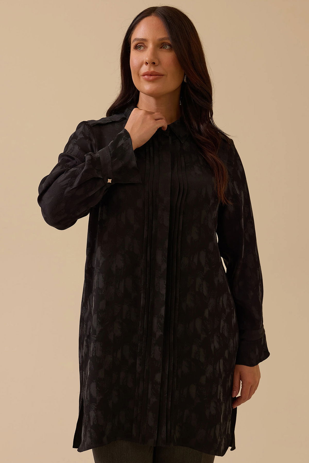 Detay: Çiçek desenli jakar dokuma kumaştan üretilmiş bu şık tunik, basen altı boyu ve normal bel kesimiyle zarif bir siluet sunuyor. Gömlek yaka ve takma kol detaylarıyla klasik şıklığı modern dokunuşlarla buluşturan model, uzun kol yapısı ve düğmeli kapama özelliğiyle hem estetik hem de pratik bir kullanım sağlıyor. Düğme aksesuarlarıyla zenginleştirilen bu tunik, özel günlerden günlük stilinize kadar her ortamda stil sahibi bir duruş sergilemenizi sağlar;