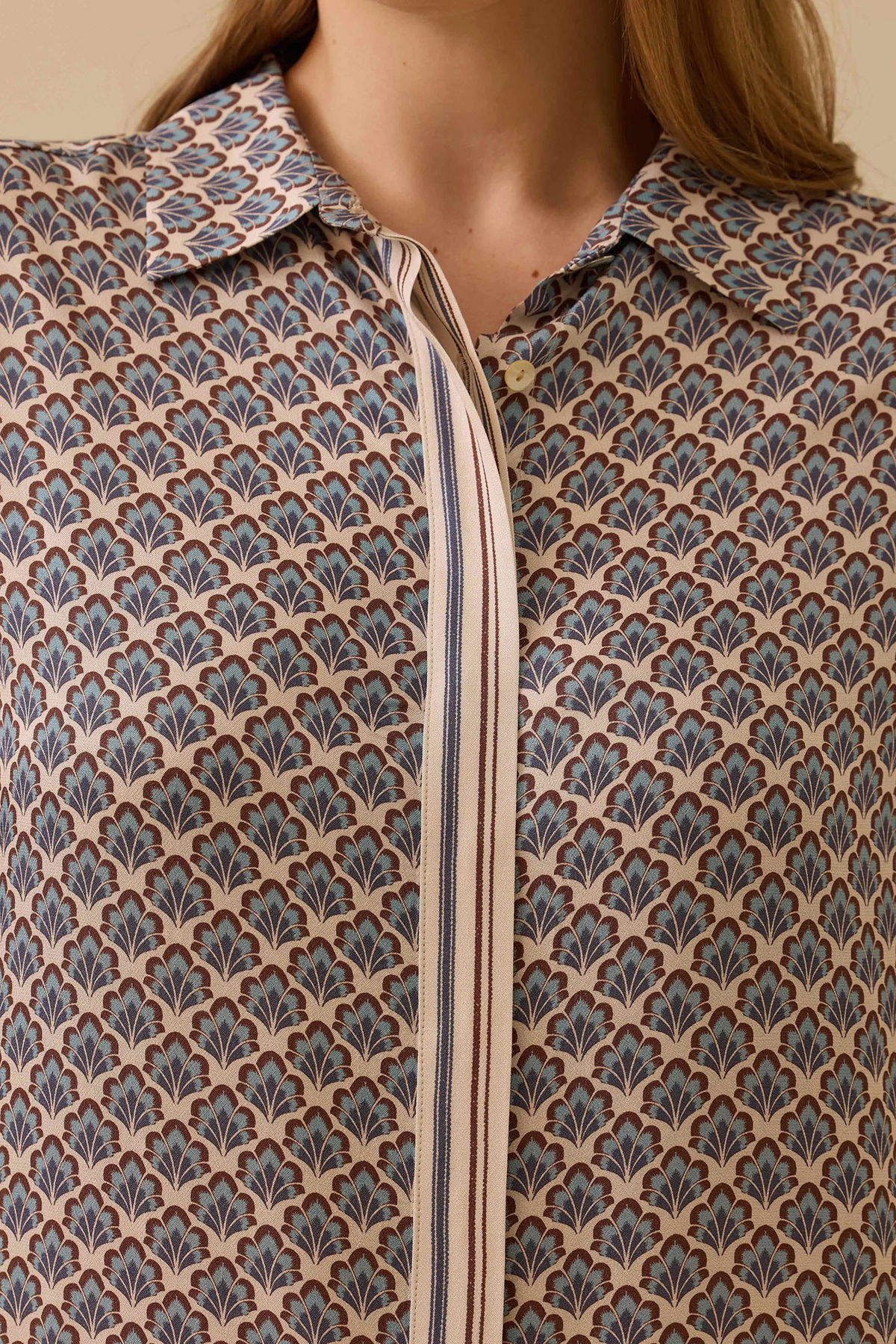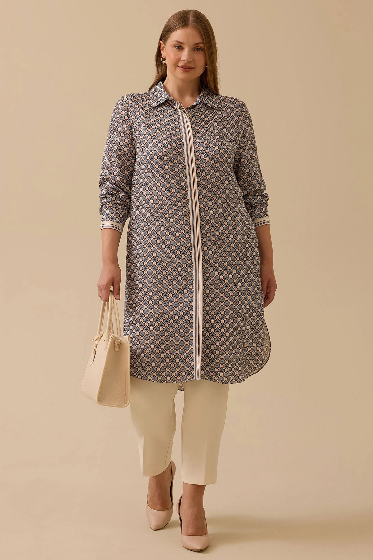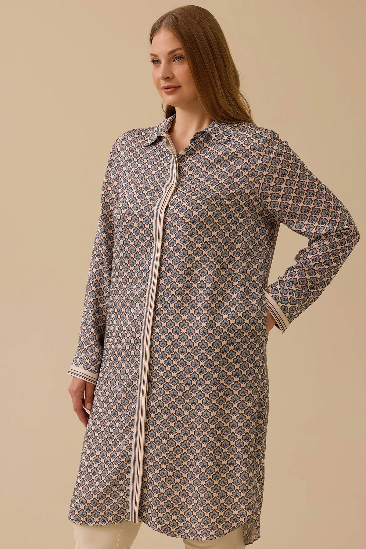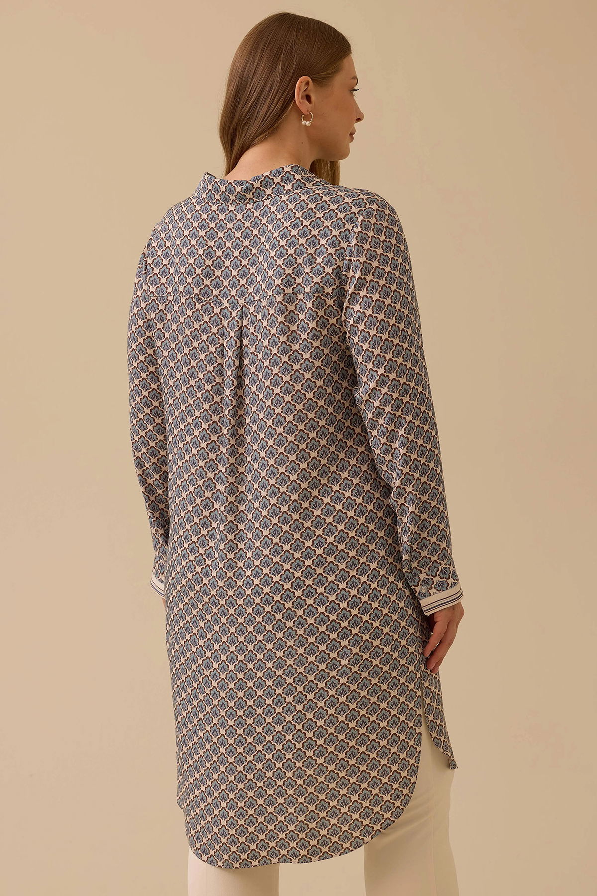 Detay: Retro desenli viskon dokuma kumaştan üretilmiş bu midi boy tunik, regular kesimiyle ofis stiline zarif bir dokunuş katıyor. Gömlek yaka ve takma kol detaylarıyla klasik şıklığı modern bir çizgiyle buluşturan model, uzun kol yapısı ve düğmeli kapama özelliğiyle hem estetik hem de pratik bir kullanım sunuyor. Düğme aksesuarlarıyla tamamlanan bu şık tunik, iş yaşamında stil sahibi bir görünüm arayanlar için ideal bir tercih oluyor;