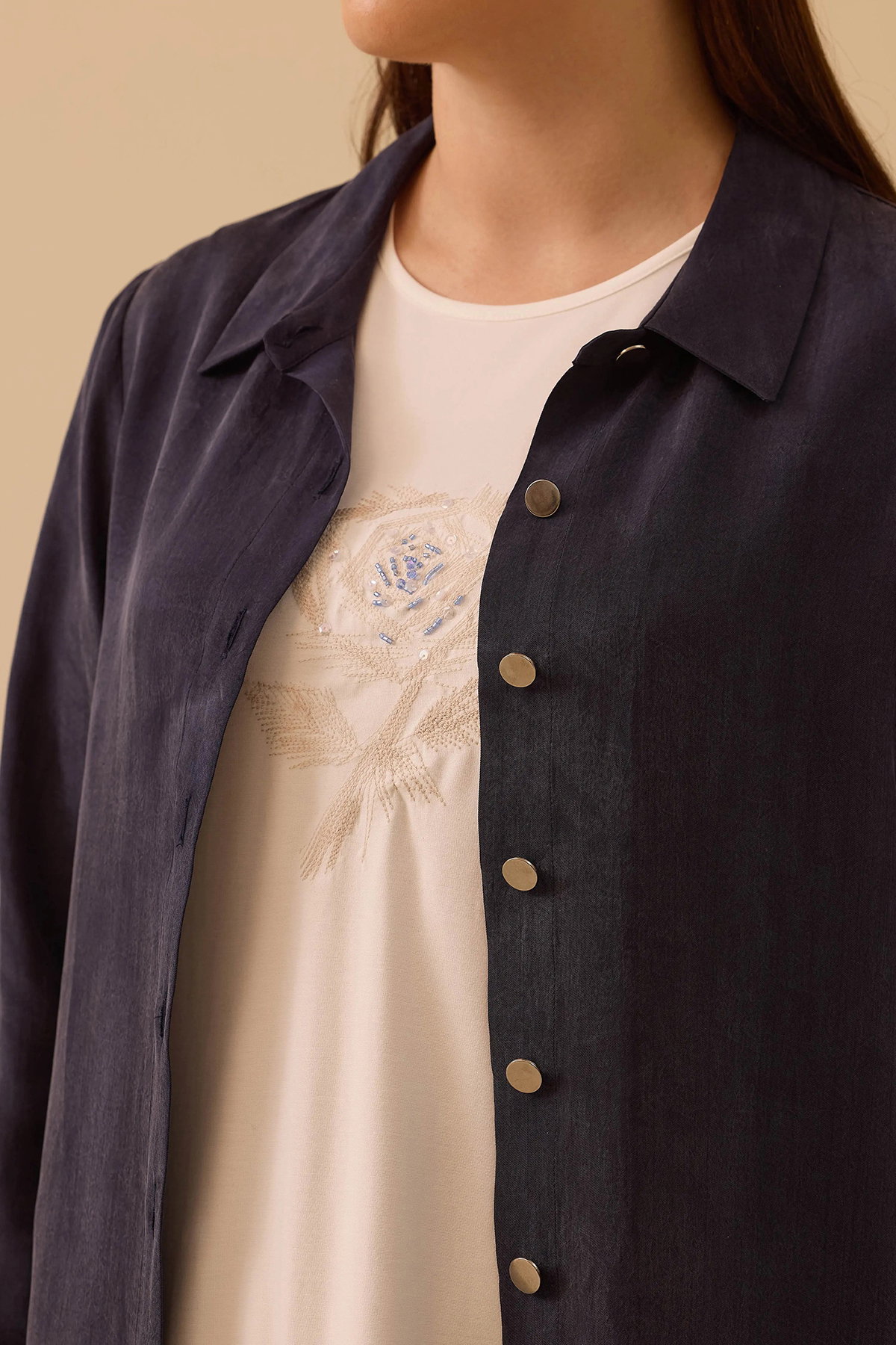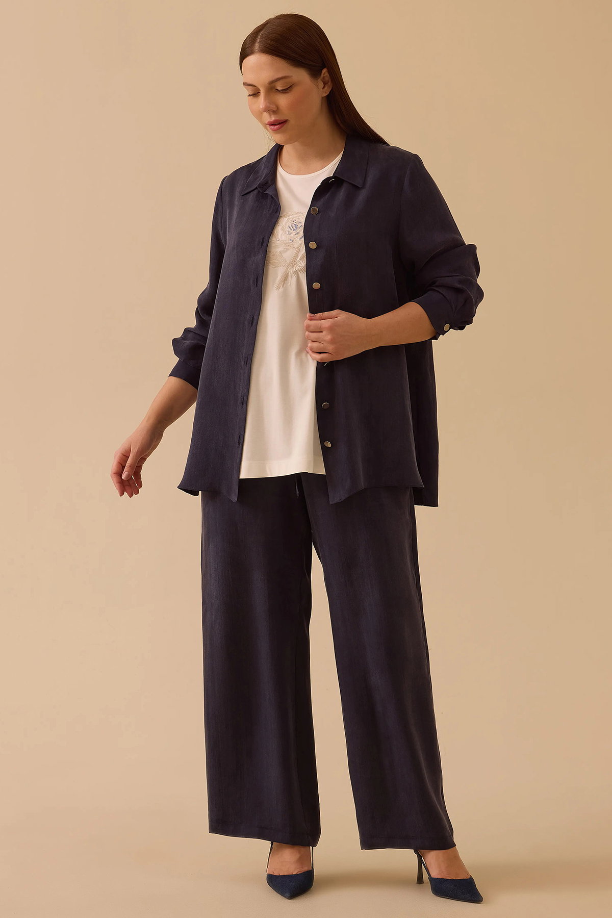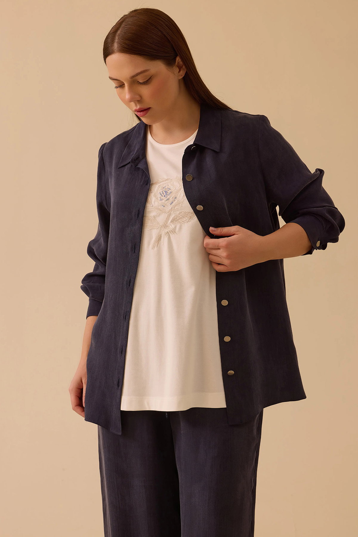 Detay: Lyocell karışımlı kumaştan dokuma, regular kesim, basen altı boy, normal bel, gömlek yaka, takma kol ve uzun kol detaylarıyla tasarlanmış bu gömlek sade ve modern bir şıklık sunuyor. Düz kumaş özelliği minimalist bir görünüm kazandırırken, gömlek yaka klasik bir duruş sağlıyor. Takma uzun kollar ise geleneksel gömlek formunu tamamlıyor. Regular kesim rahat bir kullanım sunarken, dokuma yapısı sayesinde hem günlük kombinlerde hem de iş ortamında çok yönlü bir tercih haline geliyor;