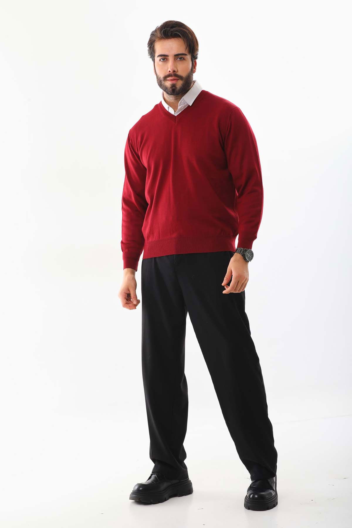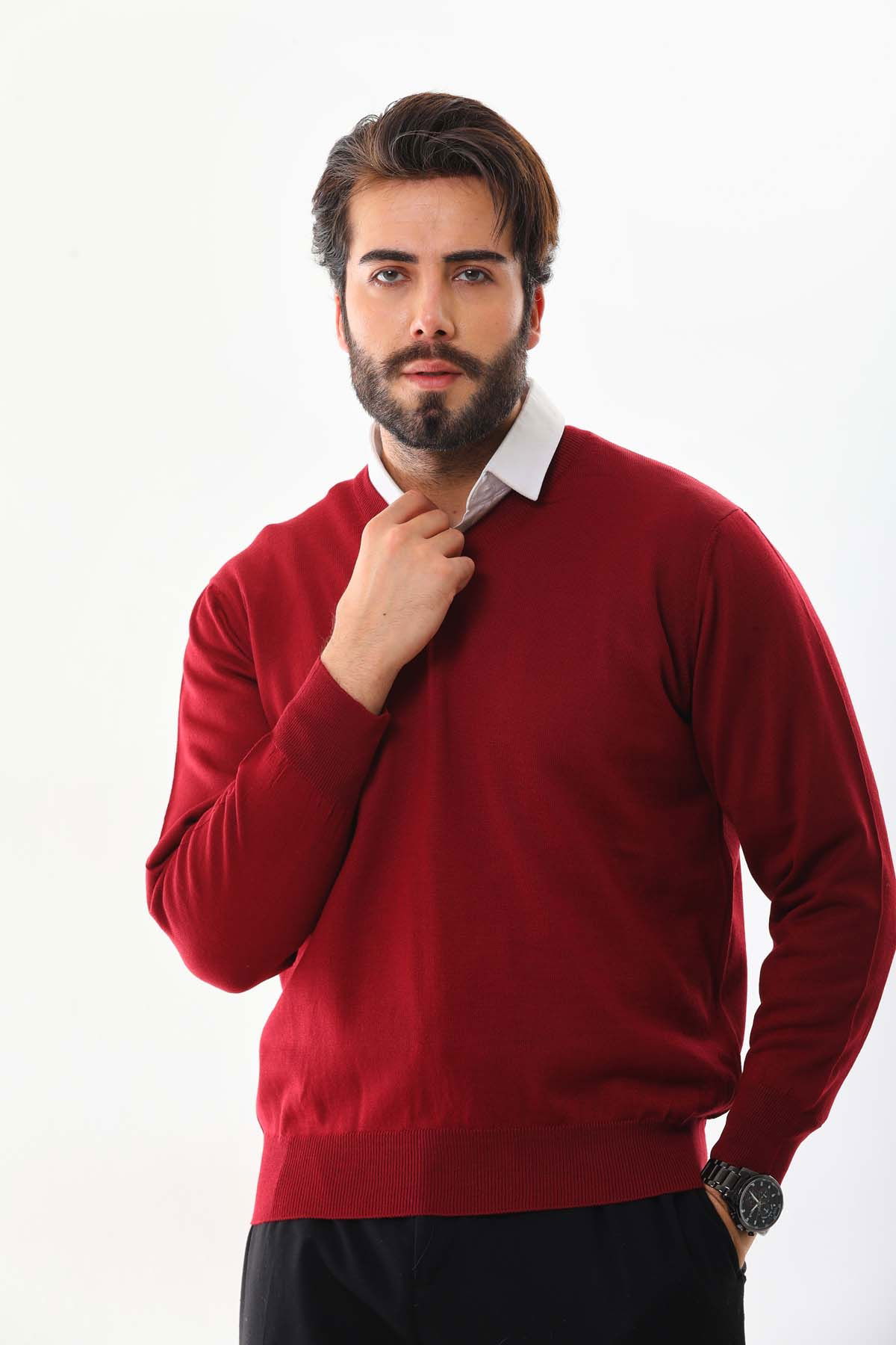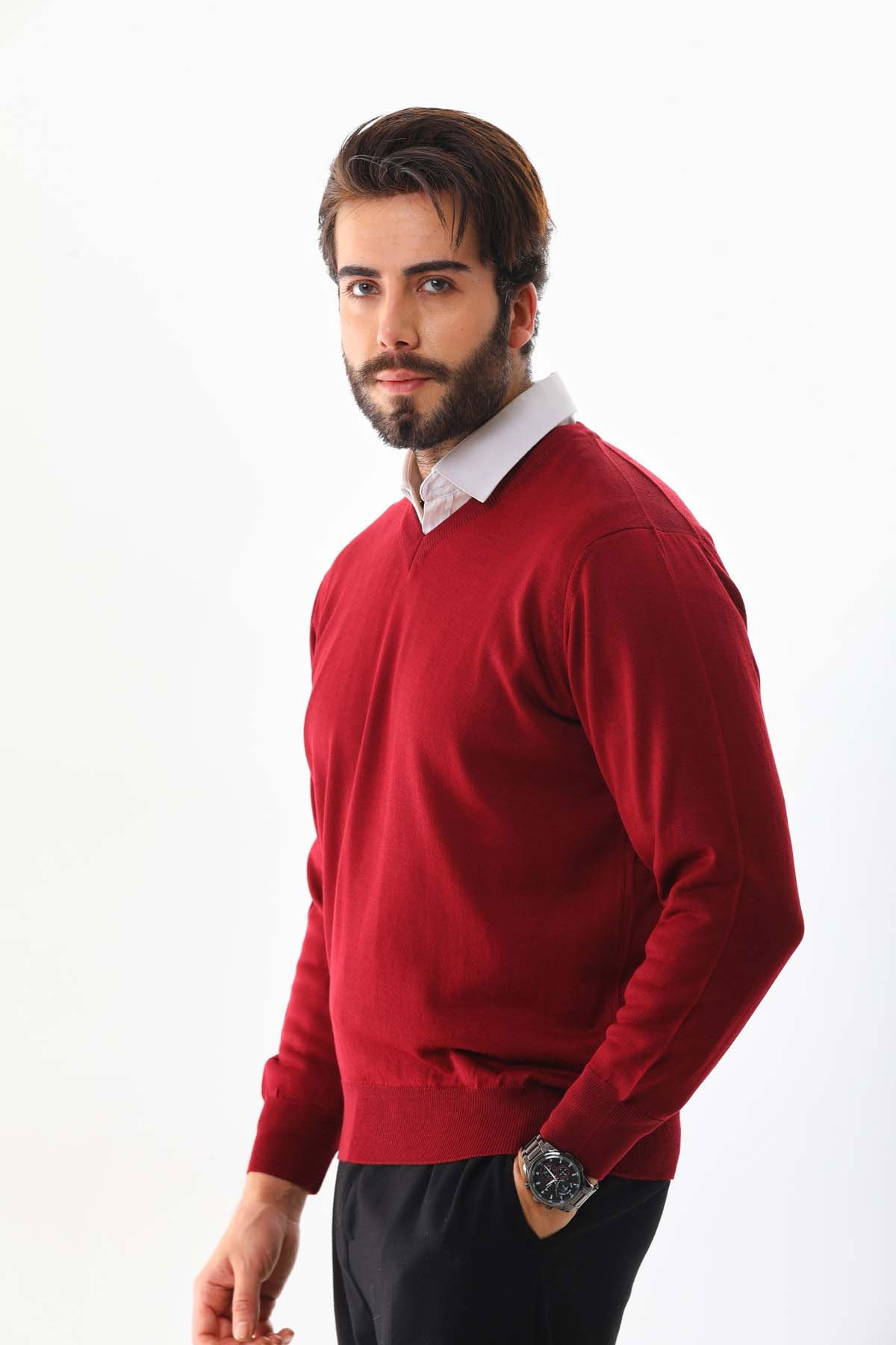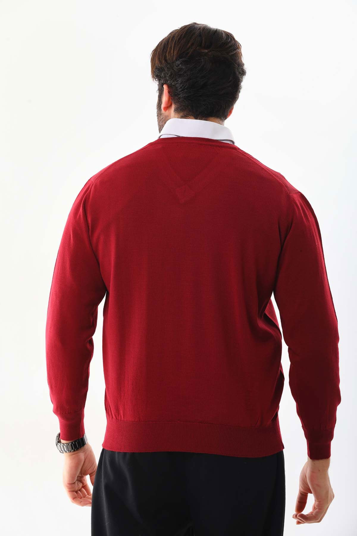Detay: V yaka, uzun kollu, yün kazak;