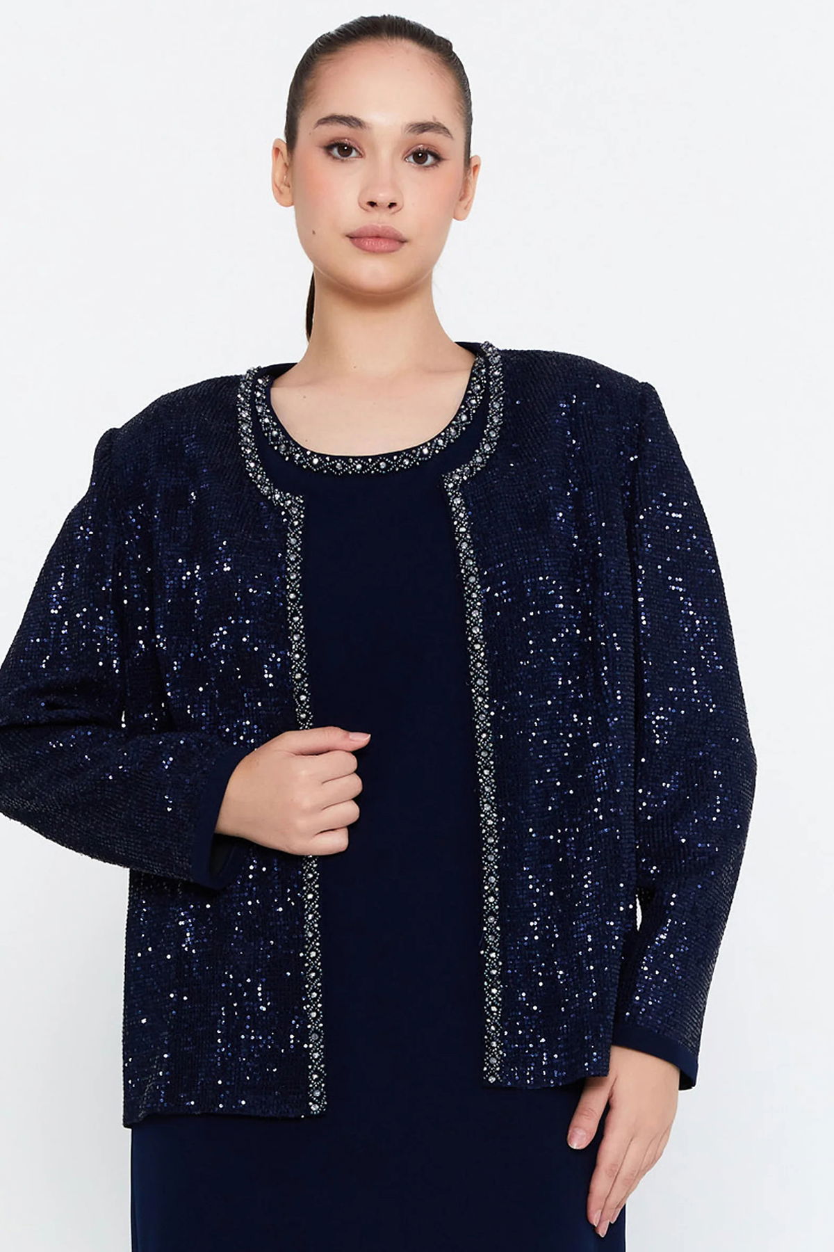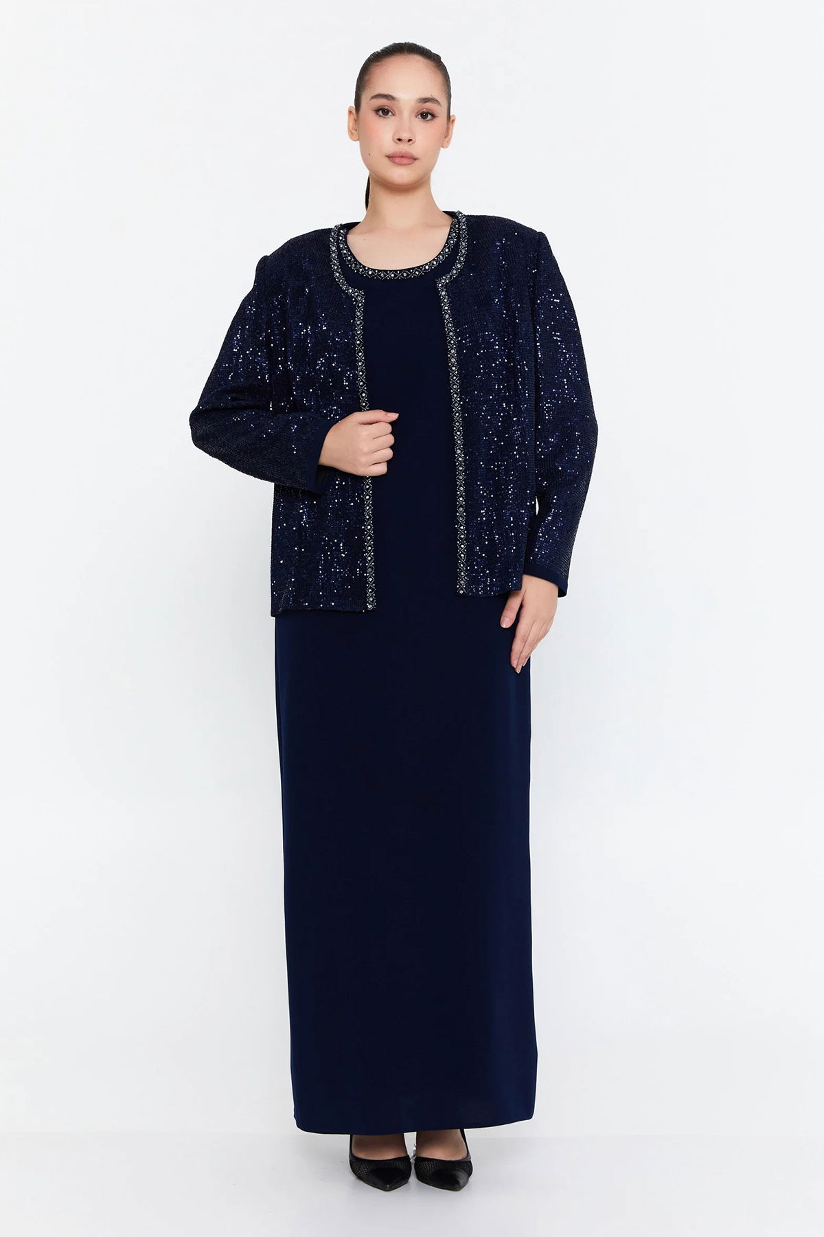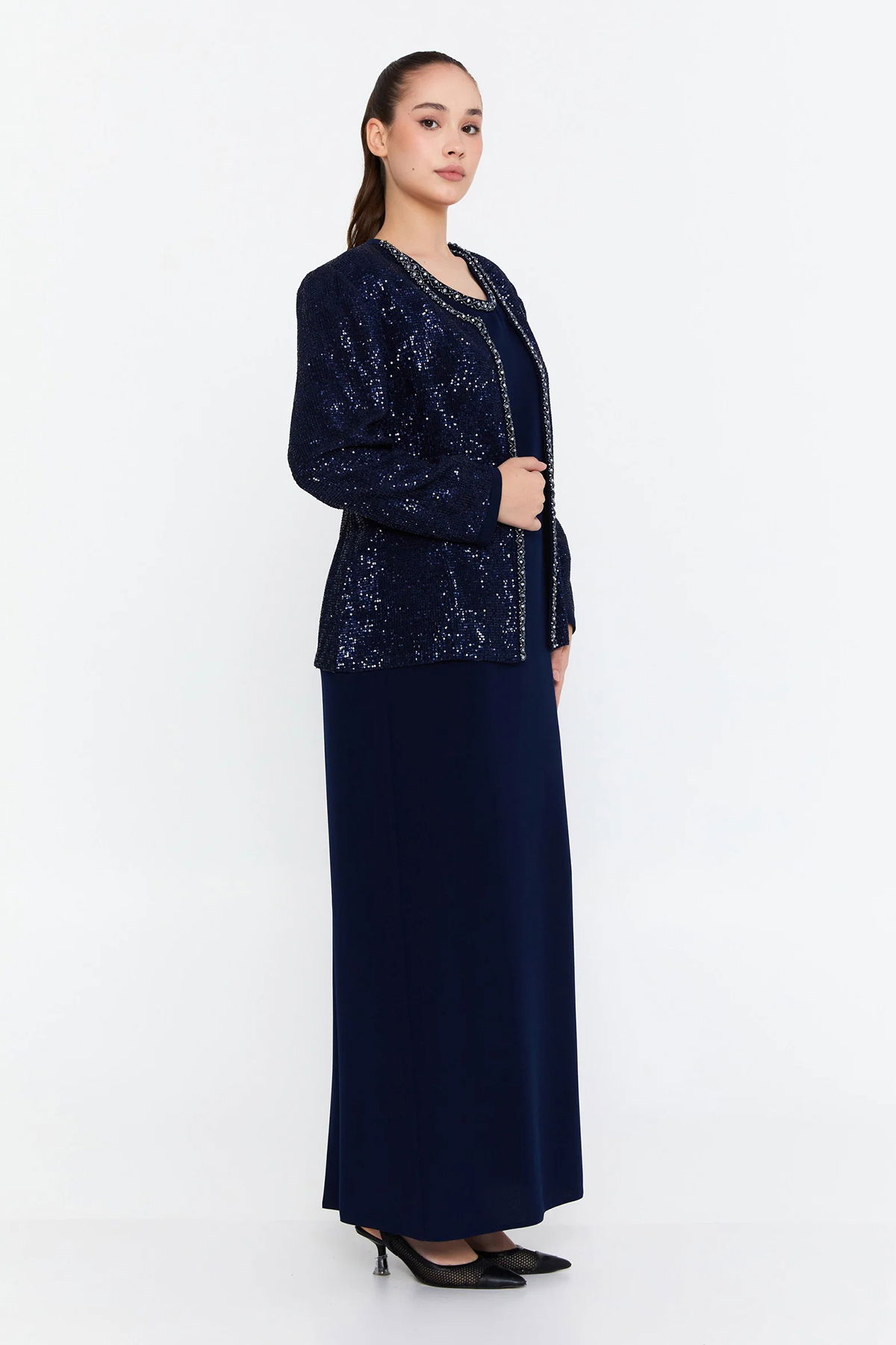 Detay: Yumuşak ve dökümlü viskon kumaşıyla tasarlanan bu uzun abiye takım, zarafeti ve konforu bir arada sunar. Elbise kısmı sade ve akıcı bir siluet oluştururken, taş detaylarla süslenmiş ceket tasarımı göz alıcı bir ışıltı katar. Özel davetlerde sofistike bir duruş sergilemek isteyenler için ideal olan bu iki parçalı takım, modern stilin zarafetle buluştuğu etkileyici bir seçenektir;