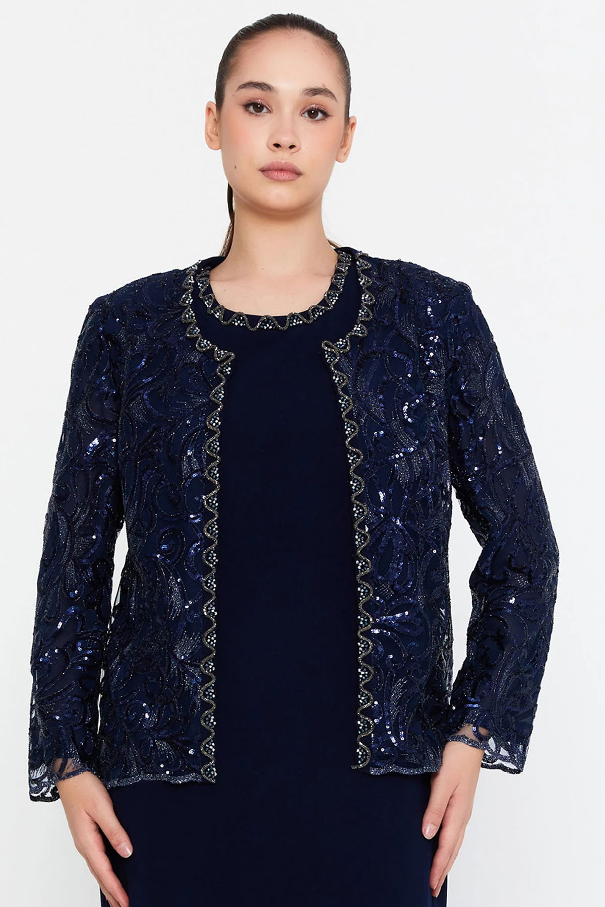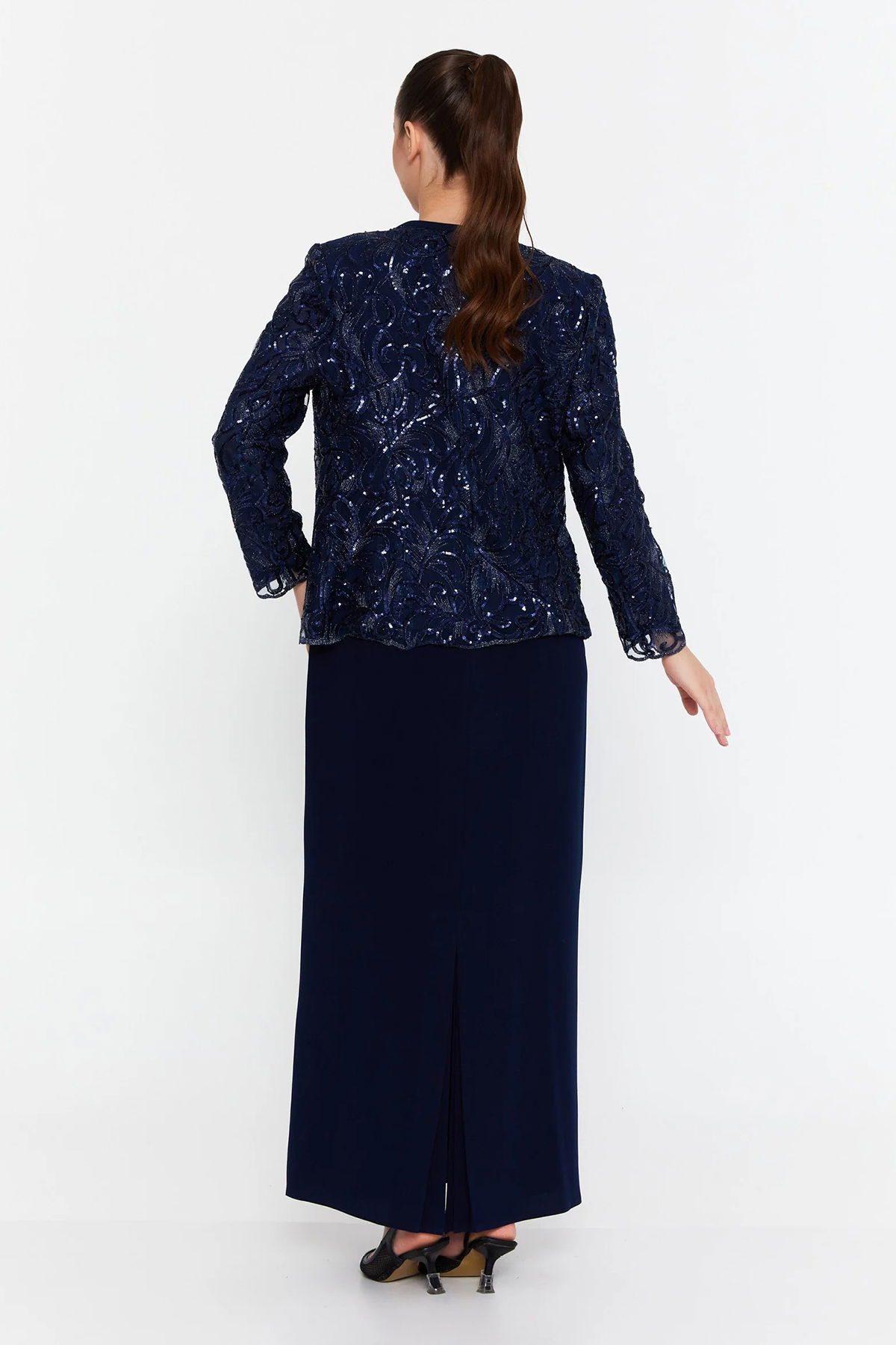 Güzelyalı Kadın Büyük Beden Taş İşlemeli Uzun Abiye Takım 1047 Lacivert