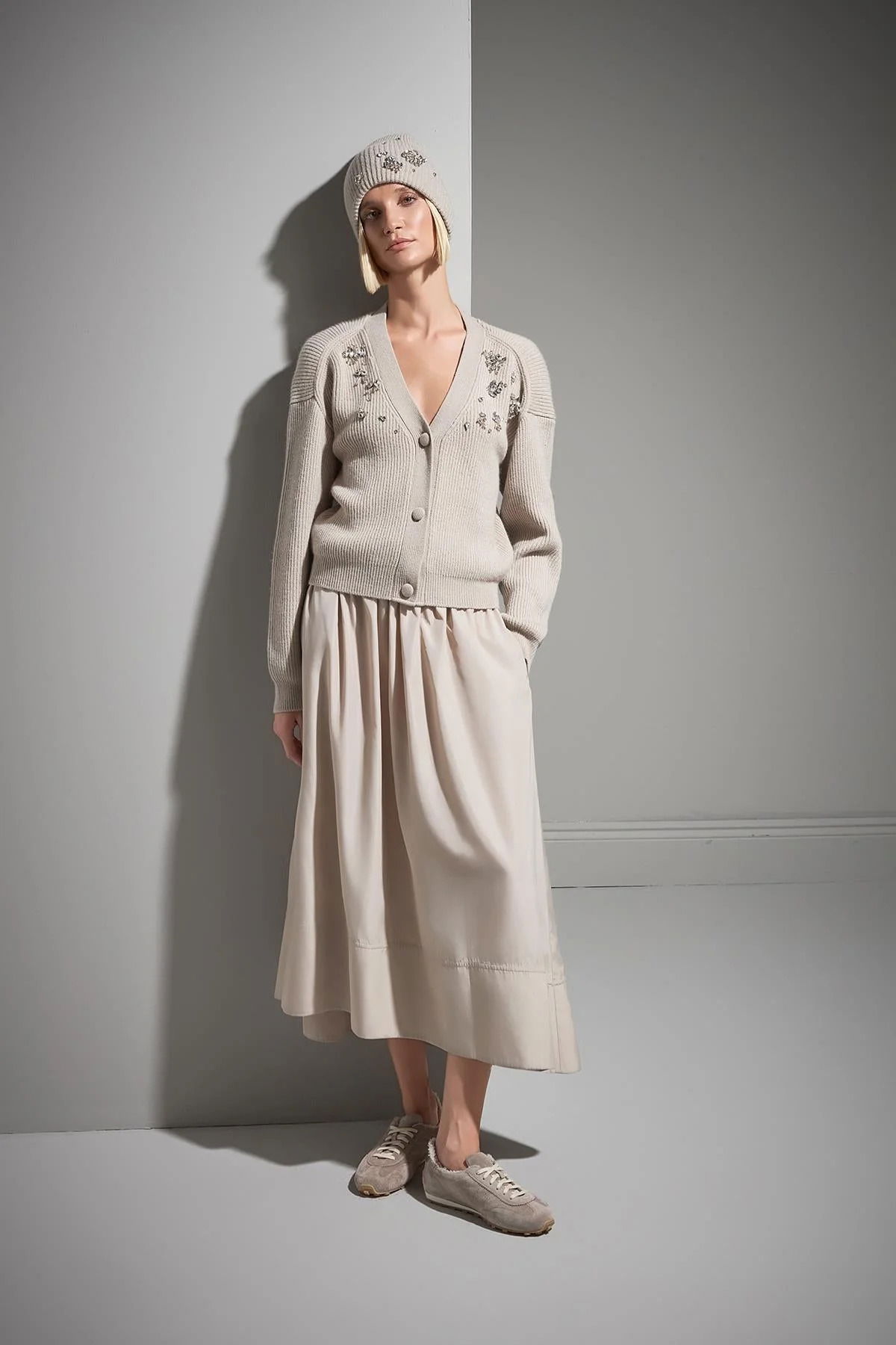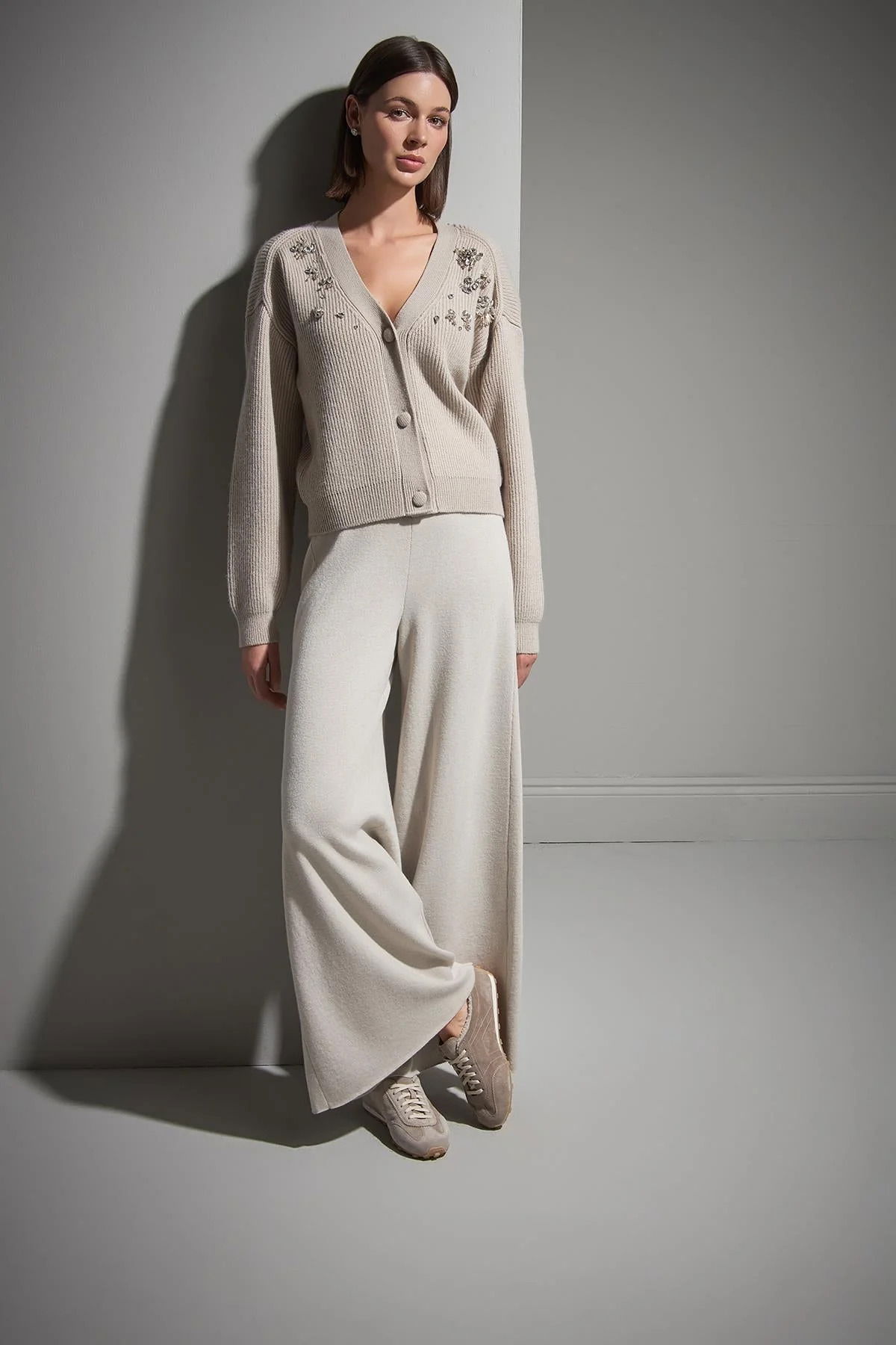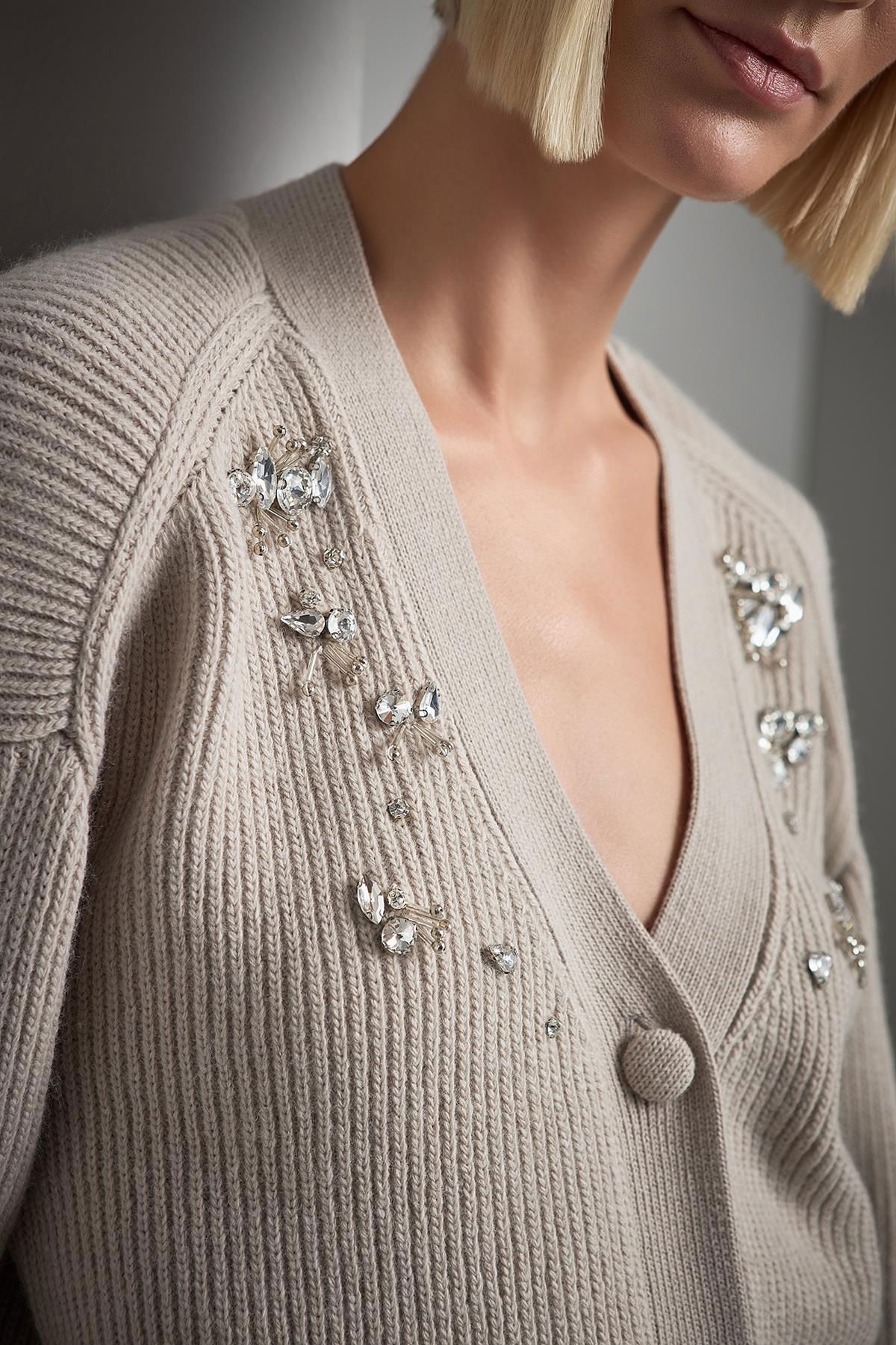 Detay: El işi taş işlemeli, uzun kollu triko hırka; tam kalıp yapısı ve V yaka tasarımıyla zarif bir görünüm sunarken, özel detaylarıyla stilinize sofistike bir dokunuş katar. Şıklığı ve konforu bir araya getiren bu hırka, her mevsim gardırobunuzun vazgeçilmezi olmaya aday;