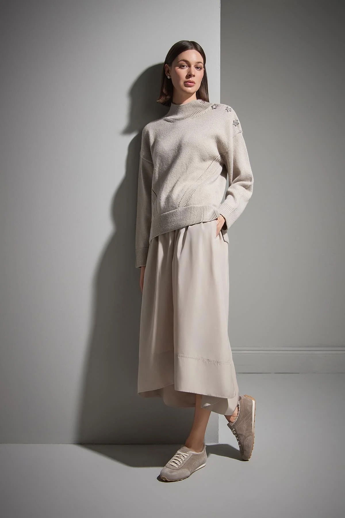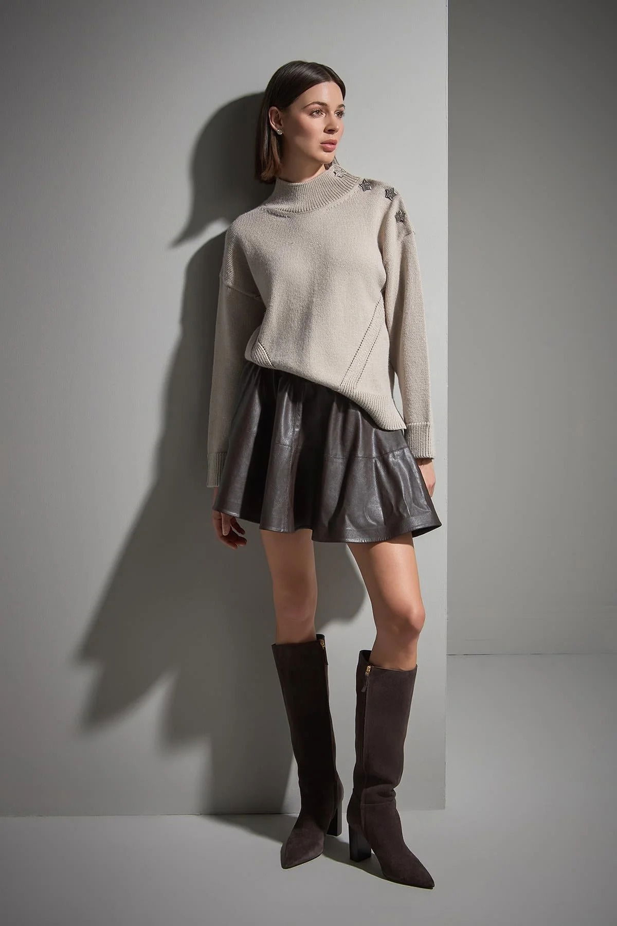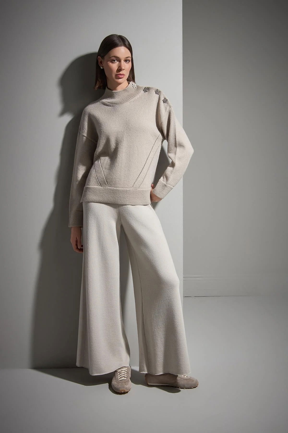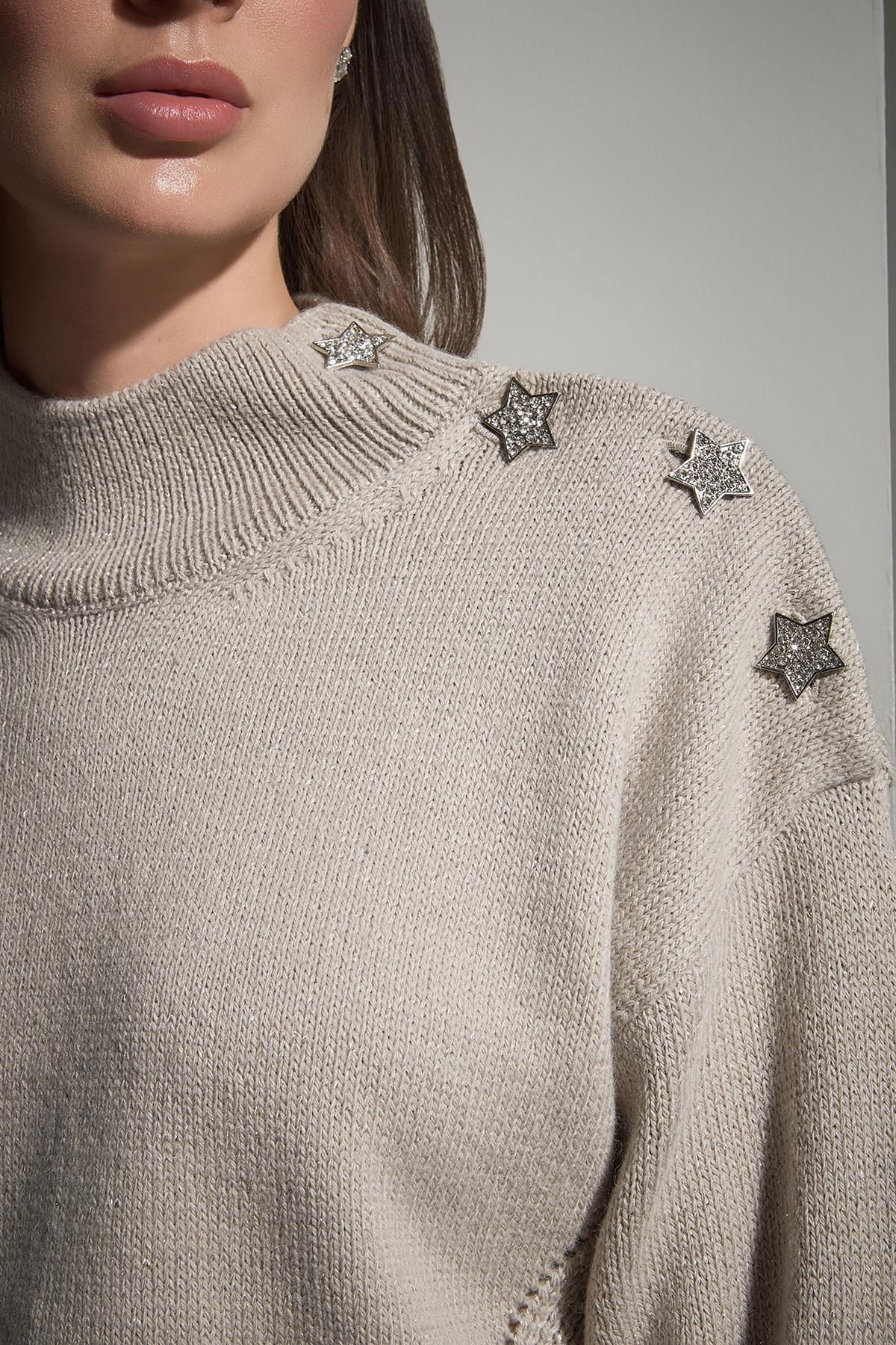 Detay: Yıldız düğme detaylı ve simli tasarımıyla öne çıkan uzun kollu triko kazak, dik yaka ve tam kalıp yapısıyla modern ve dikkat çekici bir stil sunar. Işıltılı dokusuyla günlük kombinlere zarafet ve dinamizm katmak isteyenler için ideal bir tercihtir;