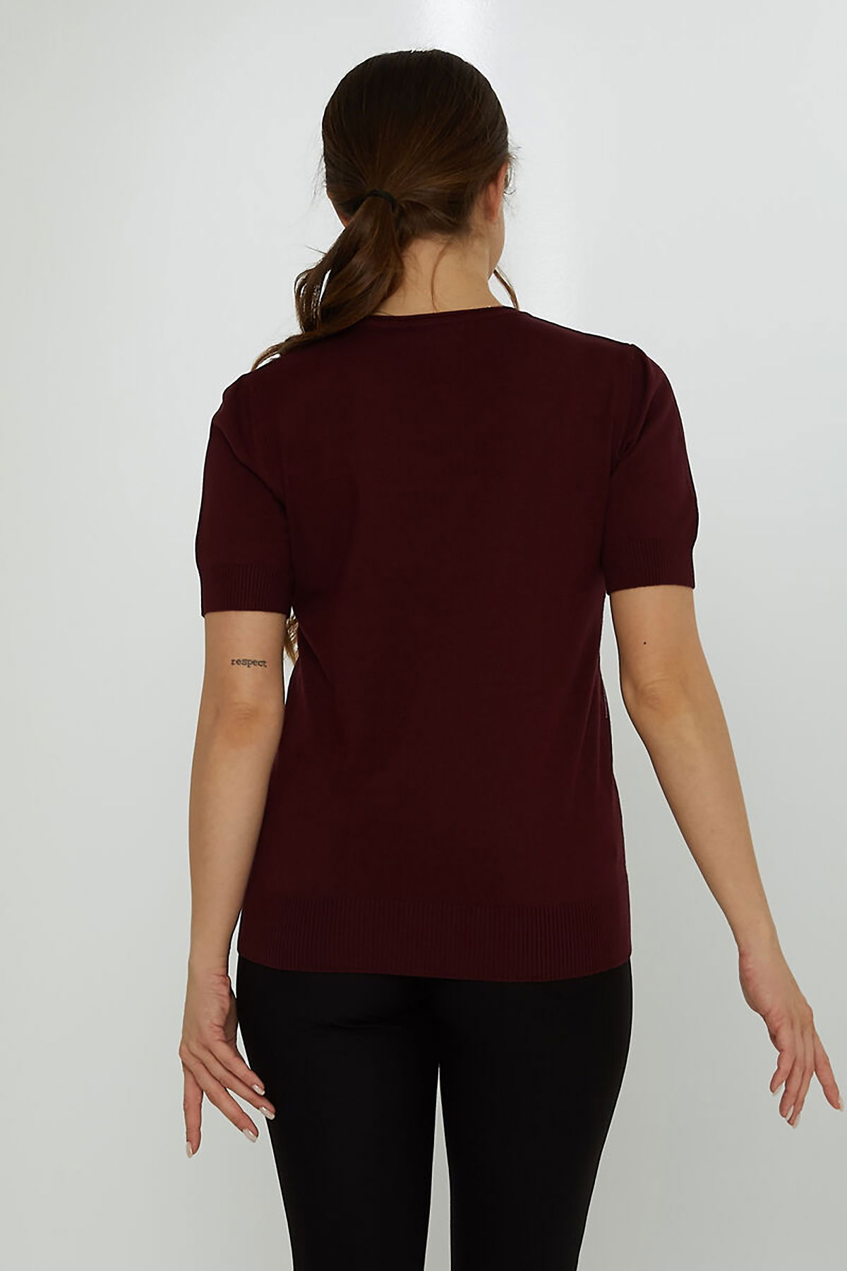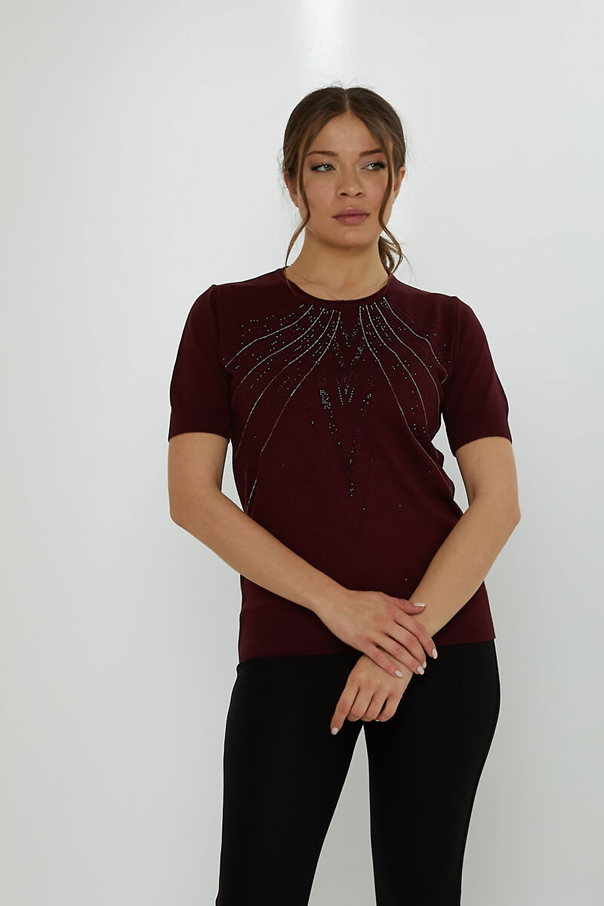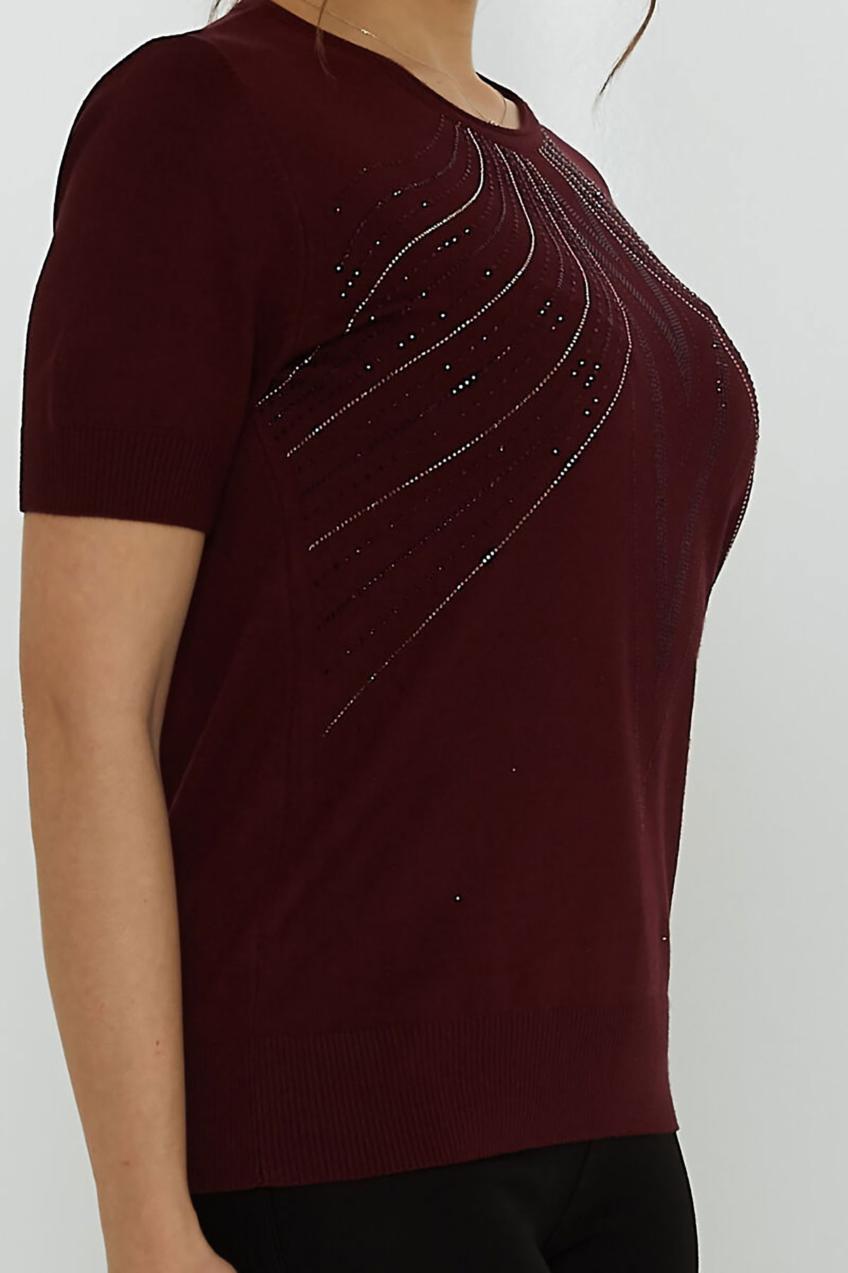 Kazee Kadın Taş Süslemeli Kısa Kollu Triko Kazak 31726 Mürdüm