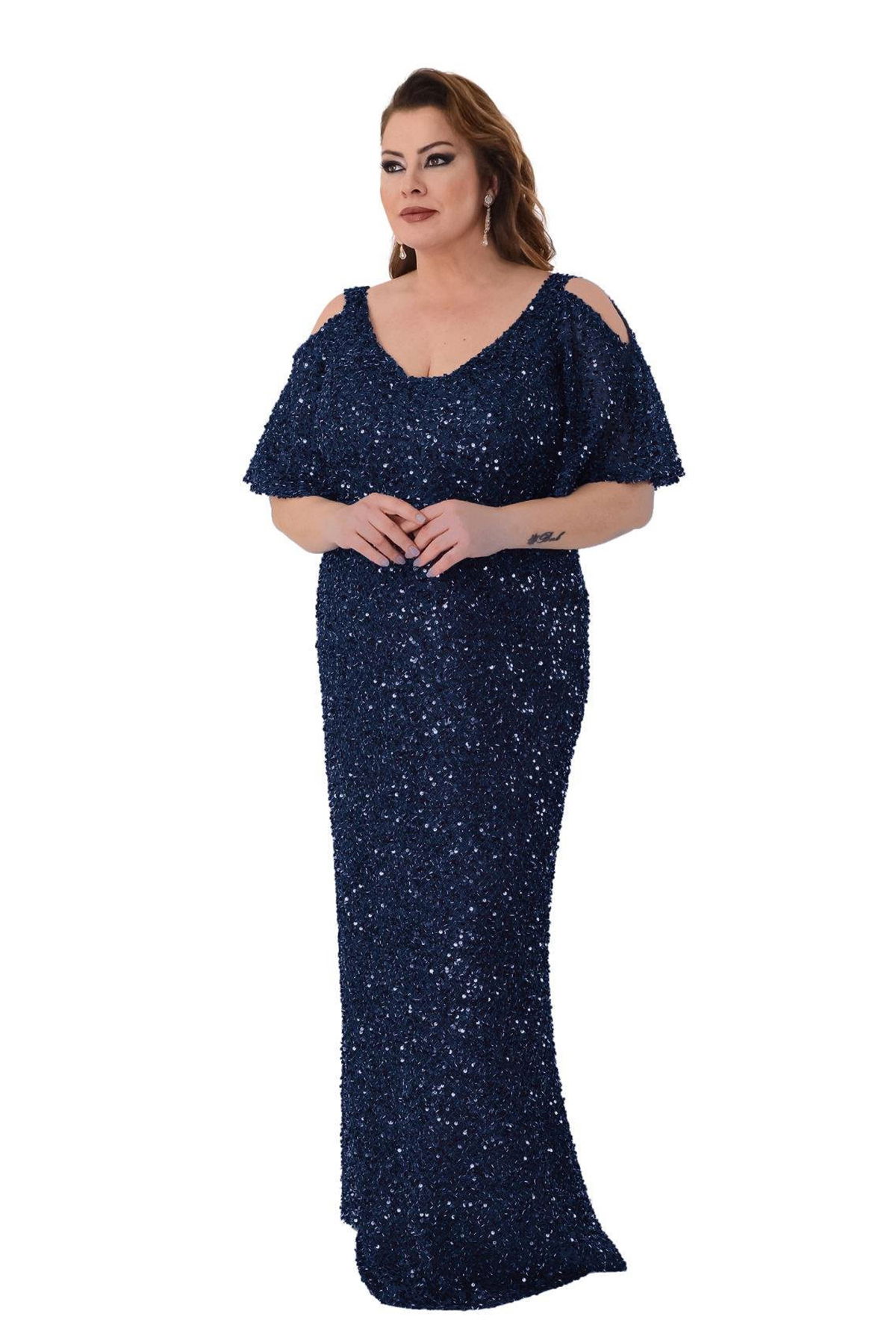 Lilas XXL Kadın Büyük Beden Full Pul Payet İşlemeli Yarım Kol Maxi Boy Abiye Elbise 2530 Lacivert