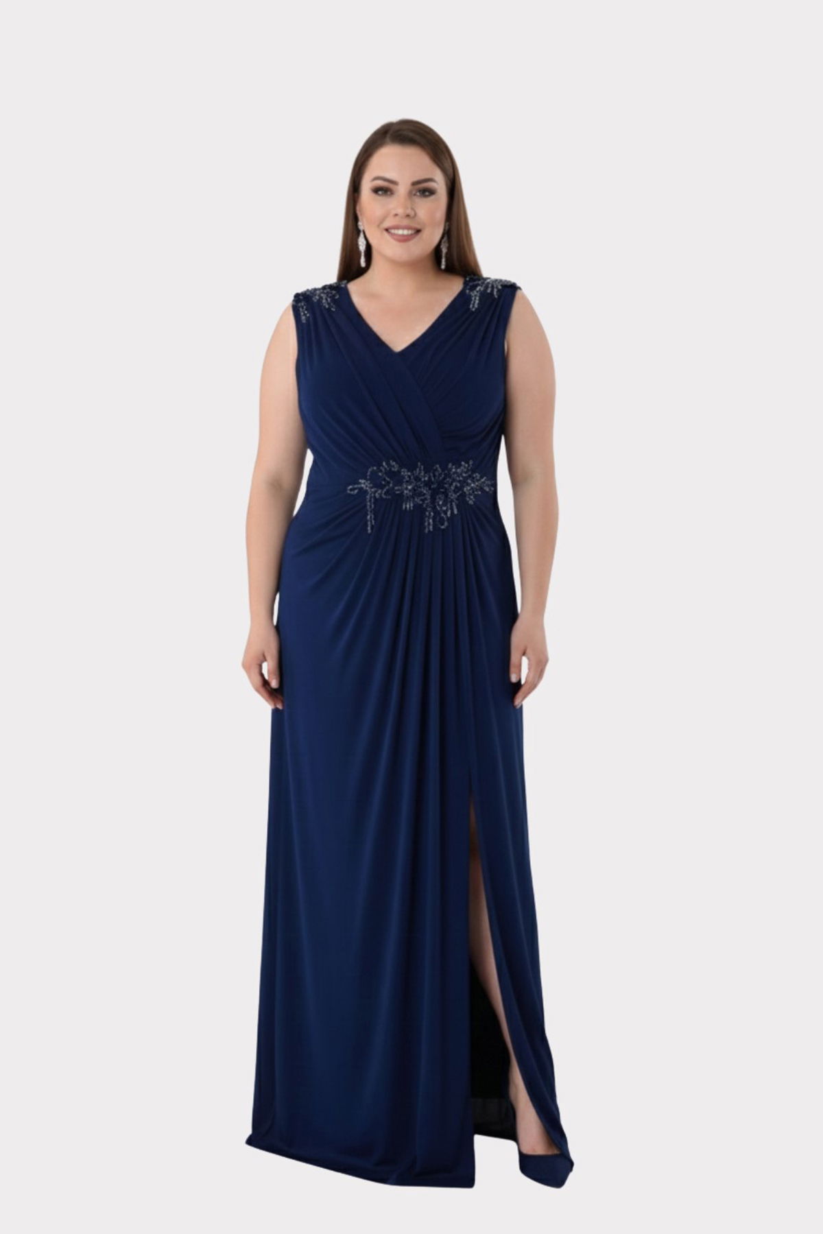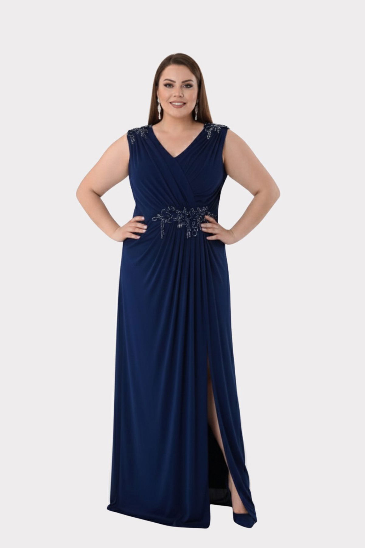 Detay: Büyük beden omuz ve bel taş detaylı geniş askılı uzun abiye elbise, şifon kumaşıyla zarif bir duruş sergilerken konforu da ön planda tutar. V yaka ve yırtmaçlı tasarımı feminen bir şıklık sunarken, drapeli yapısı, bel ve omuzdaki aplike üzerine taş süslemeler göz alıcı bir ışıltı katar. Kolsuz ve kalın askılı formu, astarlı ve fermuarlı yapısıyla özel davetlerde elegan bir tercih haline gelir;