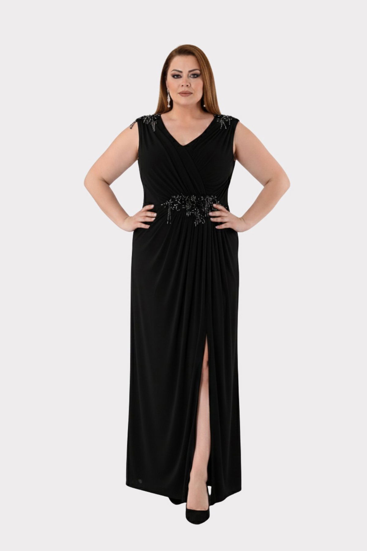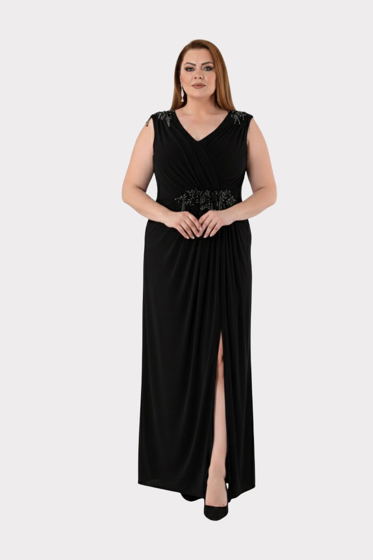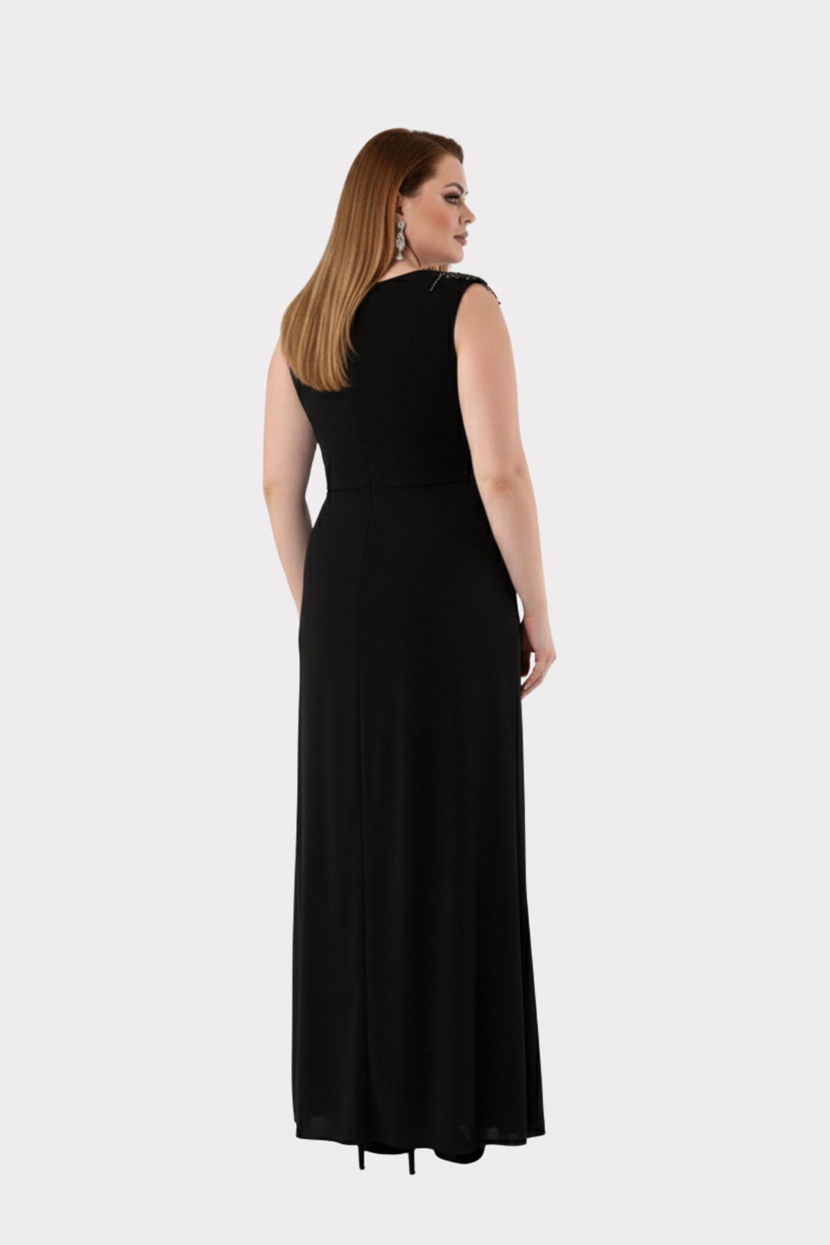 Lilas XXL Kadın Büyük Beden Omuz ve Bel Taş Detaylı Geniş Askılı Uzun Abiye Elbise 2510 Siyah