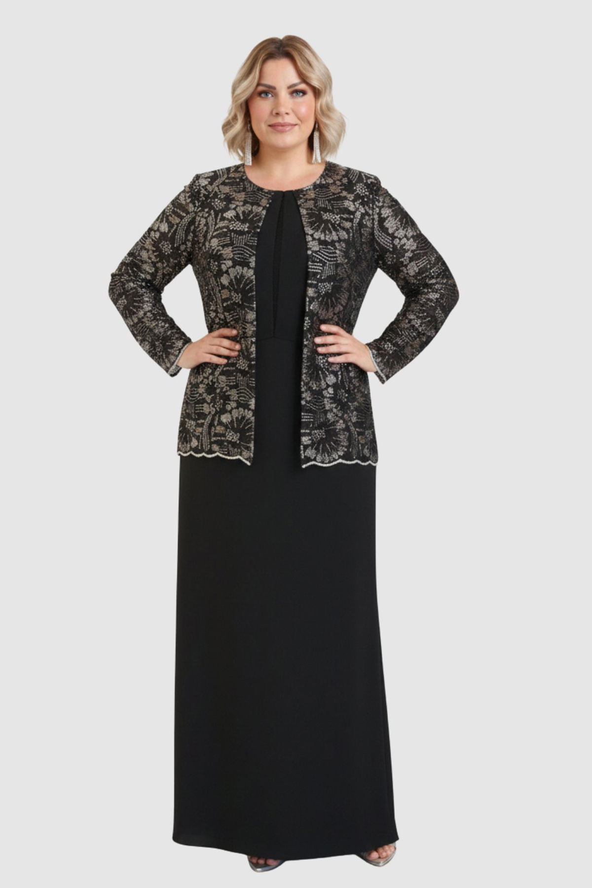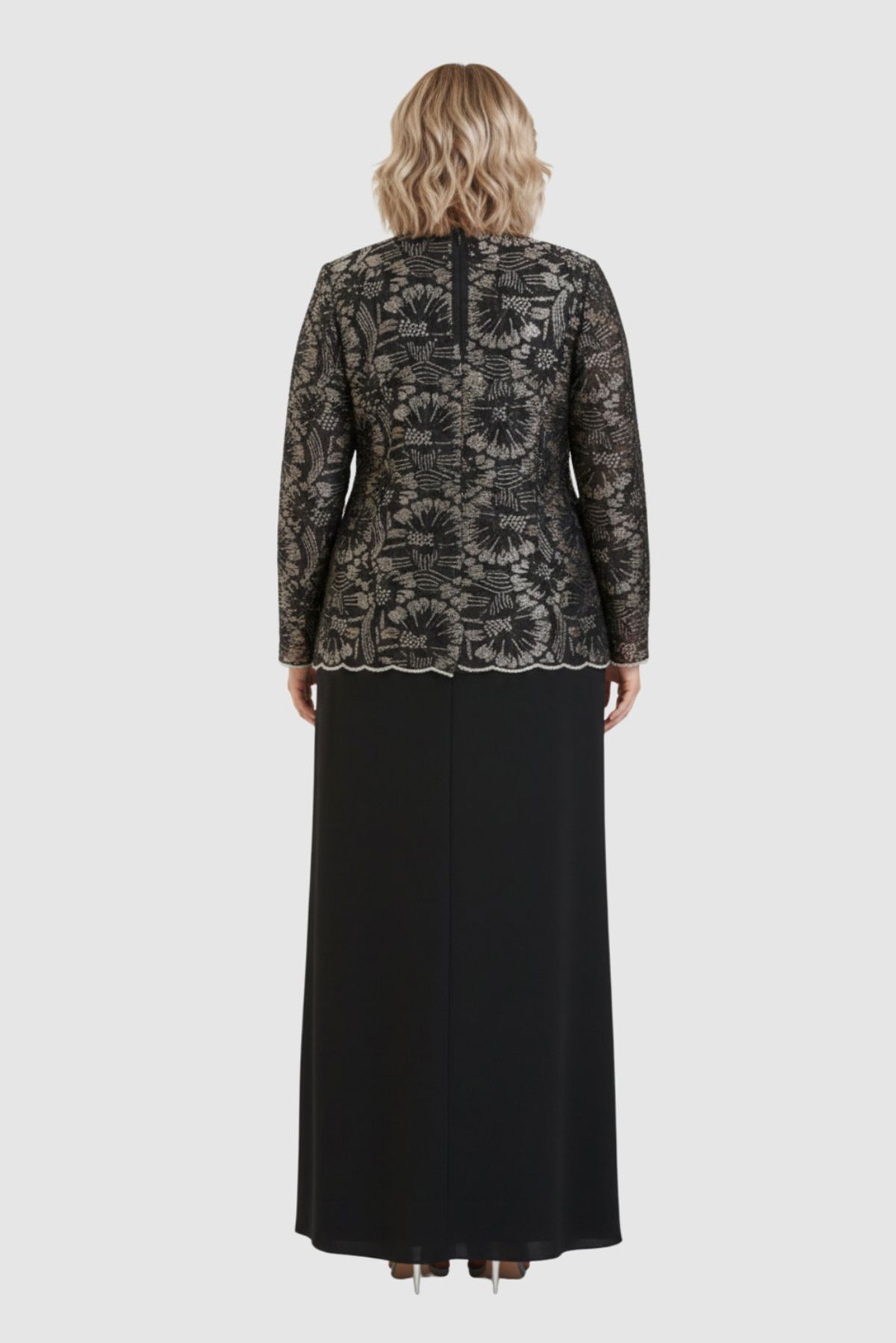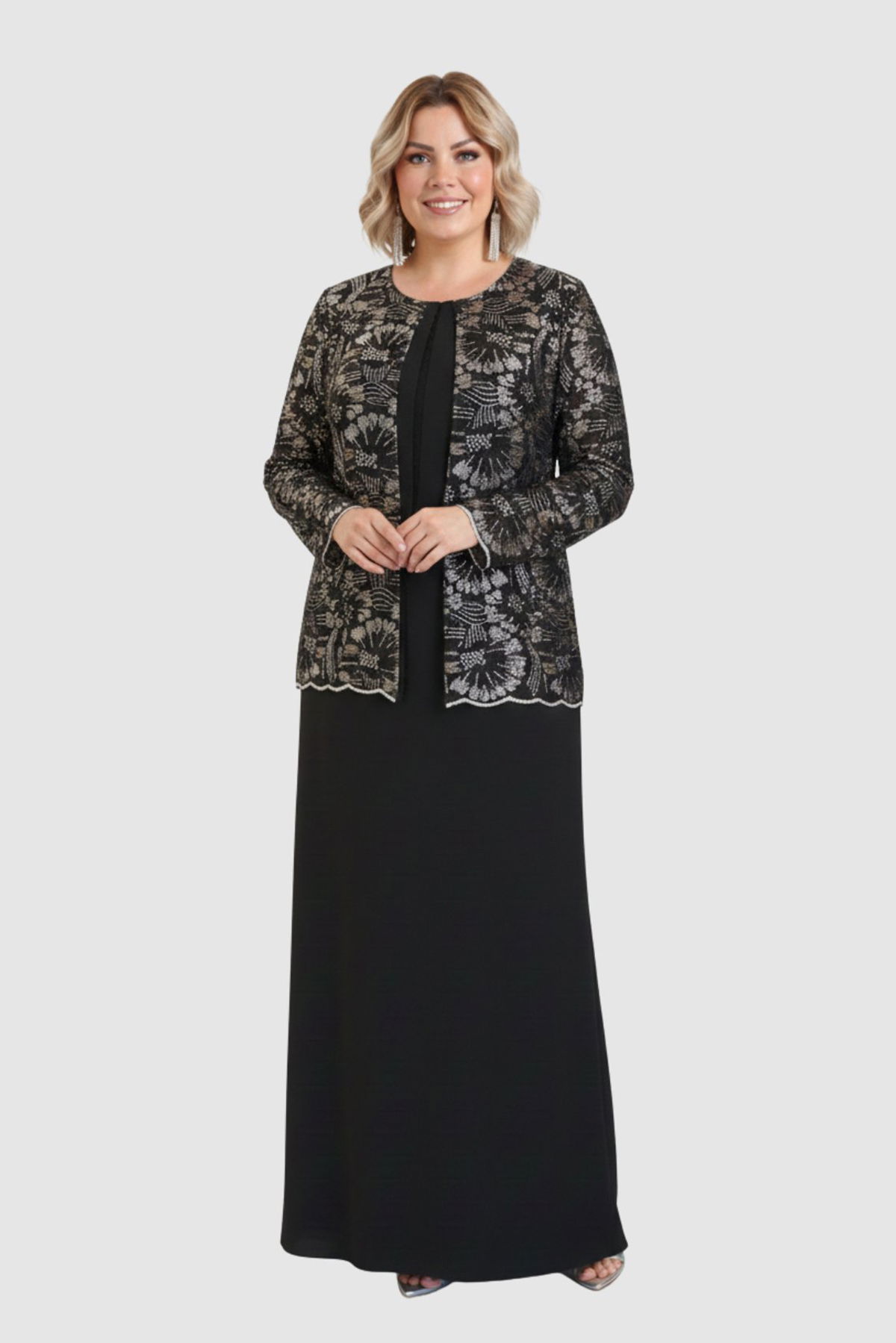 Lilas XXL Kadın Büyük Beden Sabit Ceket Detaylı Krep Kumaş Uzun Abiye Elbise 2605 Siyah