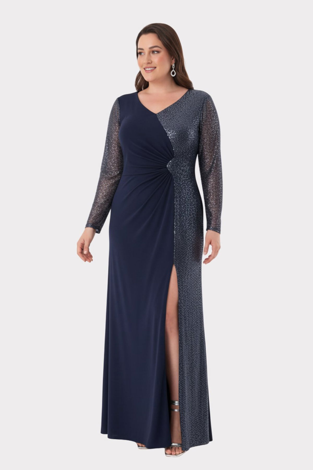 Detay: Büyük beden V yaka taş detaylı uzun abiye elbise, likralı kumaşıyla hem şıklığı hem de rahatlığı bir arada sunar. Uzun kollu ve yırtmaçlı tasarımı, belden drapeli formuyla zarif bir siluet oluştururken; kollar ve bedenin yarısındaki taş işlemeler göz alıcı bir ışıltı katar. Astarlı ve fermuarlı yapısı sayesinde özel davetlerde elegan ve konforlu bir tercih haline gelir;