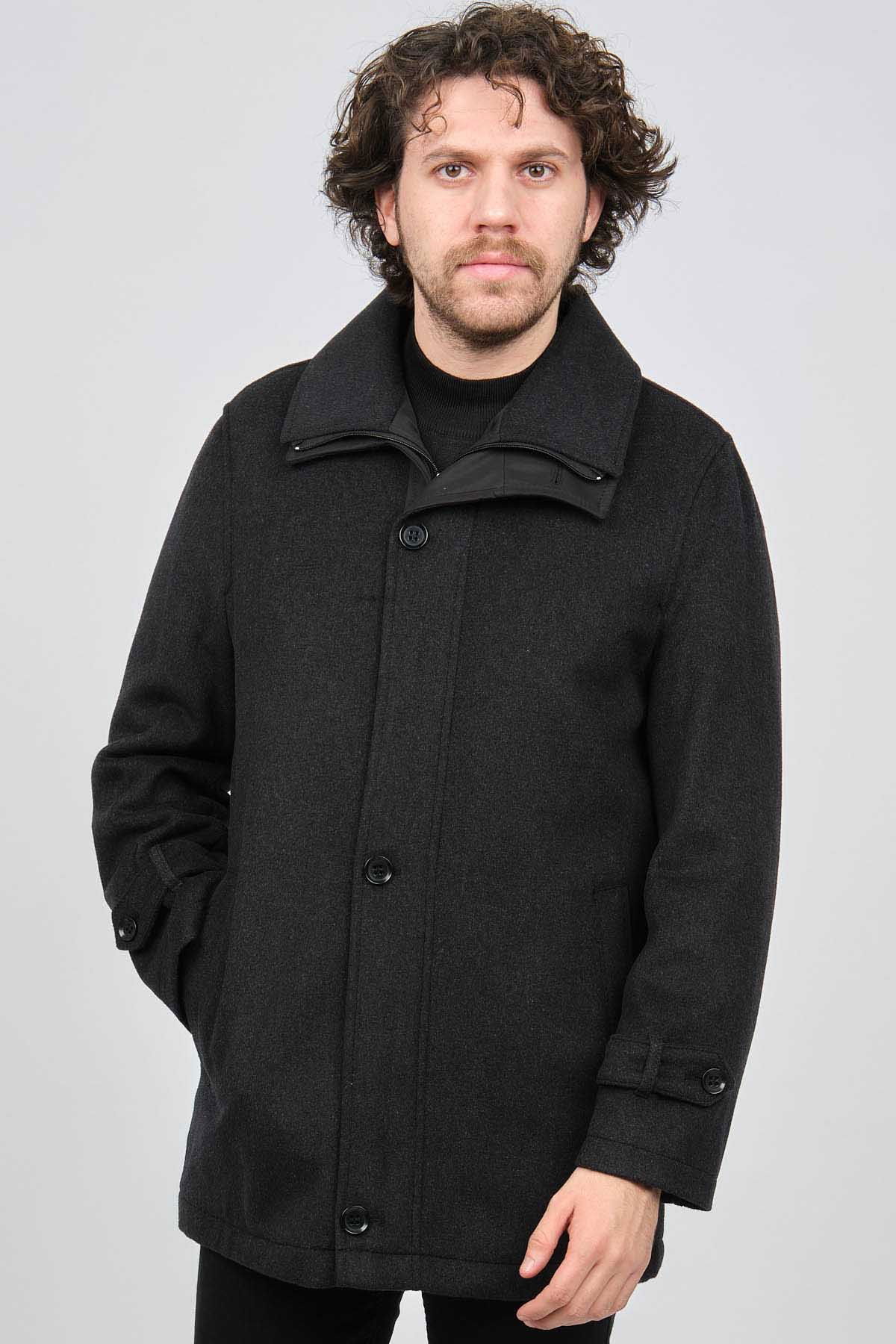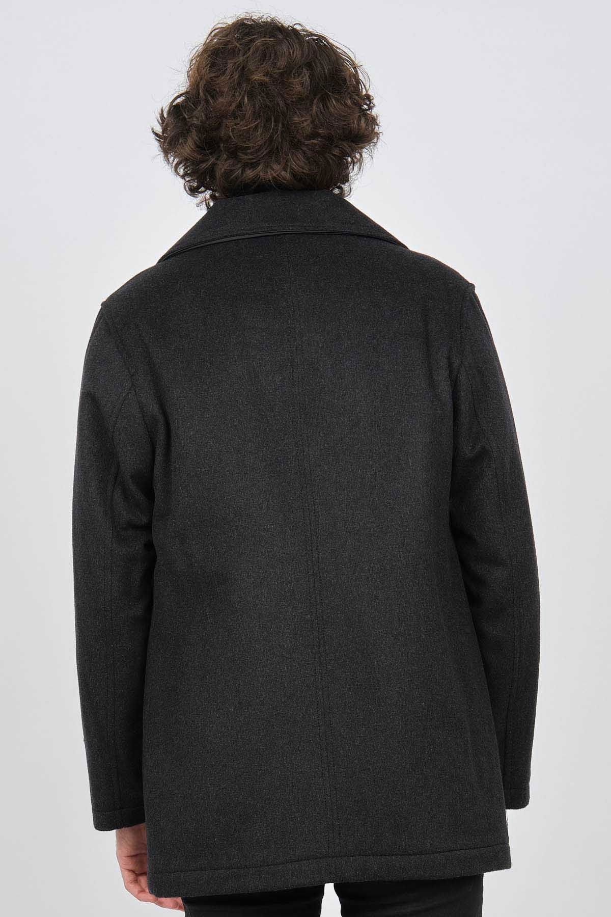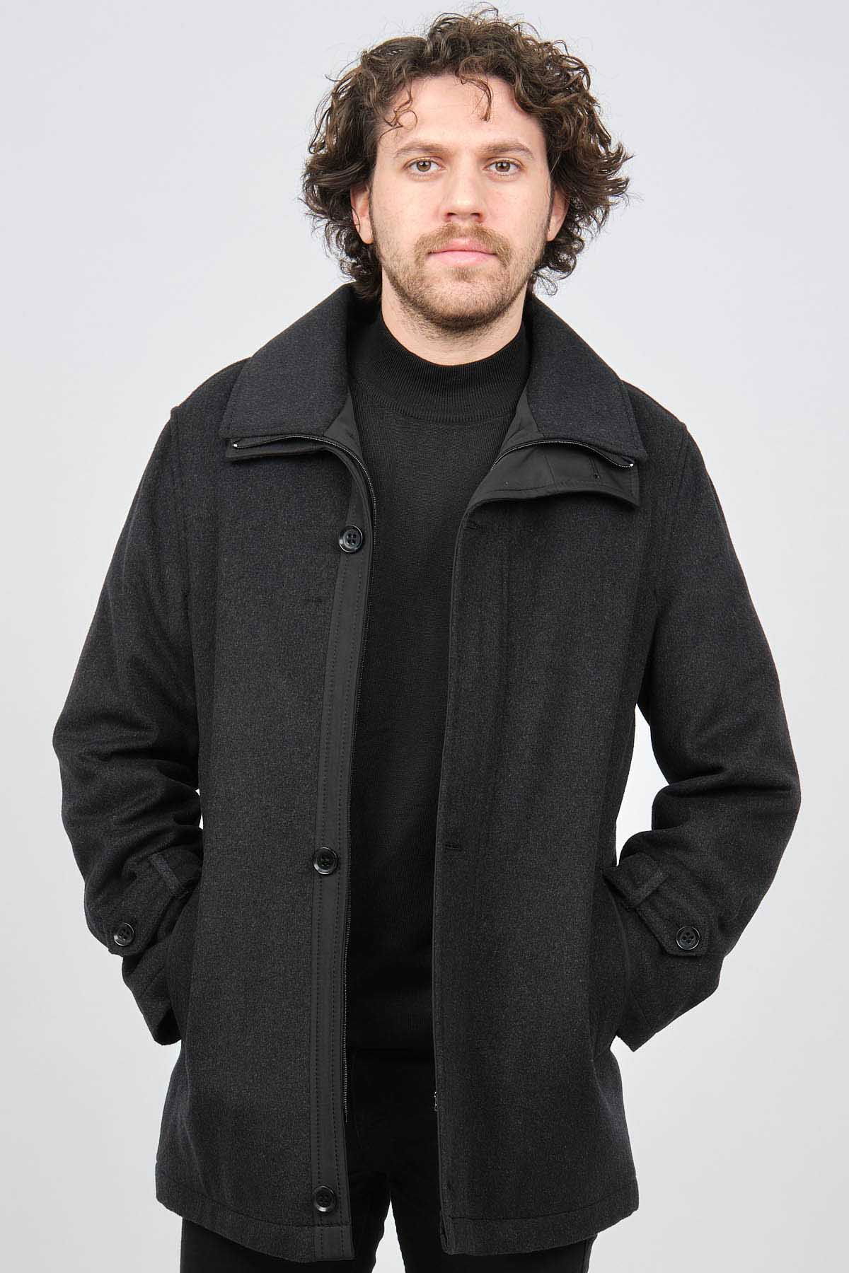 Detay: Çift yakalı, Kol apoletli, Fermuar ve düğme kapamalı yün kaban;