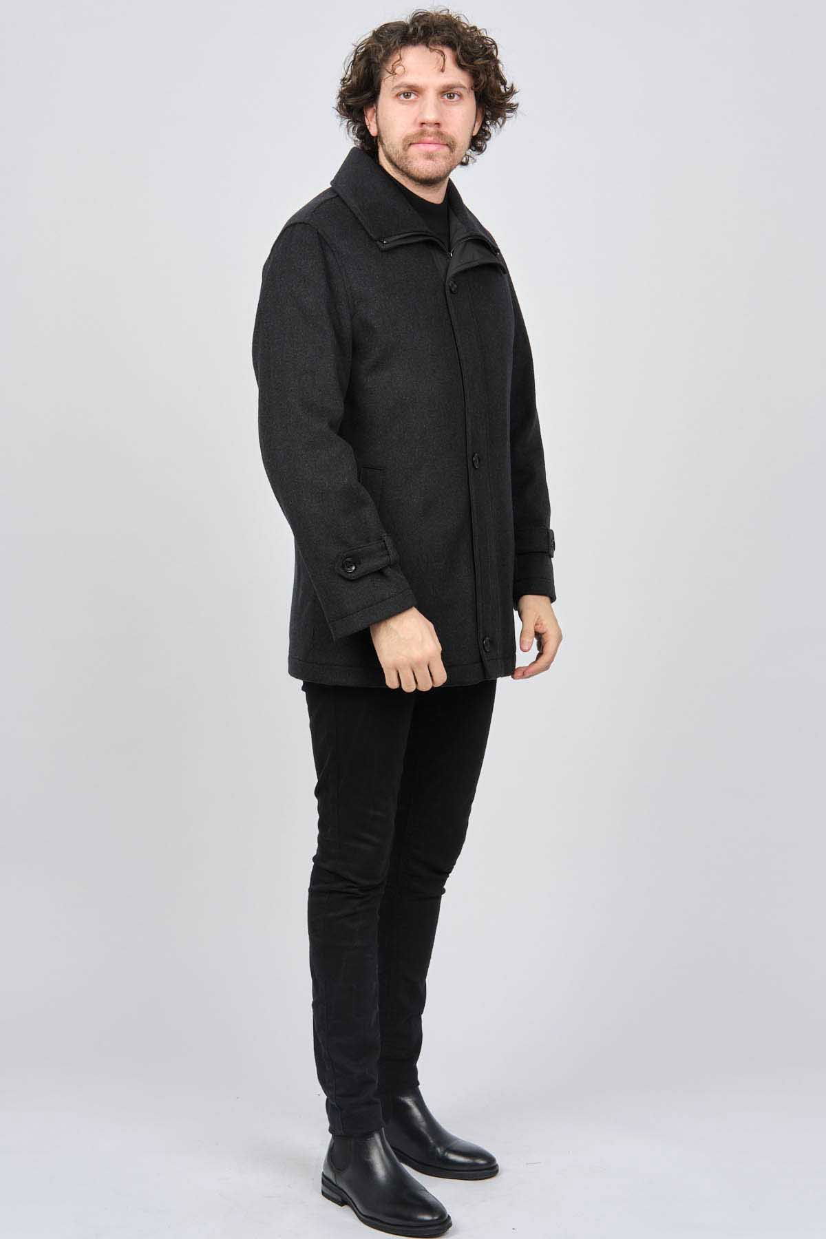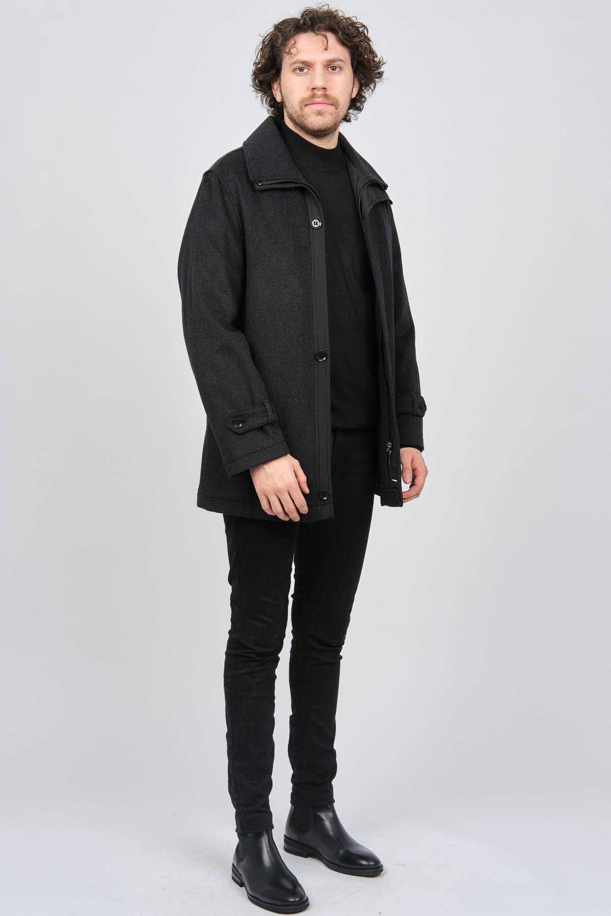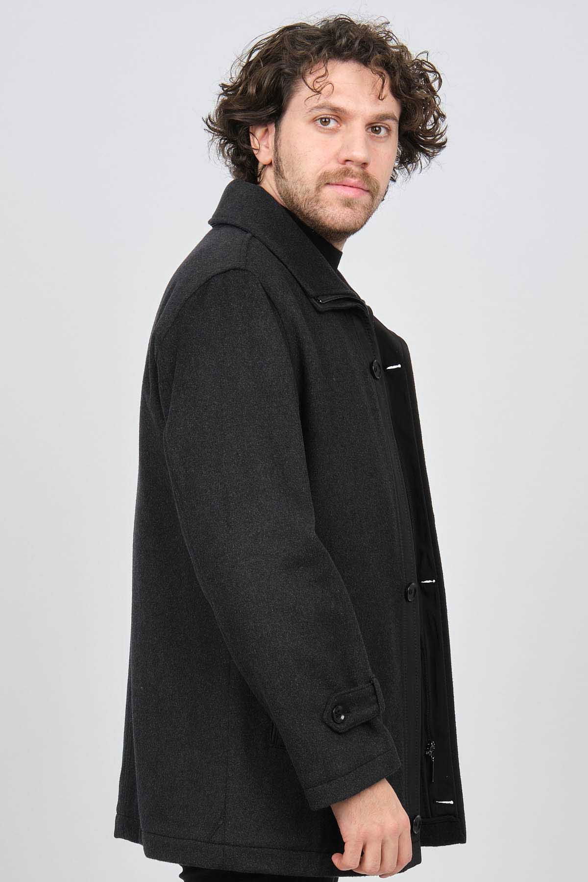 Detay: Çift yakalı, Kol apoletli, Fermuar ve düğme kapamalı yün kaban;