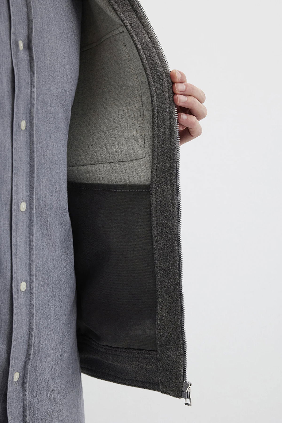 Detay: Tam fermuar kapamalı, yün karışımlı, bir adet göğüs cepli, iki adet yan cepli, gömlek yaka ve uzun kollu gömlek; modern tasarımıyla hem şıklığı hem de fonksiyonelliği bir arada sunar. Yün karışımlı kumaşı sıcak tutarken, tam fermuar kapama pratik kullanım sağlar. Göğüs ve yan cepler işlevsellik katarken, gömlek yaka ve uzun kol detayı bu parçayı gardırobun zamansız ve vazgeçilmez ürünlerinden biri haline getirir;