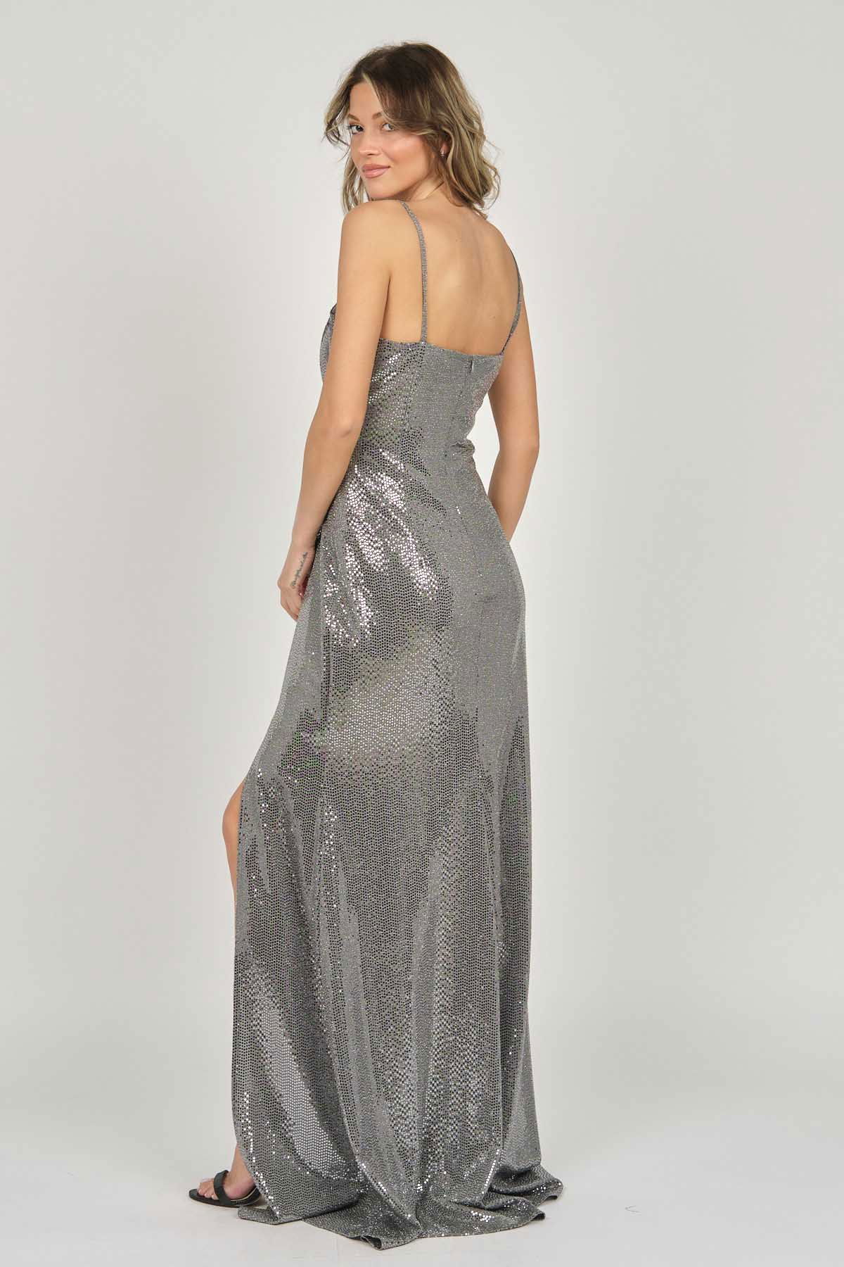 Detay: Askılı, payetli, derin yırtmaçlı, astarlı abiye elbise;