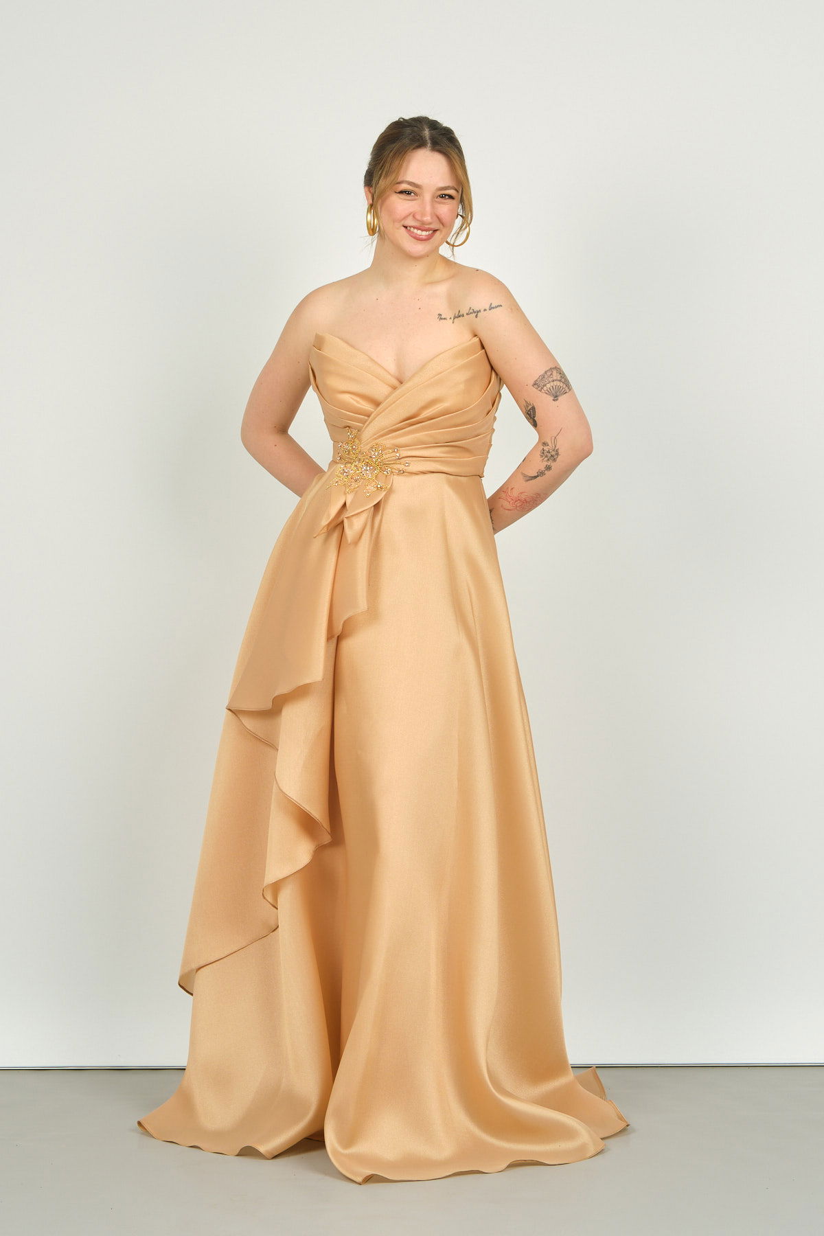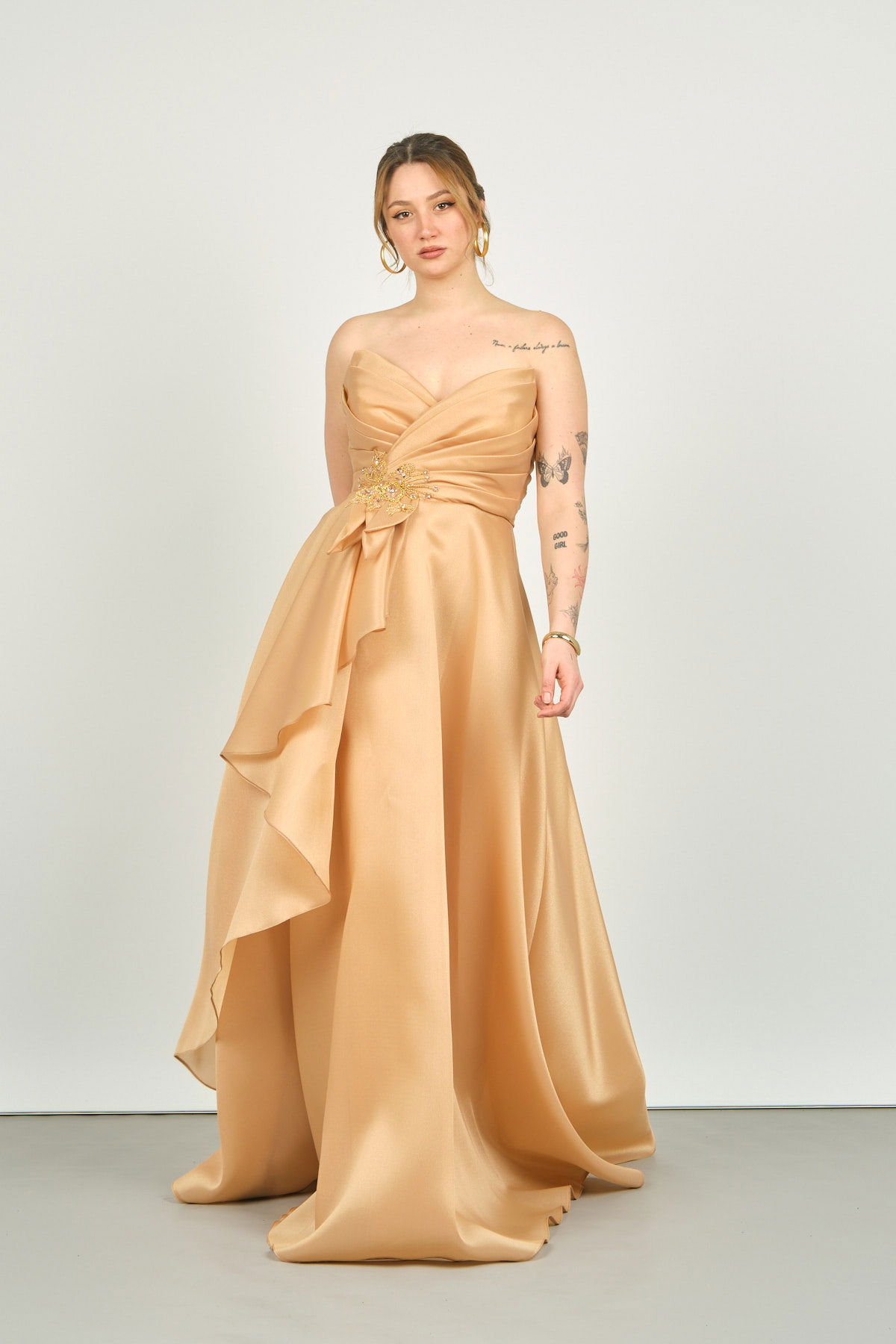 Detay: Uzun, bel kısmı işlemeli, fırfırlı, astarlı abiye elbise;