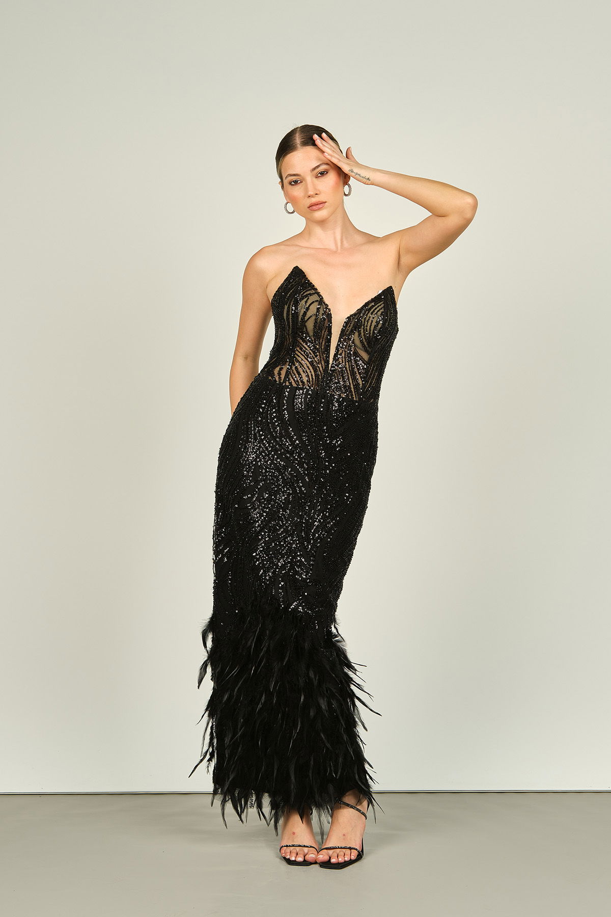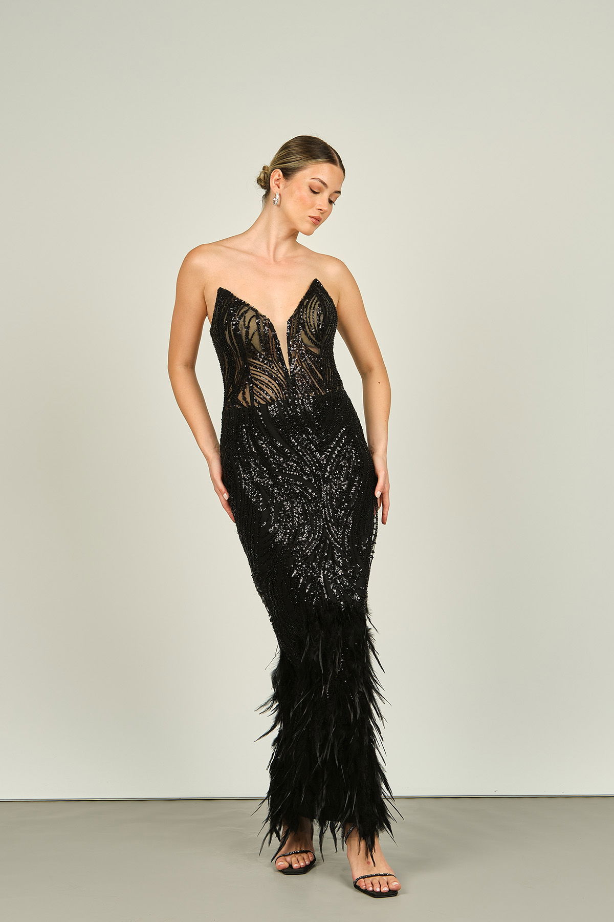Detay: Etek kısmı otrişli, beli transparan, sırt detaylı, derin V yaka, astarlı abiye elbise;