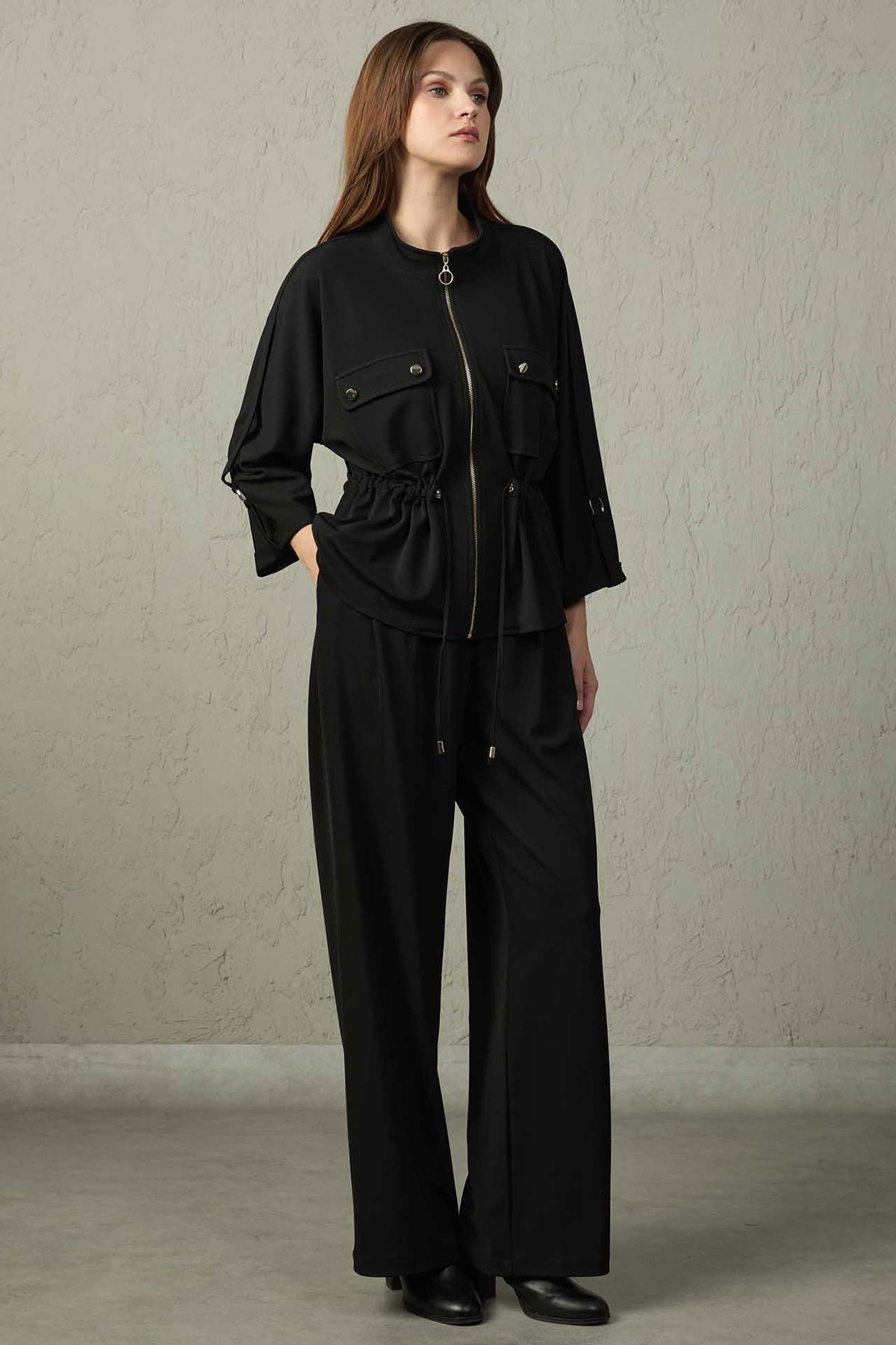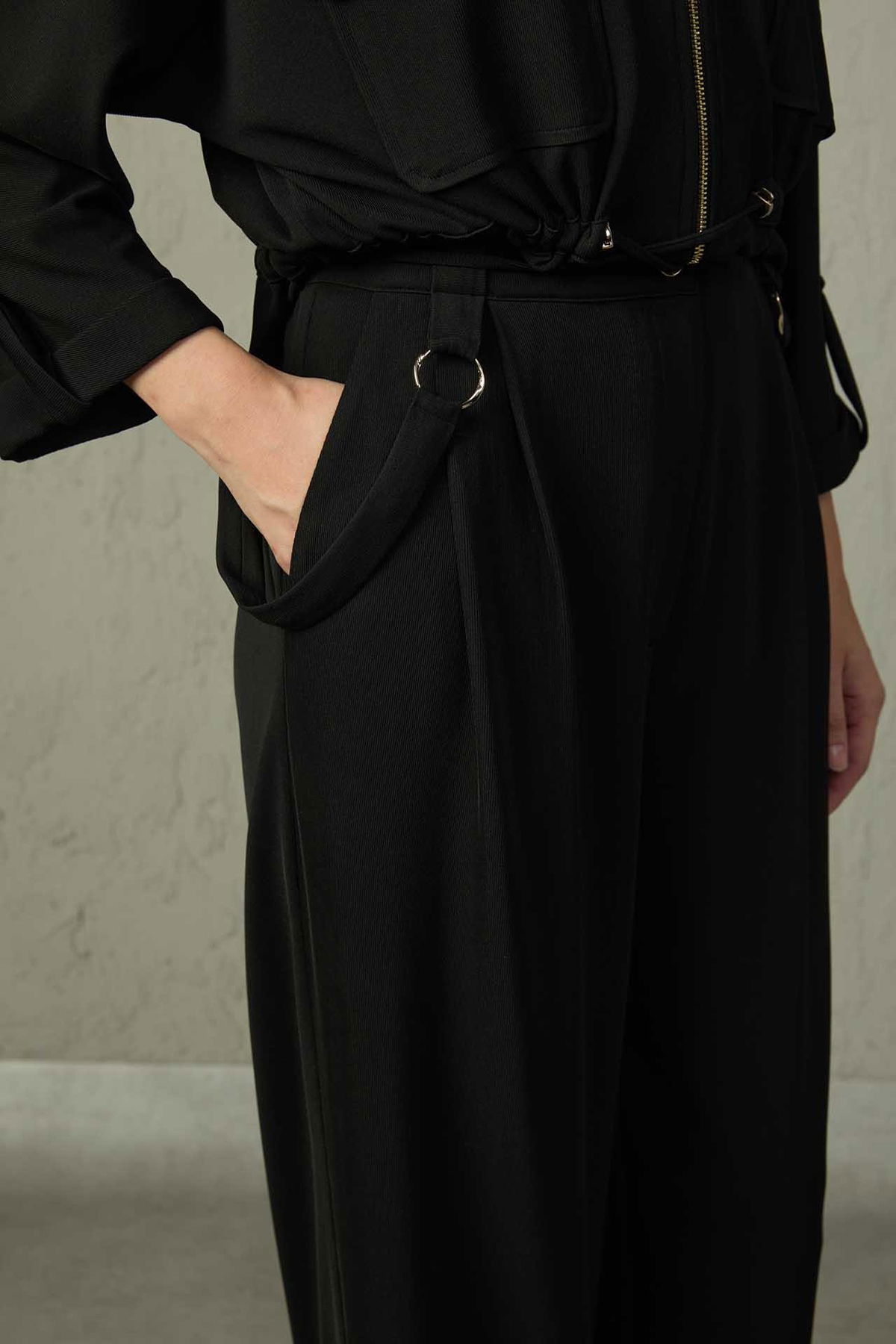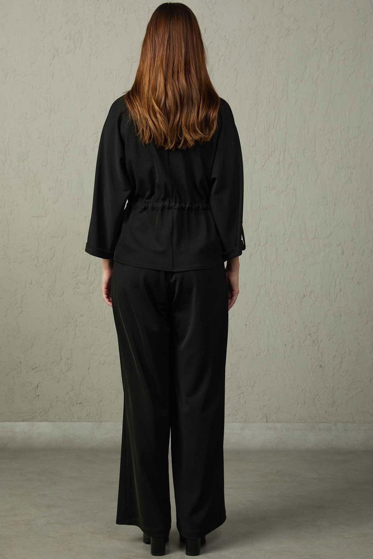 Detay: Yandan süs köprülü, arka bel lastikli, bol paça, önden pileli, çift cepli, fermuar ve çift düğme kapamalı pantolon; modern kesimiyle rahatlığı ön plana çıkarırken zarif detaylarıyla şıklığı tamamlar. Bel kısmındaki lastik yapısı konfor sağlarken, önden pileli ve bol paça tasarım özgür bir duruş kazandırır. Çift cep ve fermuar-düğme kapama özelliği ise hem işlevsellik hem de estetik açıdan pantolonu gardırobun vazgeçilmez parçalarından biri haline getirir;