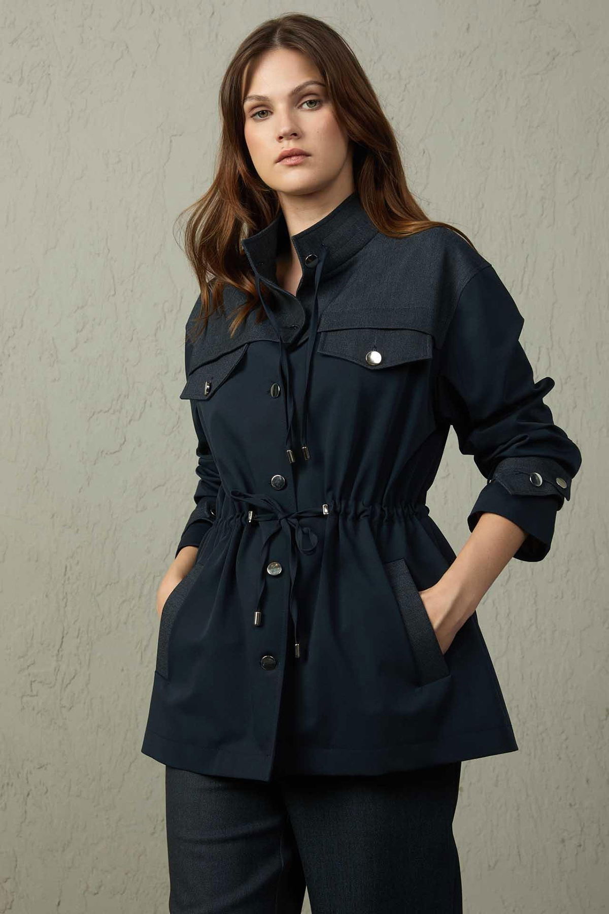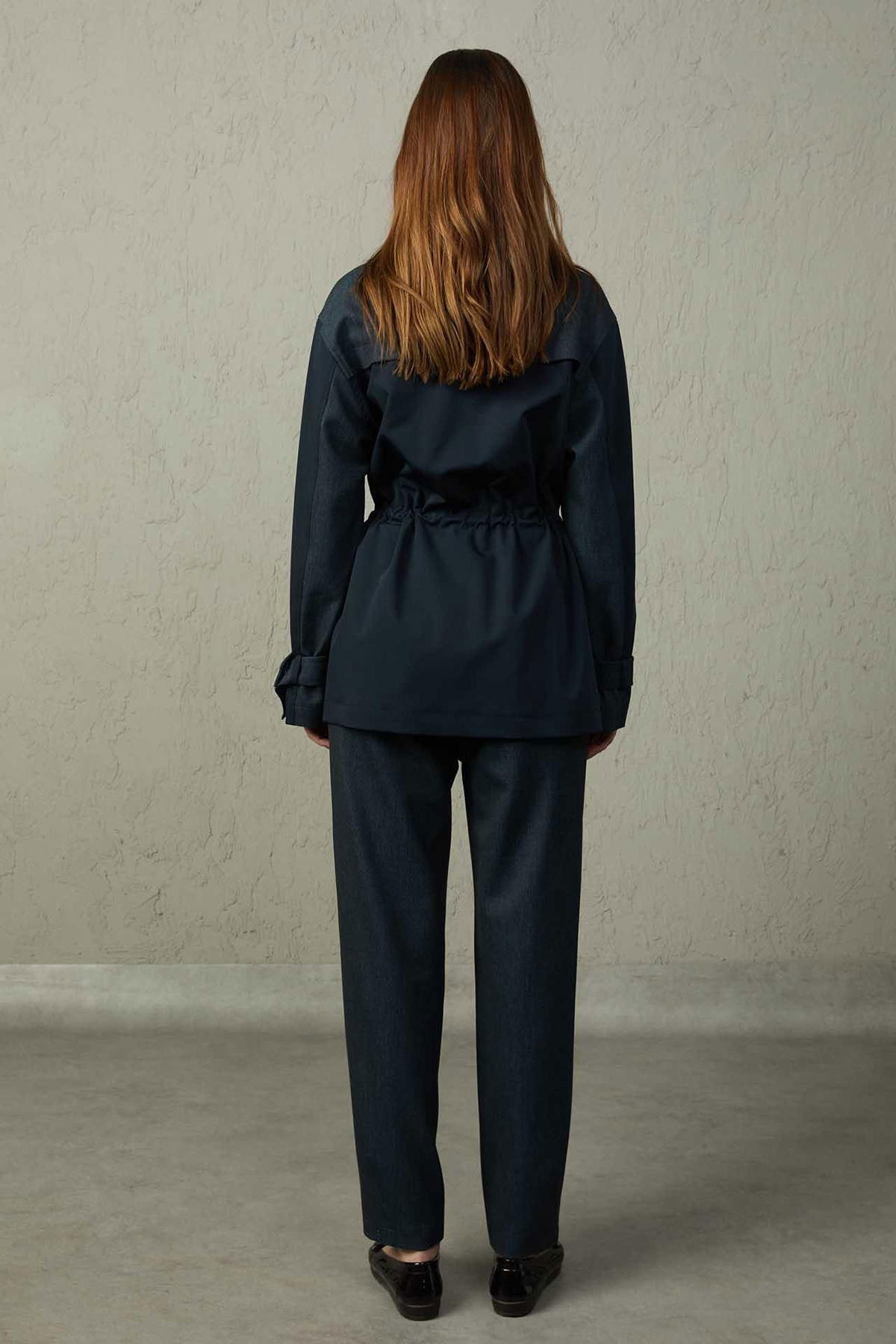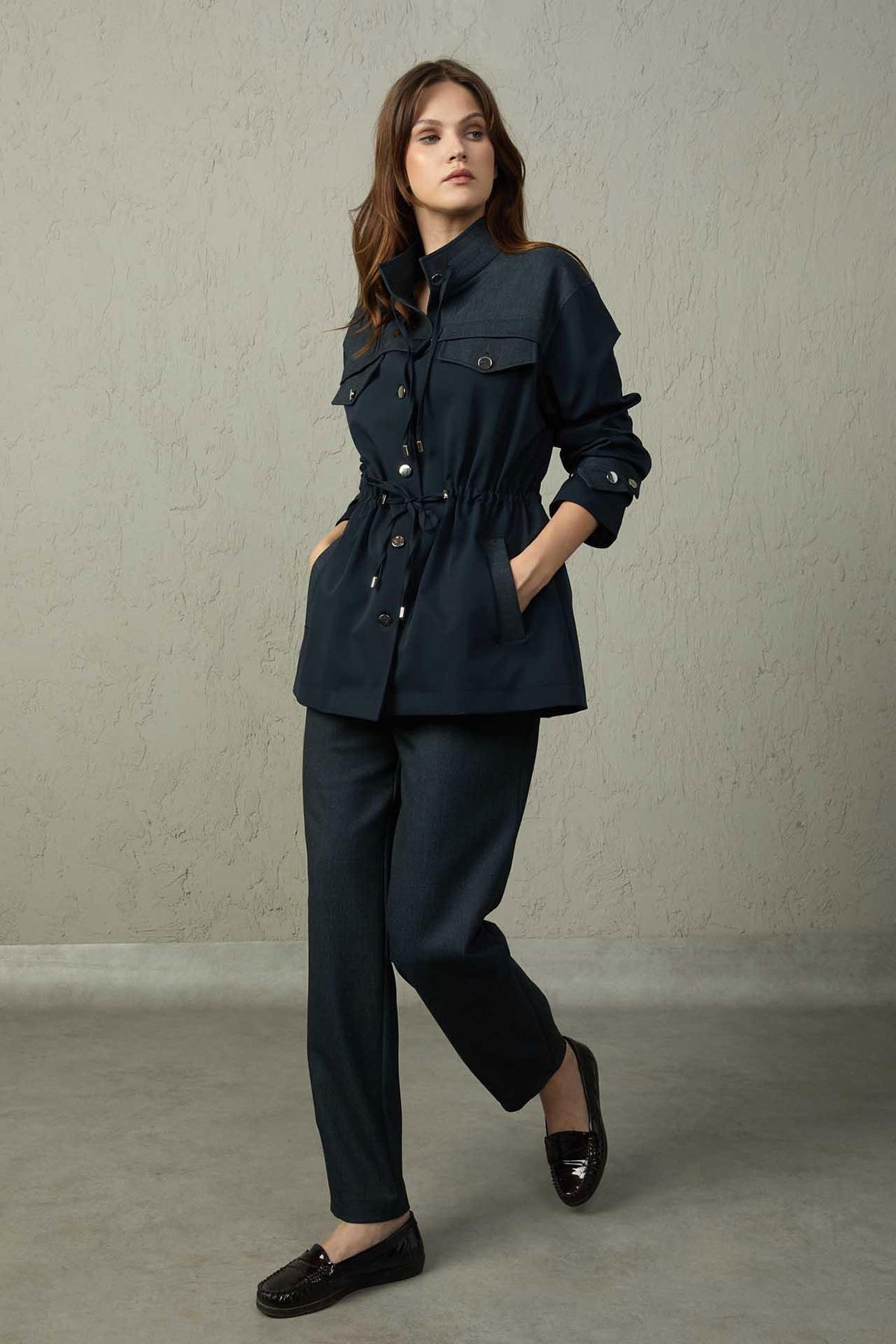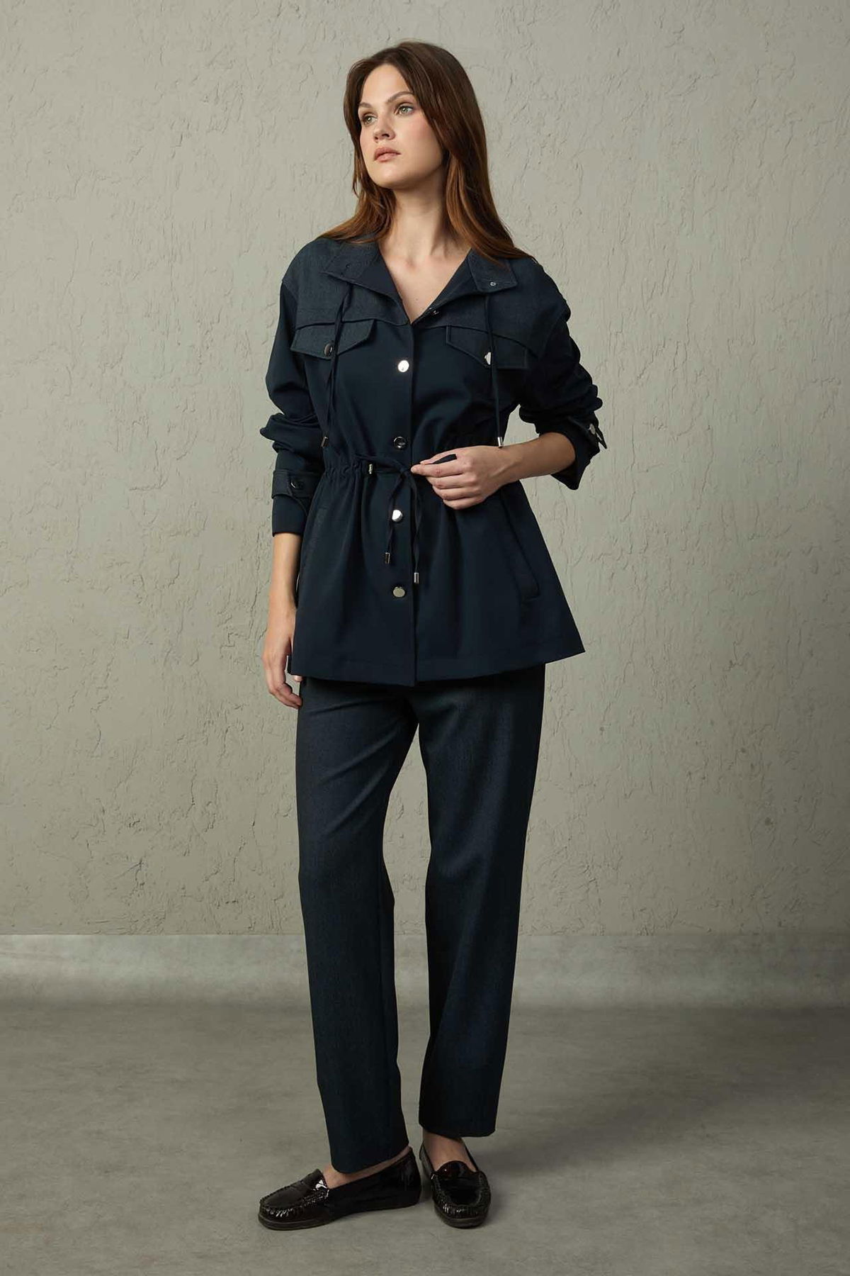 Detay: Astarlı, kolu bantlı ve düğmeli, metal düğmeli üste iki adet süs cepli, alt kısımda iki adet yan cepli, çift kumaş detaylı ve beli büzgülü trençkot; şıklığı ve fonksiyonelliği bir arada sunan modern bir dış giyim parçasıdır. Astarlı yapısı soğuk havalarda koruma sağlarken, beli büzgülü tasarım vücuda zarif bir form kazandırır. Çift kumaş detayı ve metal düğmeli süs cepler estetik görünümü güçlendirirken, yan cepler pratik kullanım imkânı sunarak trençkotu gardırobun vazgeçilmezlerinden biri haline getirir;