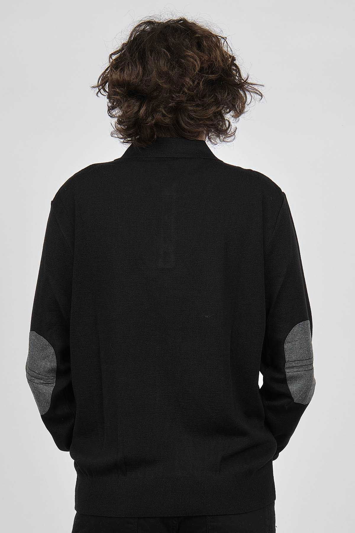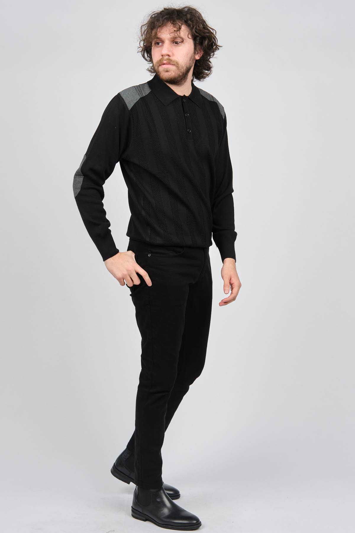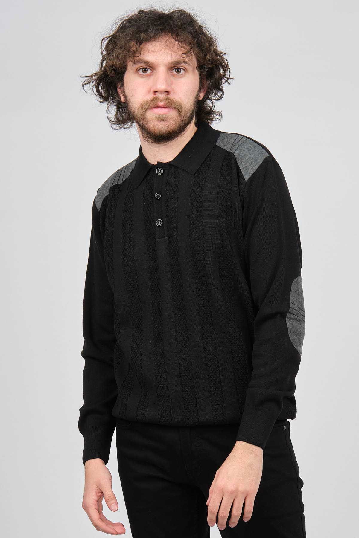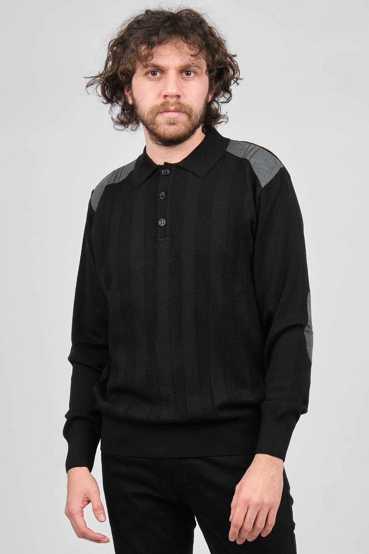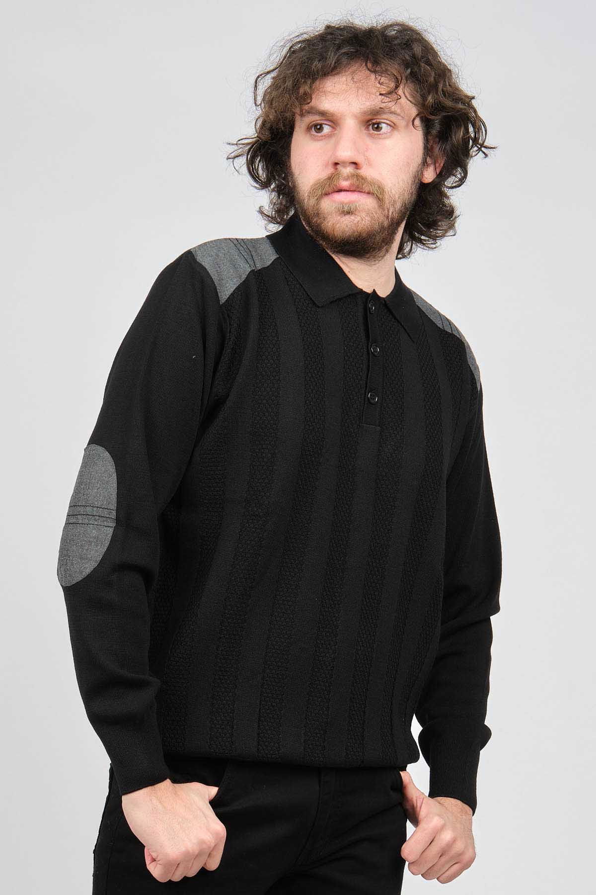 Detay: Düğmeli polo yaka, Çizgi desenli, Yama detaylı, Uzun kollu yün kazak;