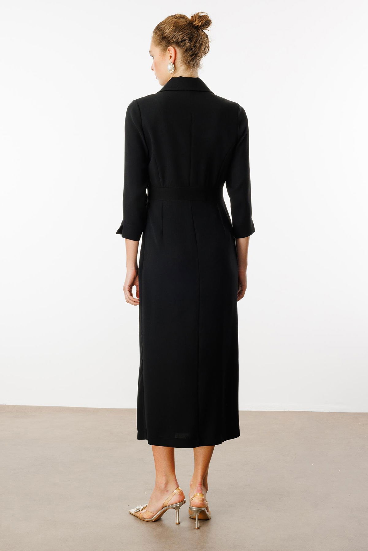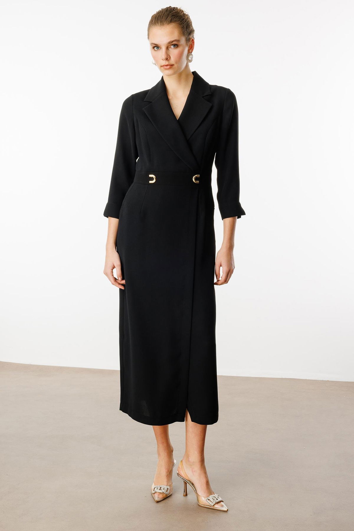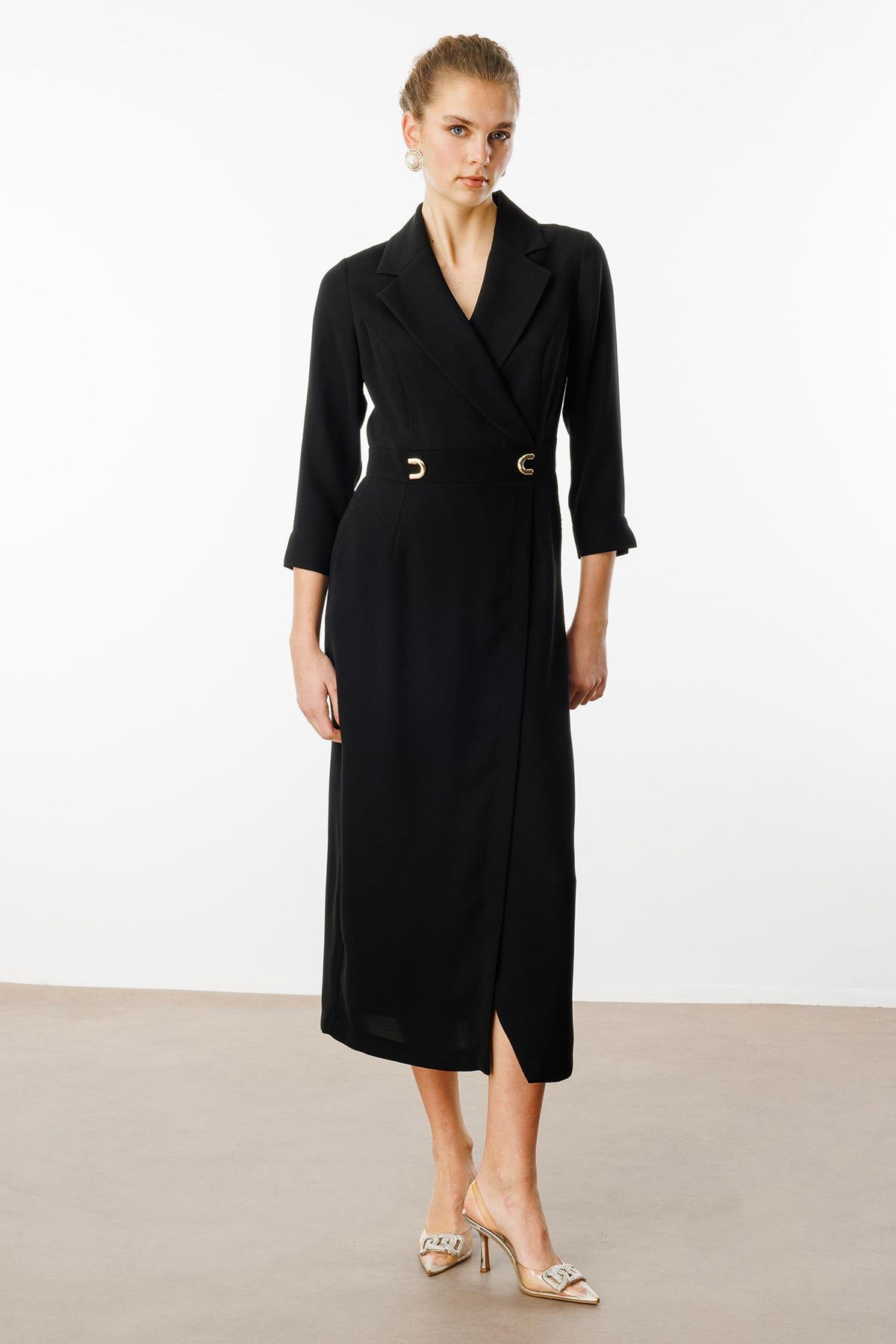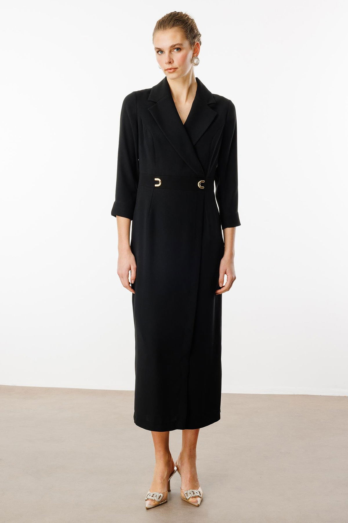 Detay: Beli aksesuar detaylarıyla şıklığı vurgulayan, cepli ve kruvaze yaka tasarıma sahip bu elbise; zarif duruşuyla hem günlük hem de özel davet kombinlerine modern bir dokunuş katar. Kruvaze kesimi vücut hatlarını dengeli bir şekilde ortaya çıkarırken, cepler ise fonksiyonelliği artırır. Bel kısmındaki aksesuar, elbiseye sofistike bir hava katarken stil sahibi kadınların gardırobunda öne çıkan parçalardan biri haline gelir;