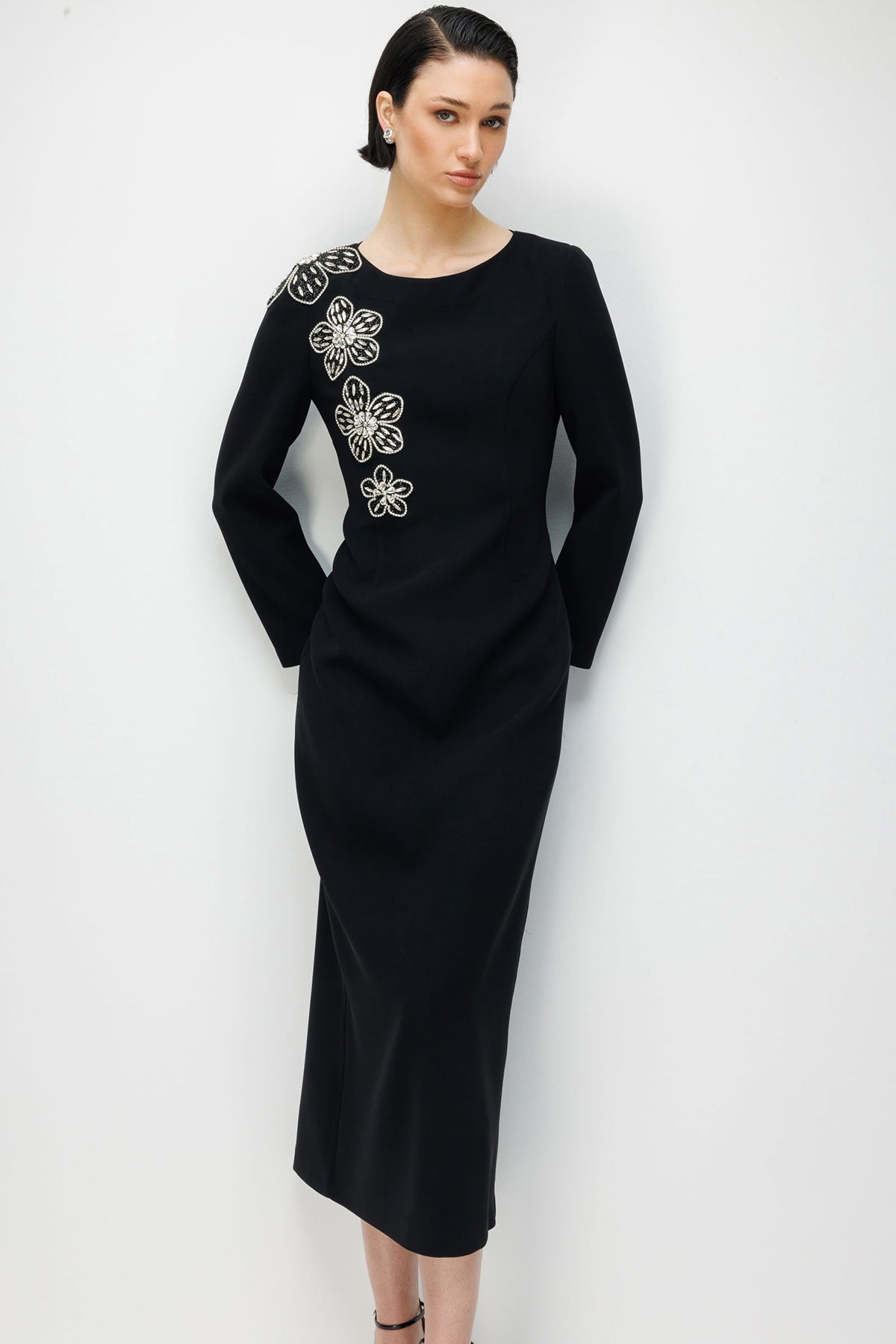 Detay: Dokuma kumaştan üretilen, çiçek desenli, taş aksesuar detaylı klasik kalem elbise modeli tüm bu özellikleri ile zarif ve feminen bir görünüm sunar. Kalem elbise formu vücuda oturan şık bir siluet oluştururken çiçek desenleri romantik bir hava katar. Taş aksesuar detayları elbiseye sofistike bir ışıltı ekler. Dokuma kumaş yapısı ise dayanıklılık ve kaliteli bir duruş sağlar;