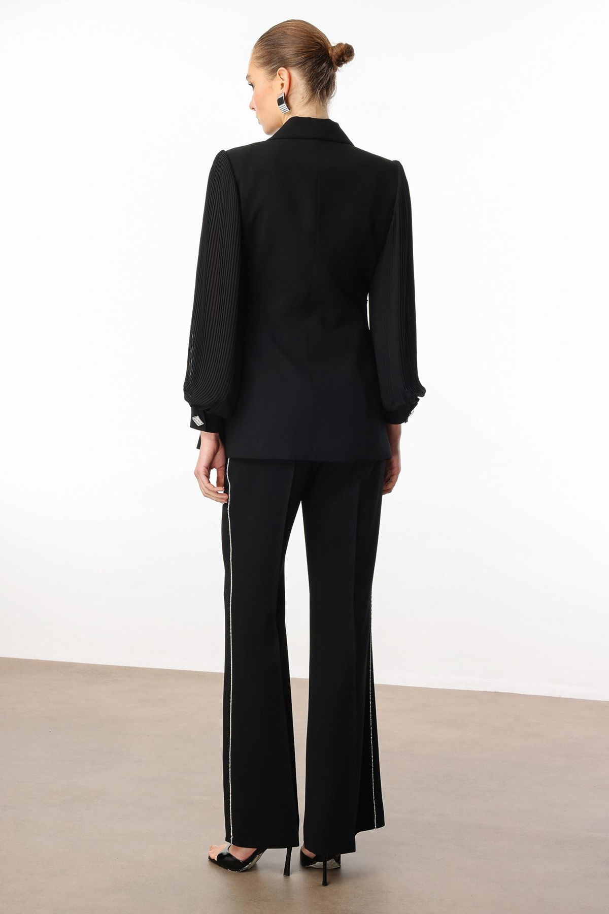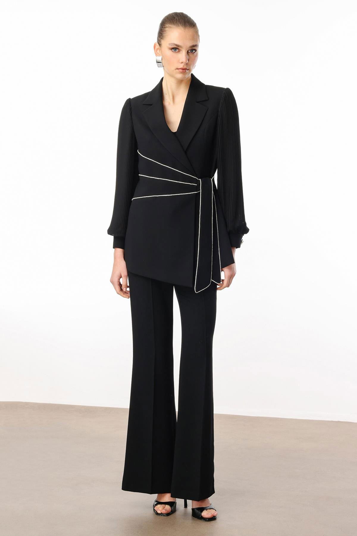 Detay: Kolları piliseli ve şerit aksesuar detaylarıyla tasarlanan bu ceket, klasik çizgilere modern bir dokunuş katıyor. Pilise detaylar hareketli bir siluet sunarken, şerit aksesuarlar cekete dinamik ve özgün bir hava kazandırır. Hem günlük kombinlerde hem de özel davetlerde rahatlıkla kullanılabilecek bu parça, stil sahibi görünüm arayanlar için ideal bir tercihtir;