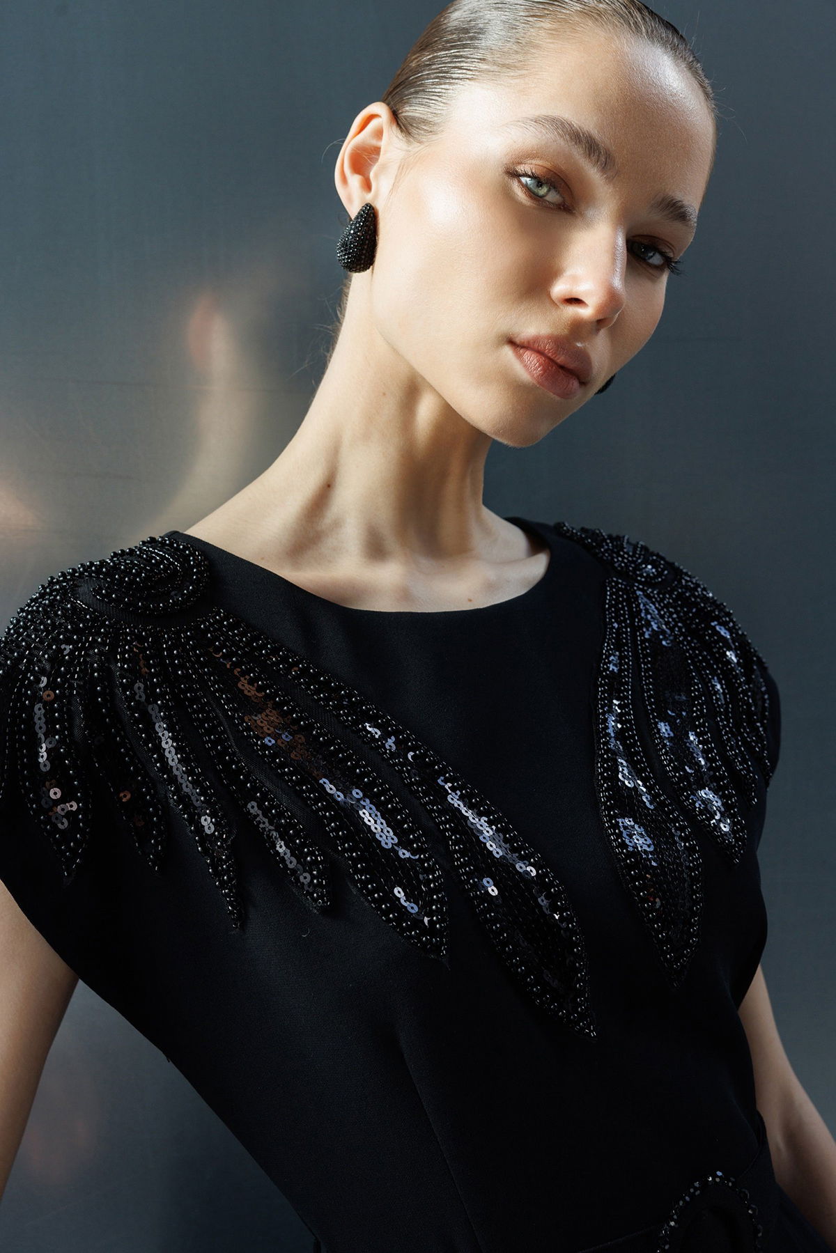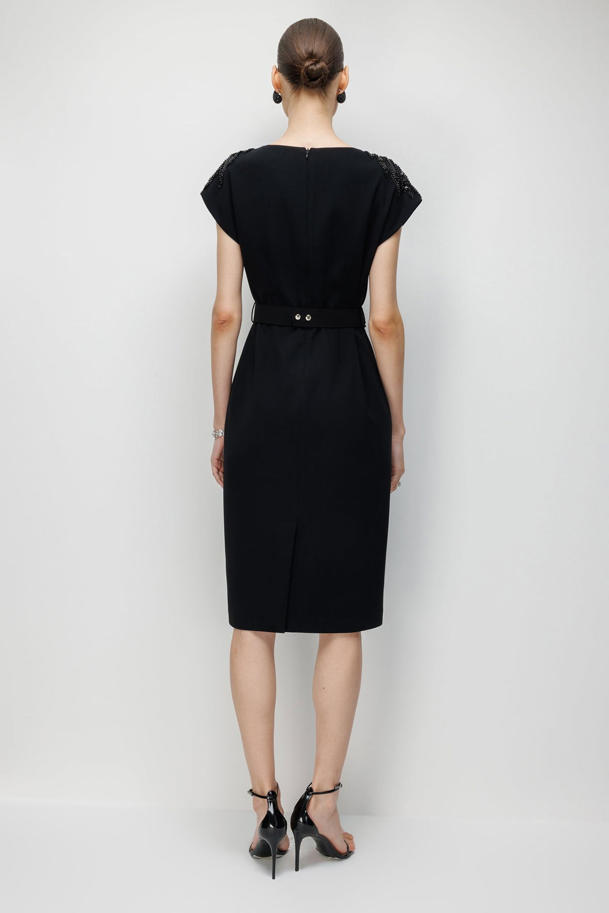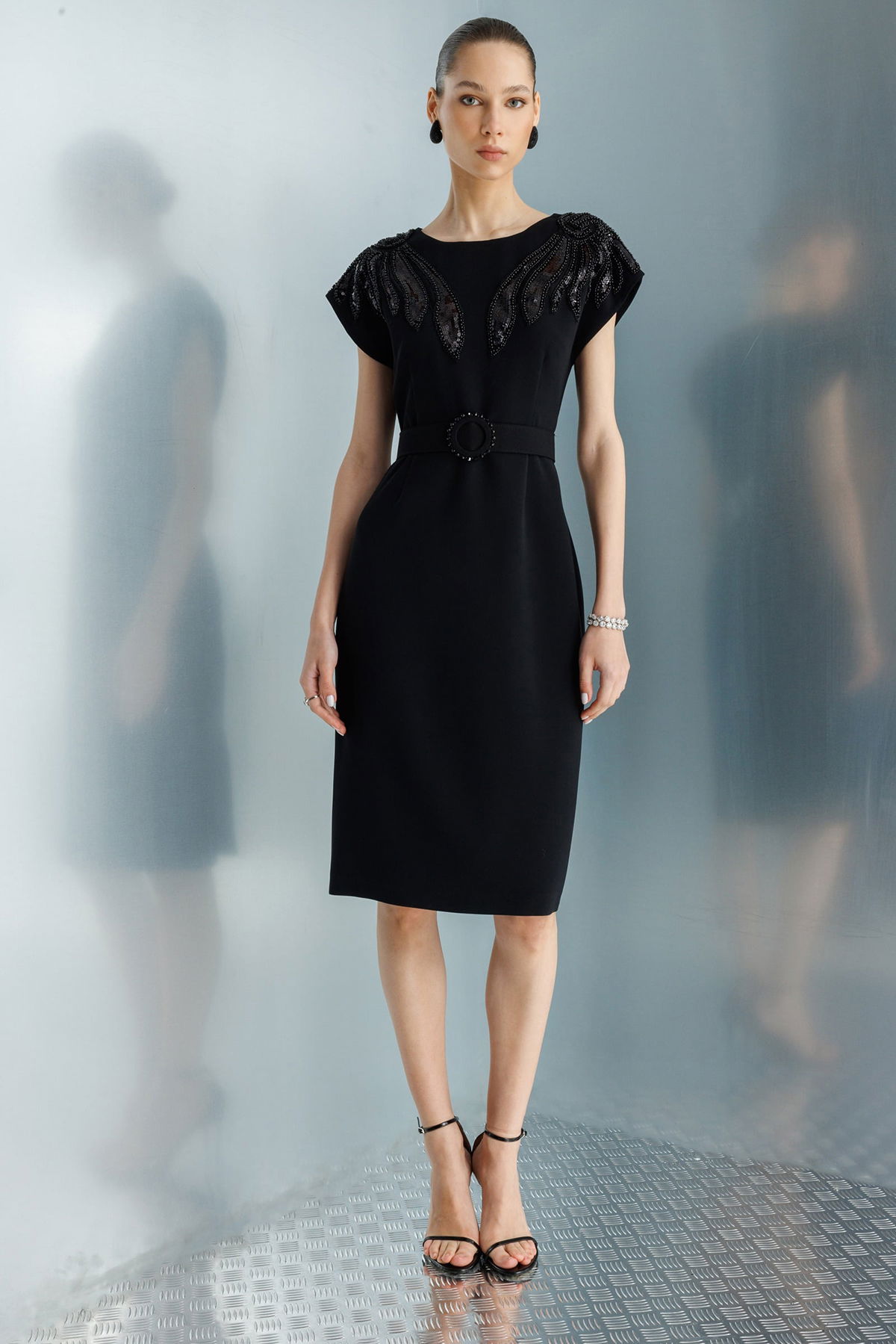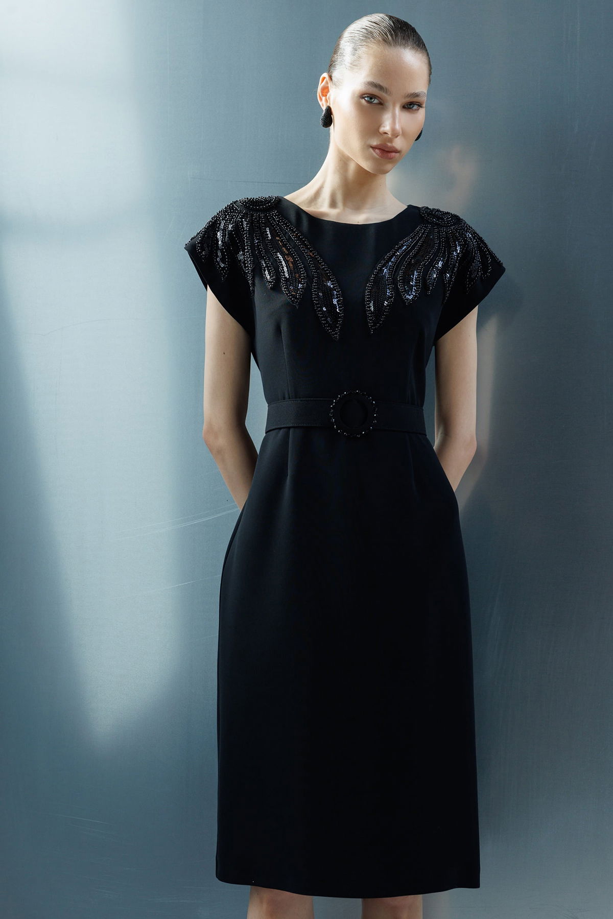 Detay: Polyester kumaştan üretilen, midi boy, omuzları boncuk işleme aksesuar detaylı ve beli boncuklu kemerle tamamlanan bu elbise modeli tüm bu özellikleri ile zarif ve göz alıcı bir görünüm sunar. Dik yaka yerine klasik elbise formunu koruyan tasarım, boncuk işlemeleri sayesinde şıklığı ön plana çıkarır. Midi boy ölçüsü feminen bir duruş kazandırırken polyester kumaş hafiflik ve dayanıklılık sağlar. Beli boncuklu kemer detayı ise silueti vurgulayarak elbiseye sofistike bir hava katar;