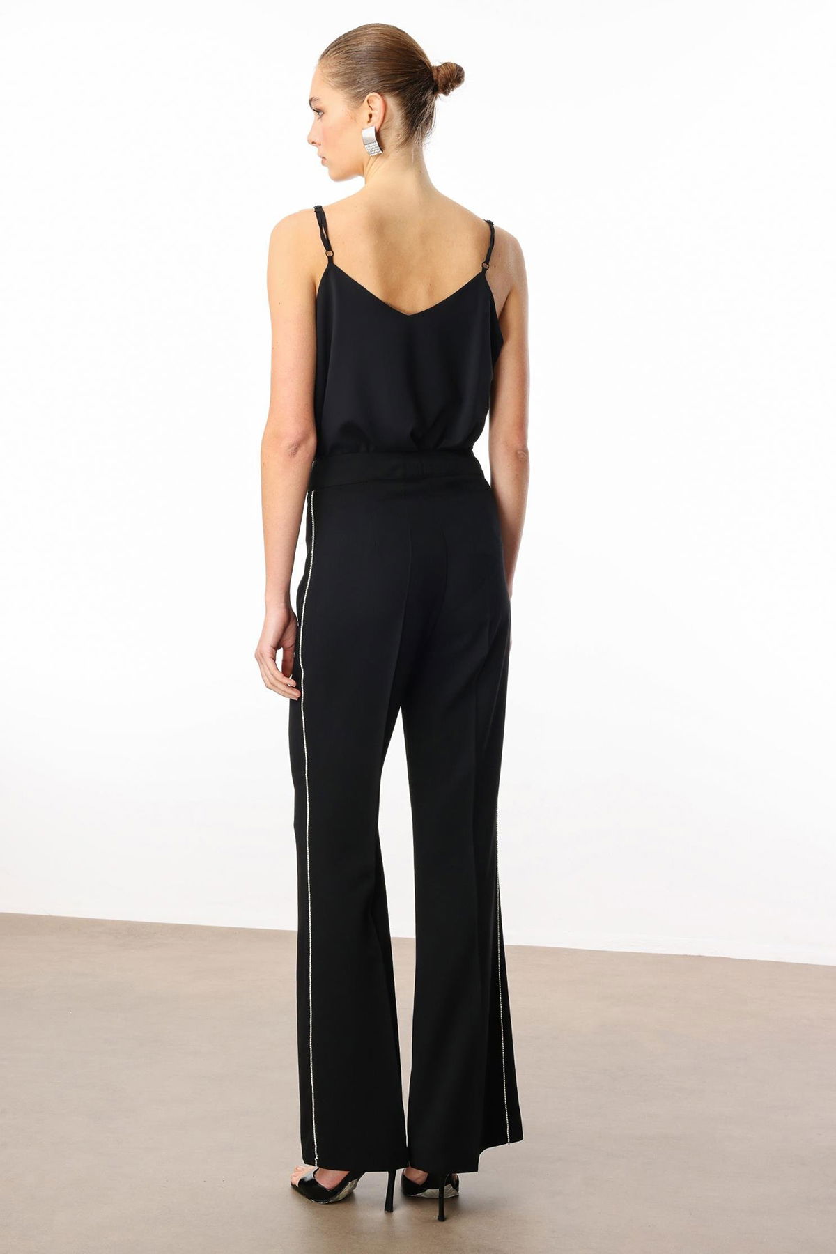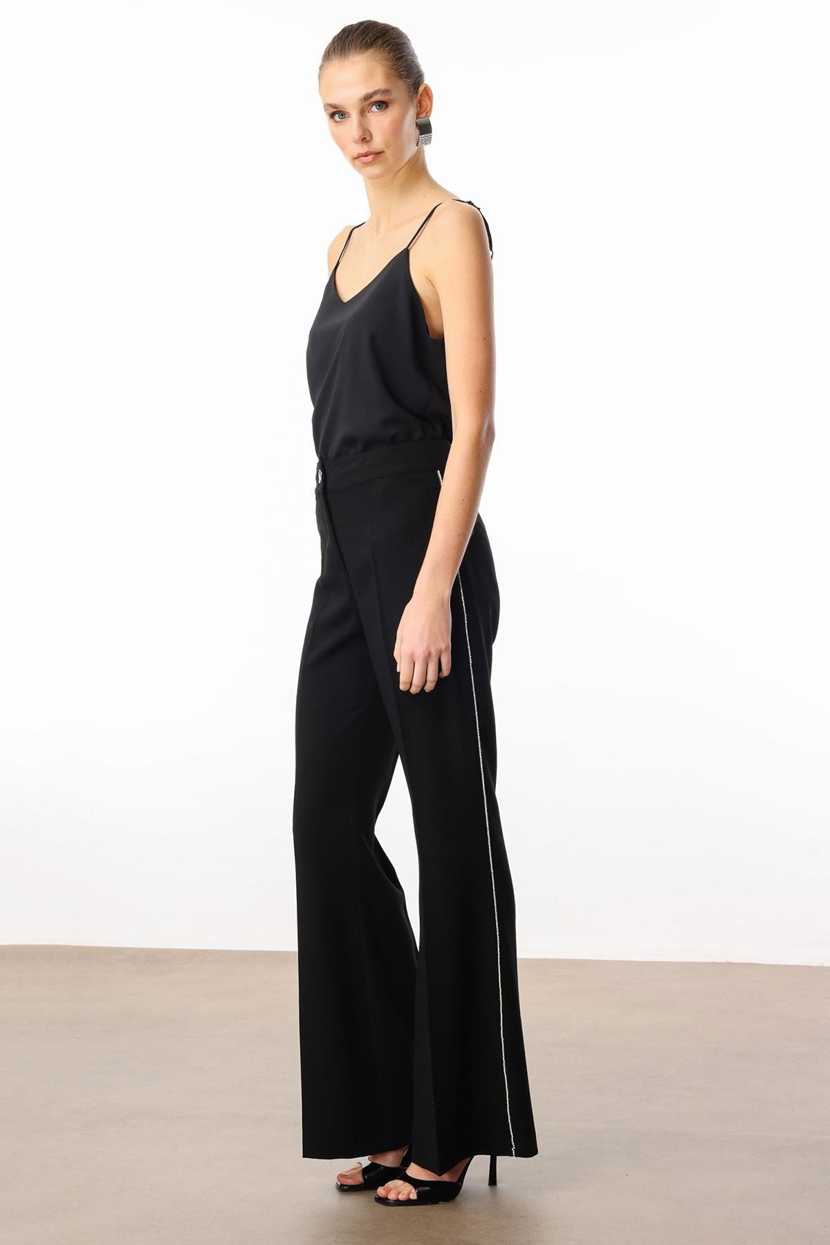 Detay: Yanları şerit Swaroski taş detaylarıyla süslenmiş bu pantolon modeli, şıklığı ve zarafeti bir araya getiriyor. Işıltılı taş şeritler, sade tasarıma sofistike bir dokunuş katarken; modern kesimiyle hem özel davetlerde hem de stil sahibi günlük kombinlerde öne çıkıyor. Bu pantolon, göz alıcı detaylarıyla gece şıklığının vazgeçilmez parçası olmaya aday;