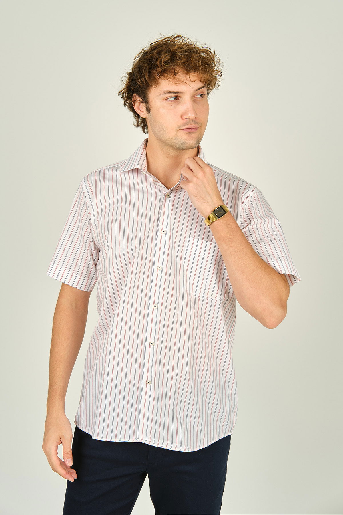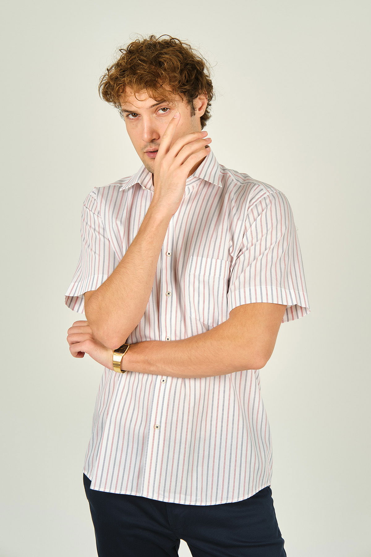 Mugi Erkek Çizgili Tek Cep Detaylı Kısa Kollu %100 Pamuk Gömlek 2001 Kırmızı