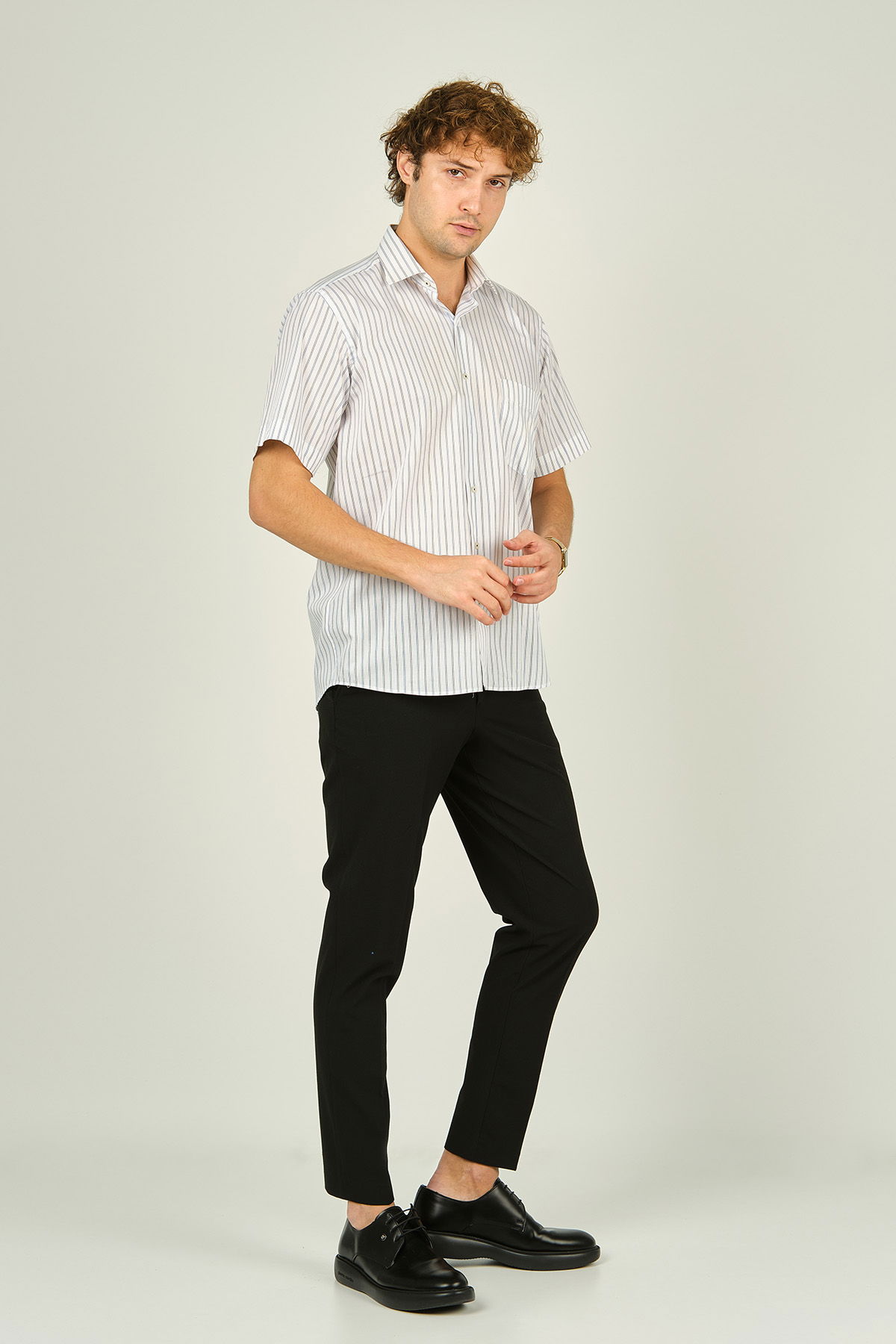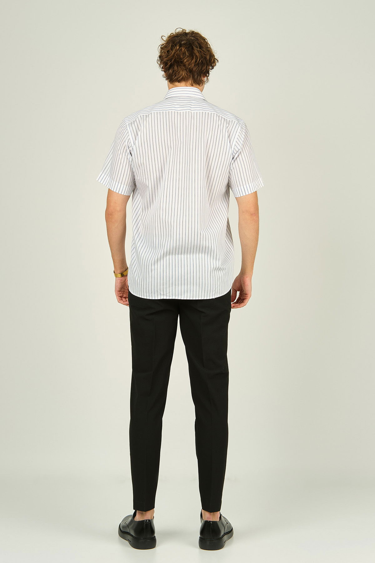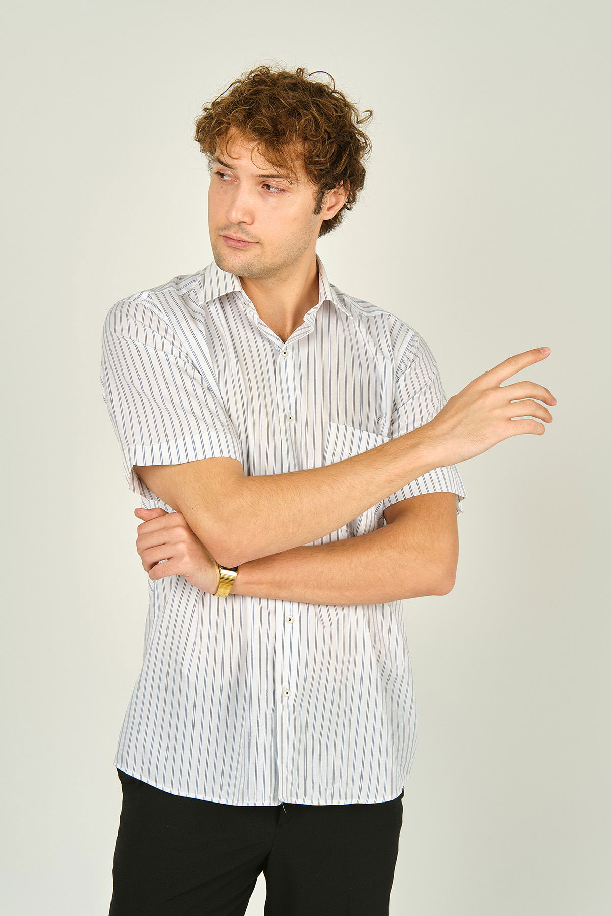 Mugi Erkek Çizgili Tek Cep Detaylı Kısa Kollu %100 Pamuk Gömlek 2001 Mavi