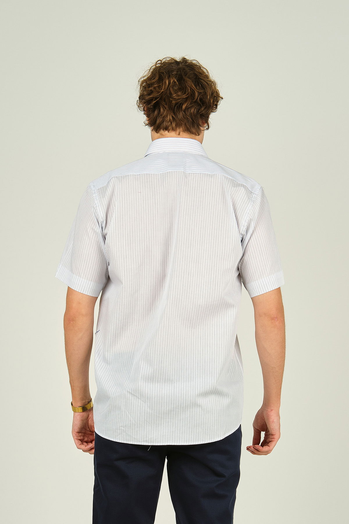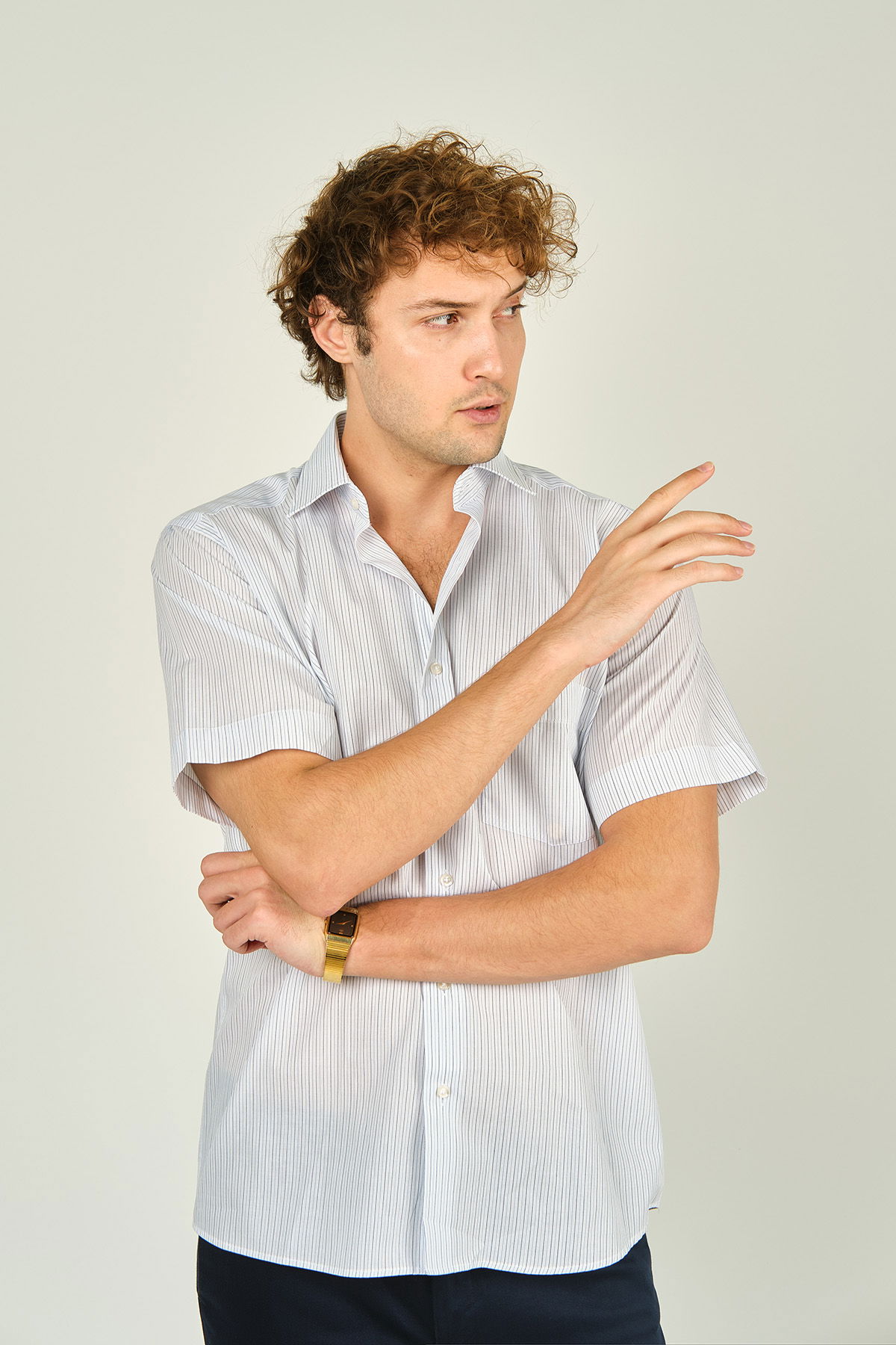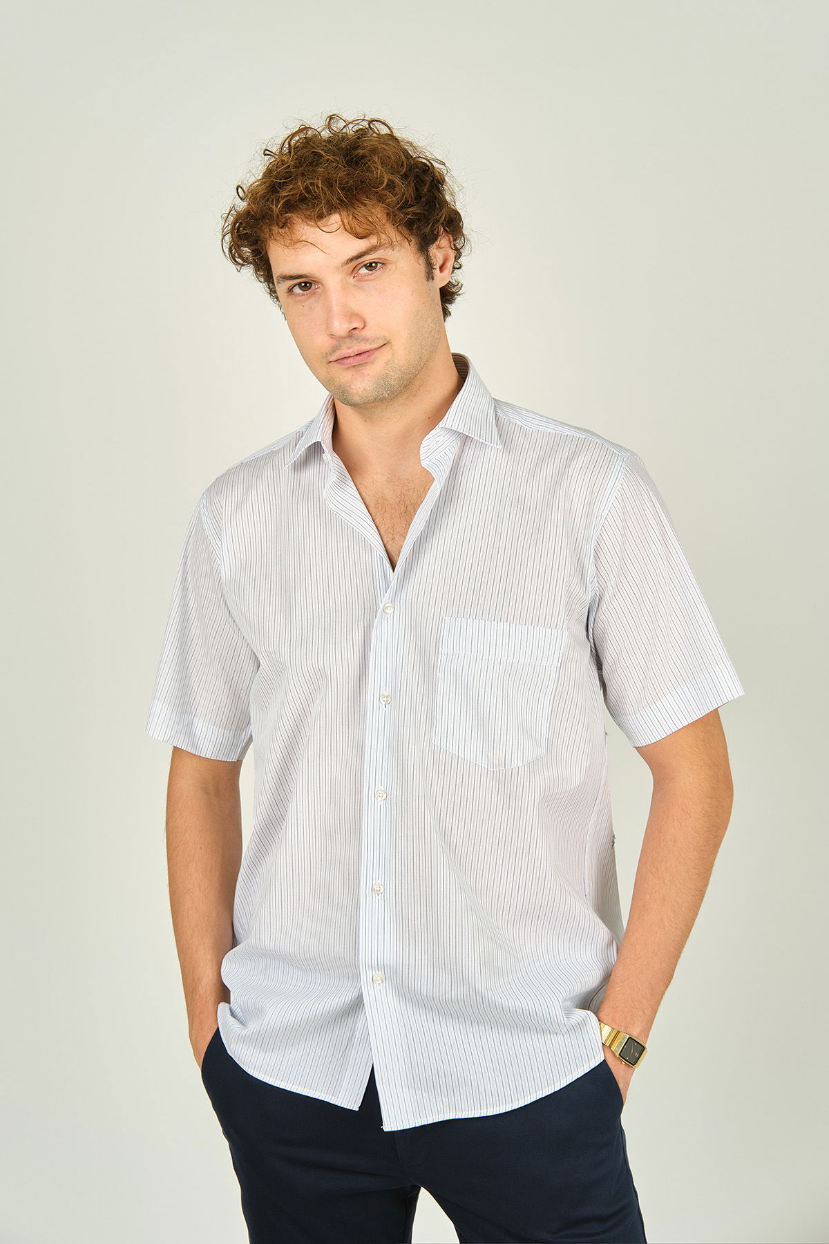 Mugi Erkek Çizgili Tek Cep Detaylı Kısa Kollu %100 Pamuk Gömlek 2003 Mavi