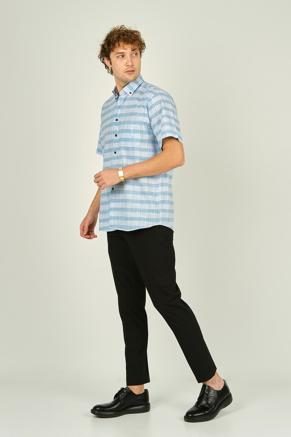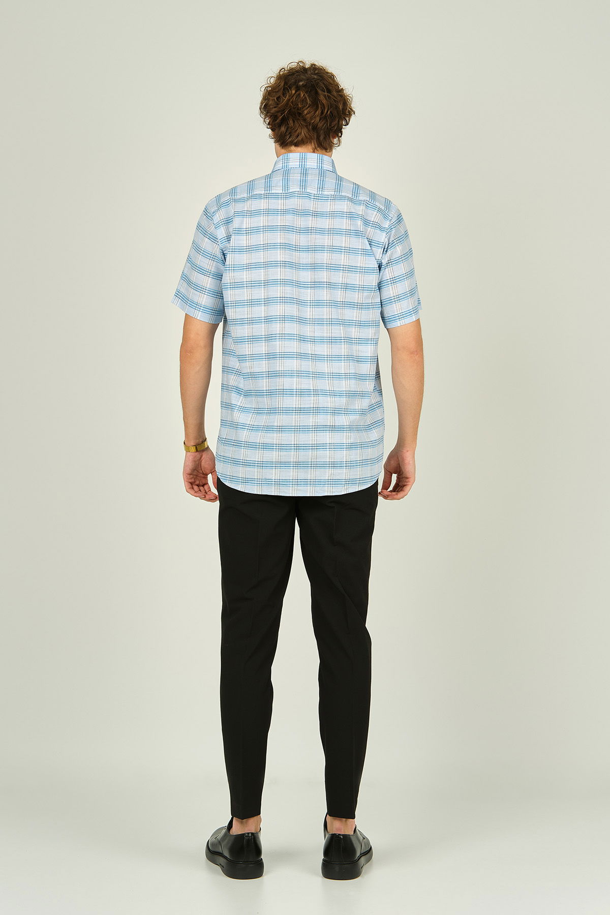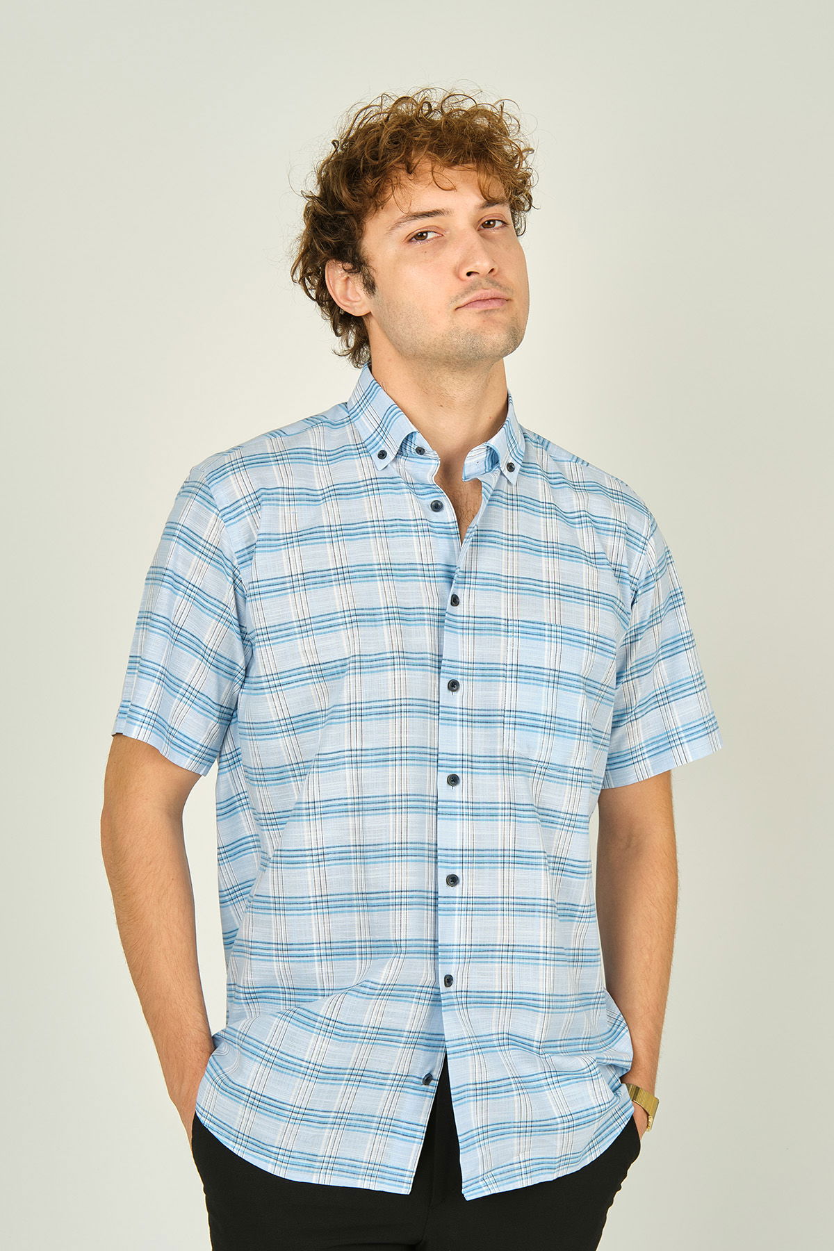 Mugi Erkek Çizgili Tek Cep Detaylı Kısa Kollu %100 Pamuk Gömlek 3010 Mavi