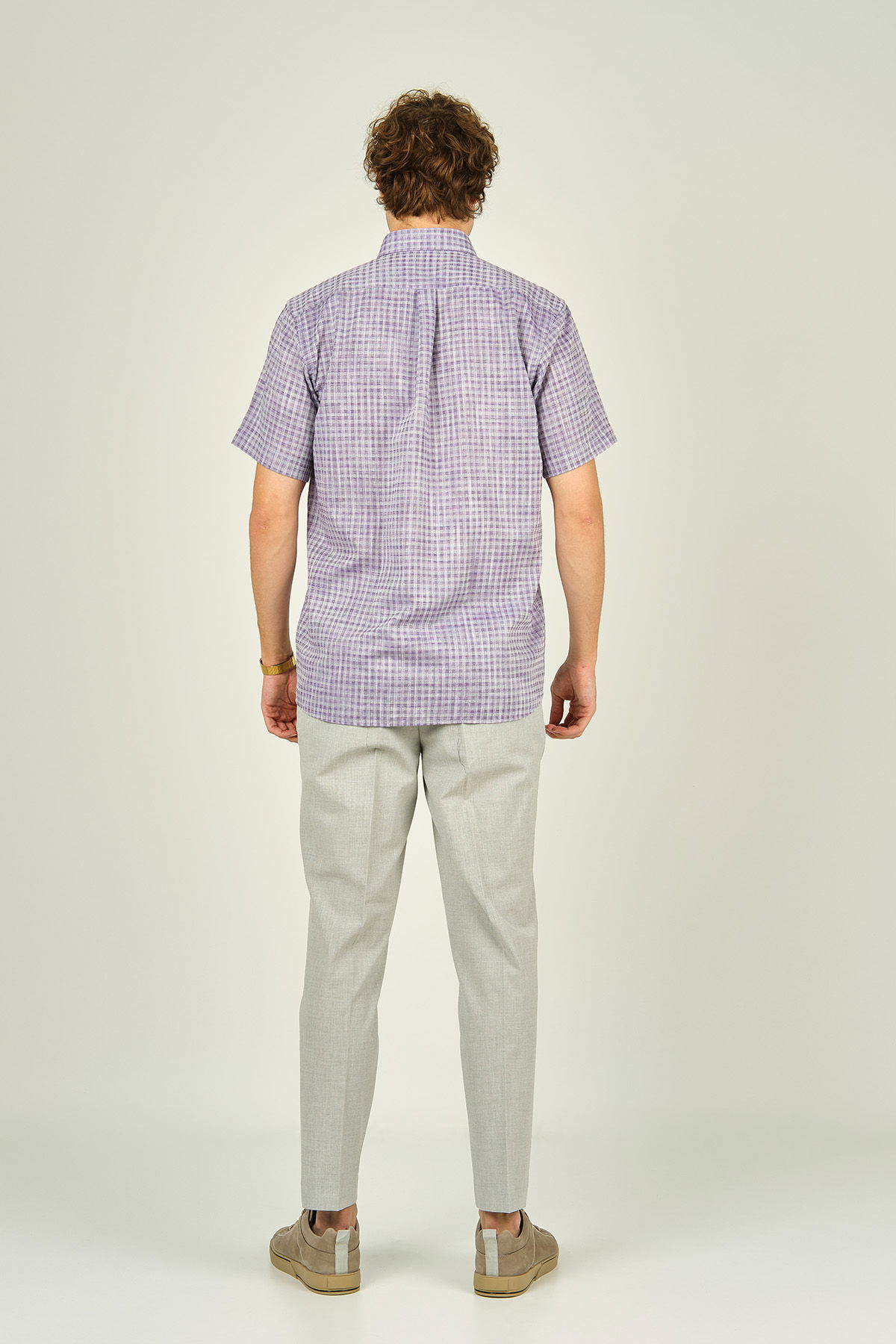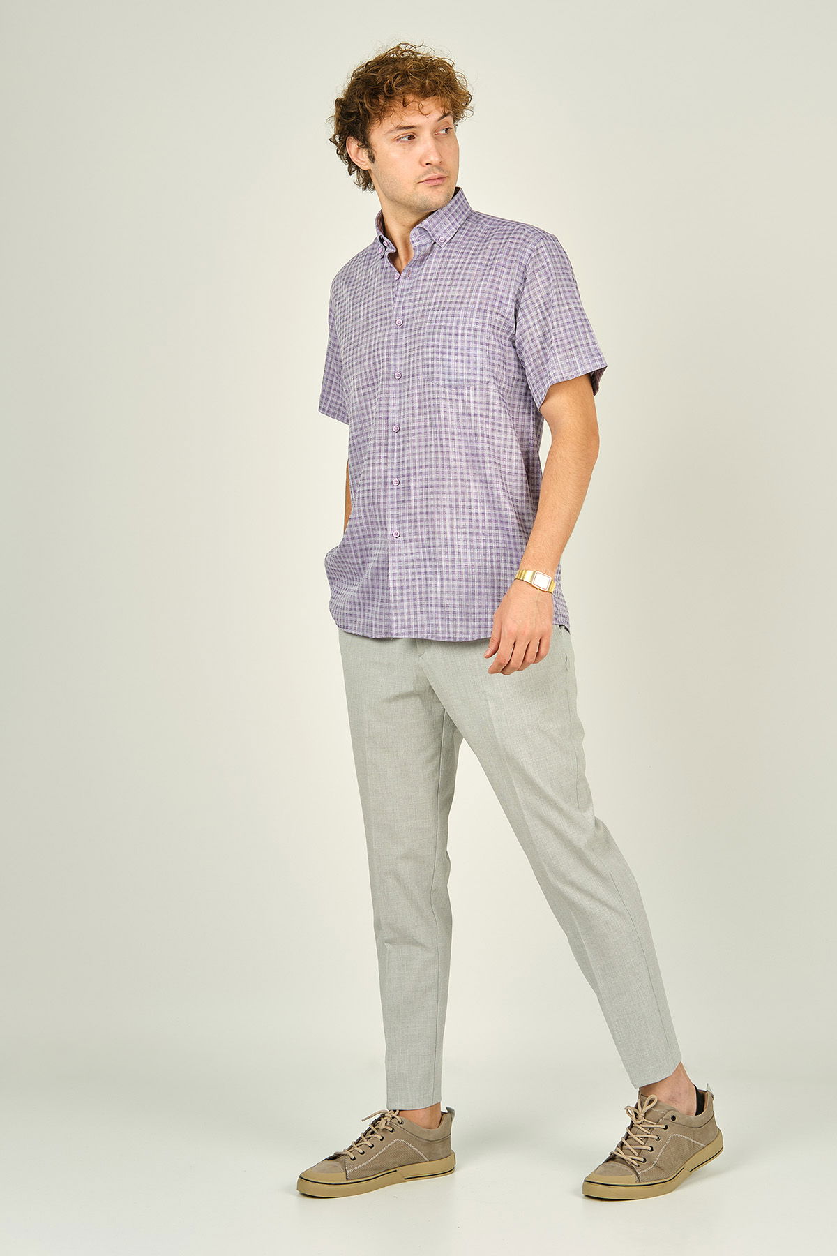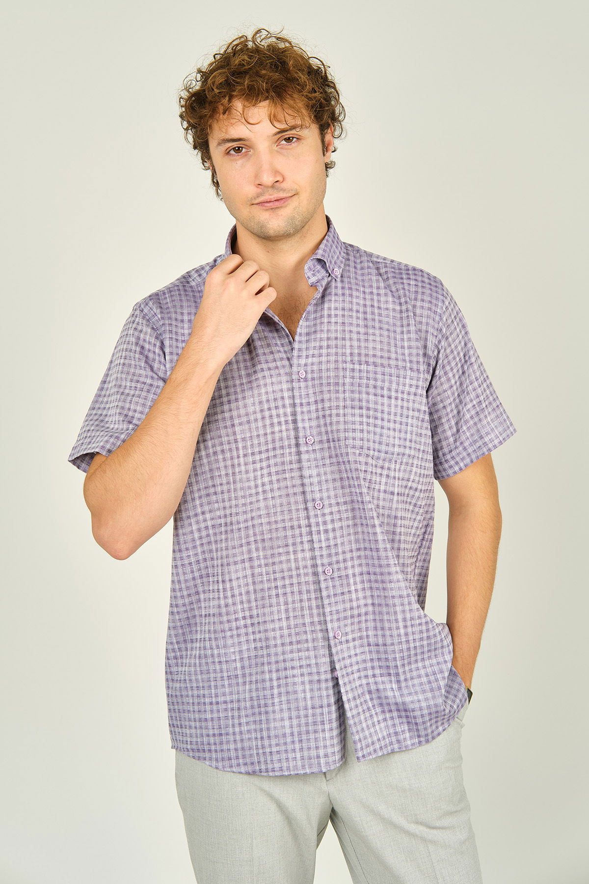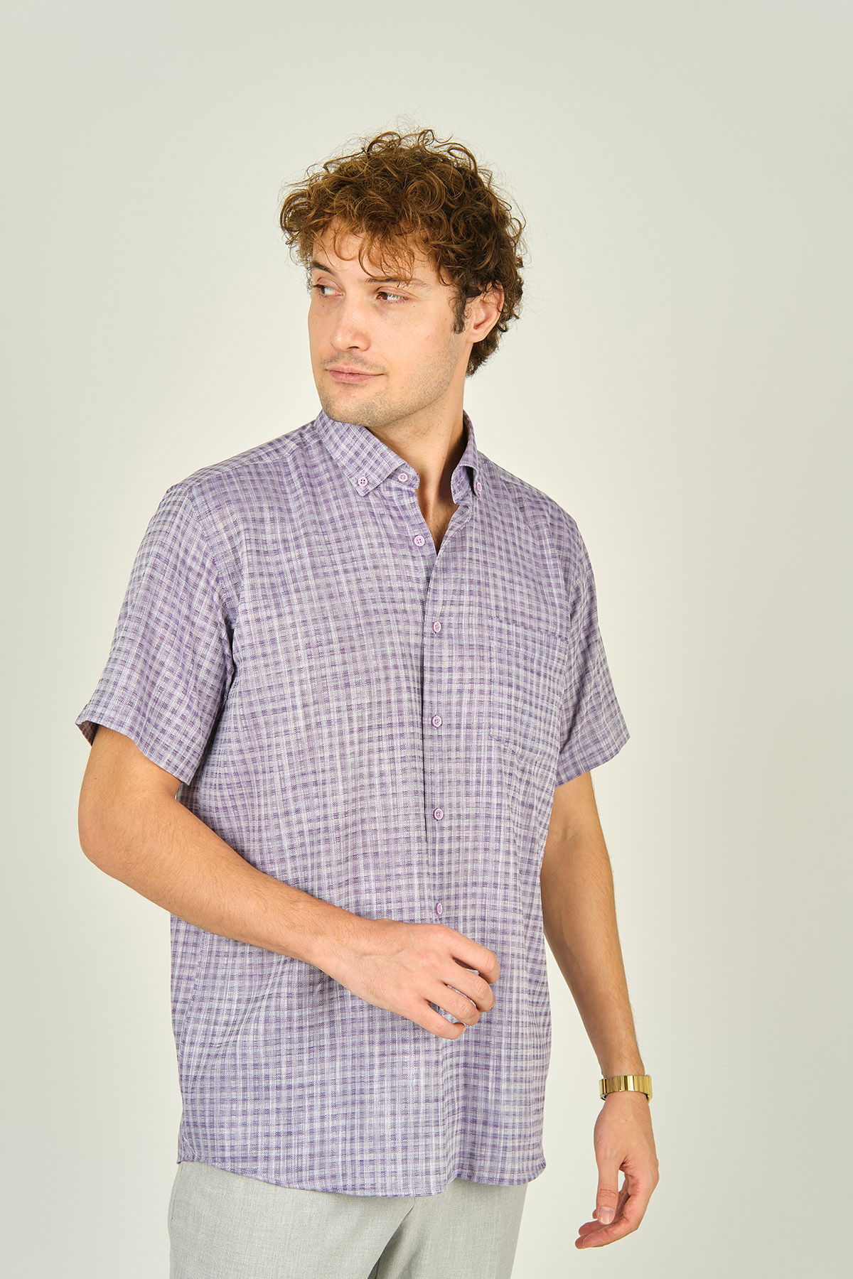 Mugi Erkek Desenli Tek Cepli Kısa Kollu %100 Pamuk Gömlek 3024 Mor