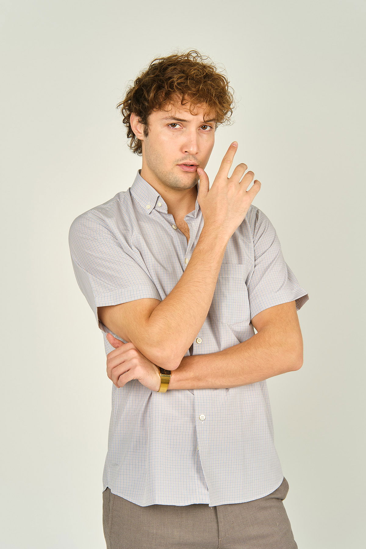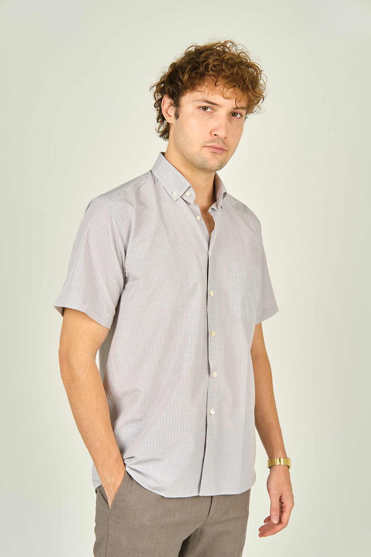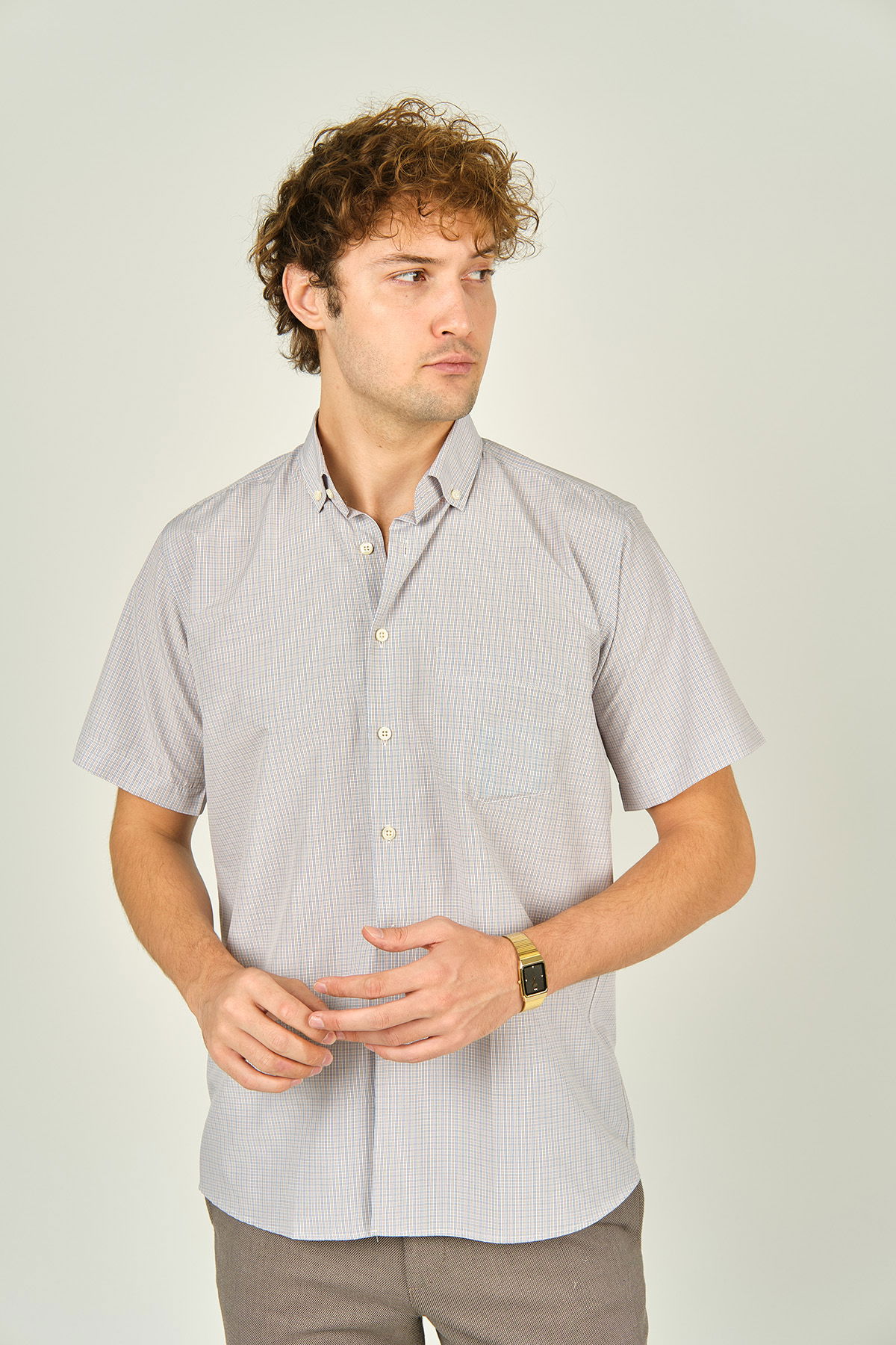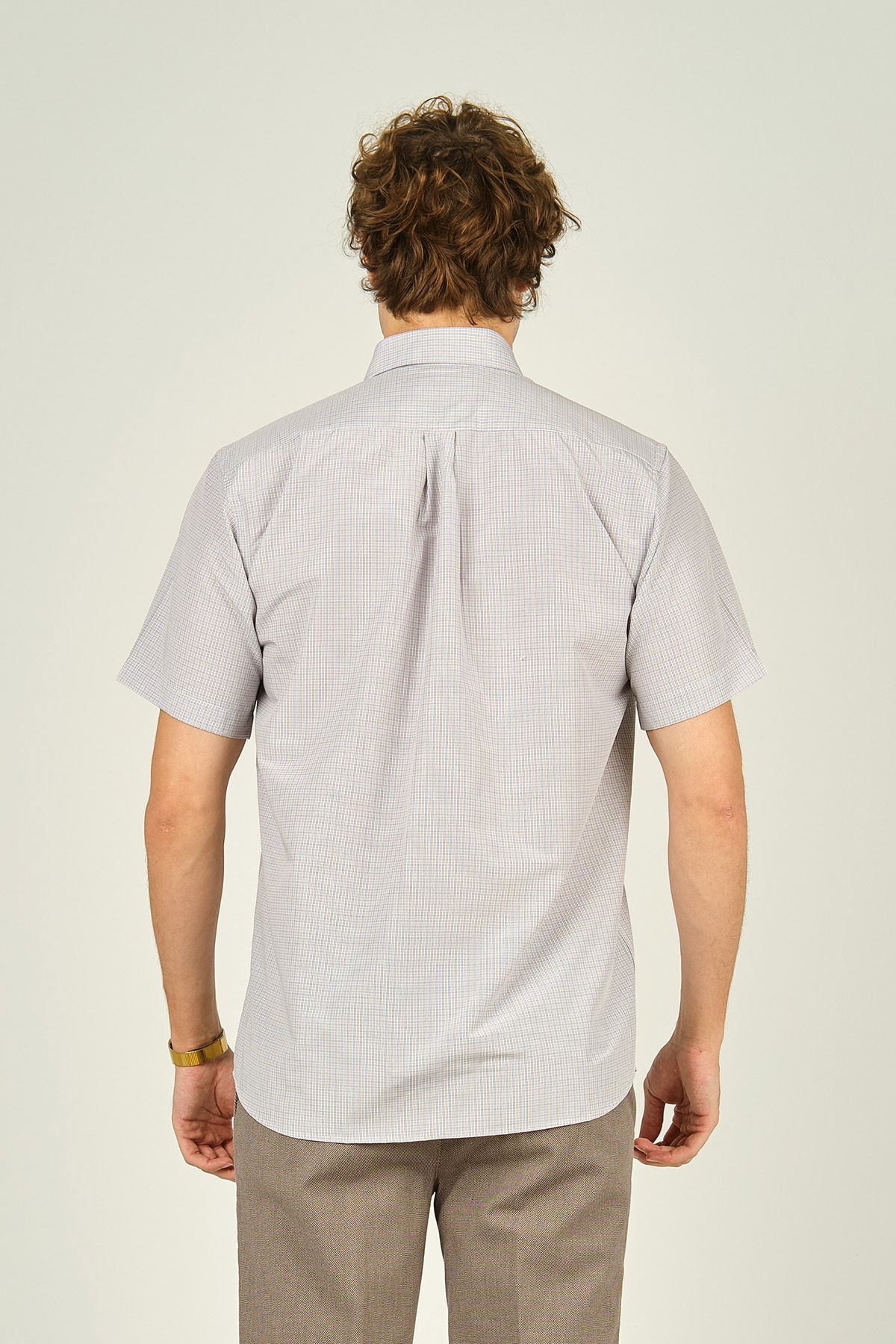 Detay: Kısa kollu, tek cepli, kare desenli gömlek ;