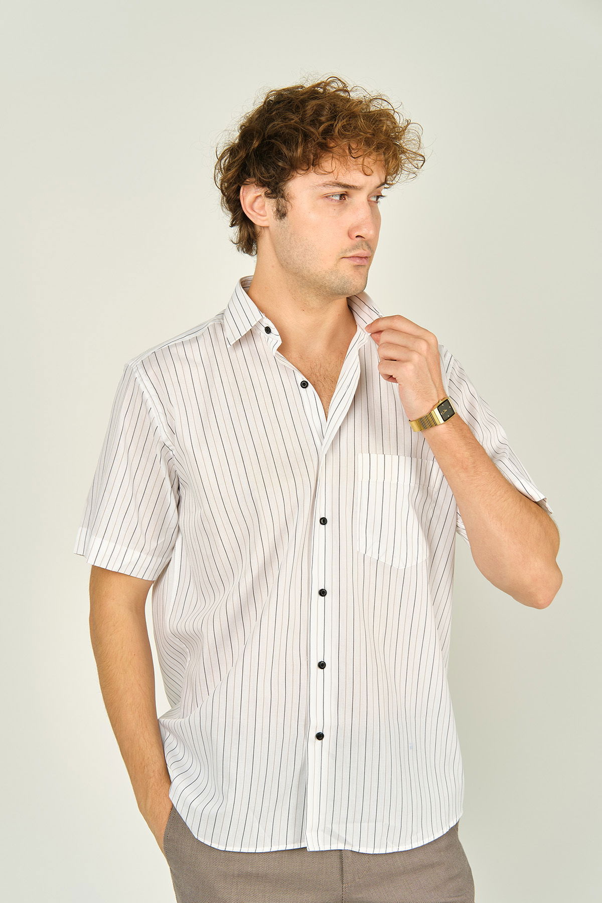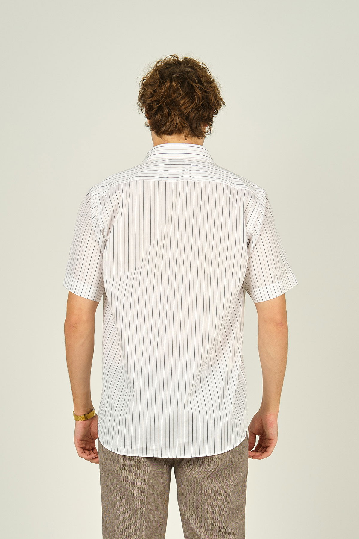 Mugi Erkek Kısa Kollu Çizgili Tek Cep %100 Pamuk Gömlek 2000 Kahverengi