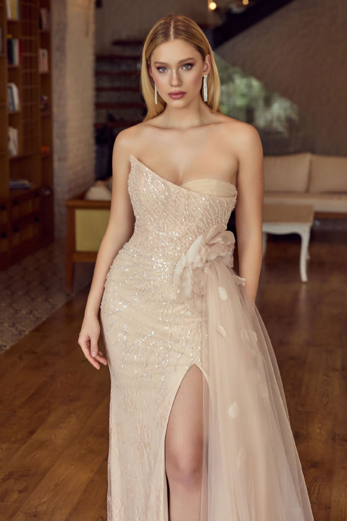 Detay: Asimetrik straplez detaylı bu uzun abiye elbise, üst bedende taş işlemeleriyle göz alıcı bir şıklık sunarken bel kısmındaki tül kumaştan gül detayıyla romantik bir dokunuş ekler. Yandan tül kuyrukla hareket kazanan tasarım, dantel kumaşın zarif dokusunu derin yırtmaçla buluşturur. Astarlı ve fermuarlı balık form kesimiyle vücuda oturan bu model, özel davetlerde ihtişamlı bir tercih olarak öne çıkar;
