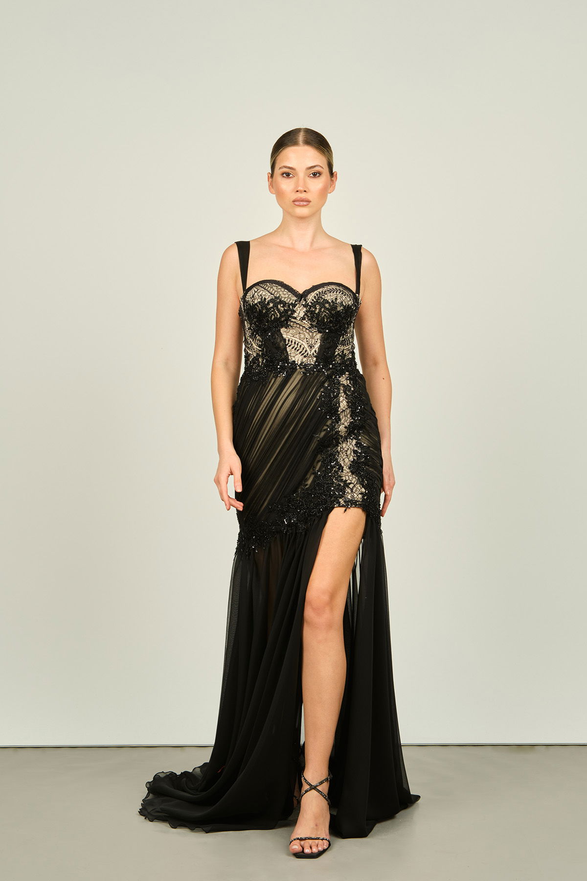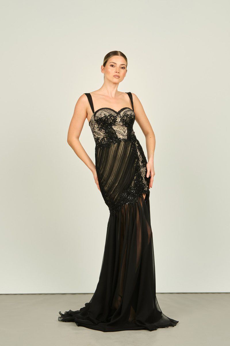 Detay: Belden uzun şifon detaylı, full ten rengi astarlı, uzun, dantel abiye elbise;
