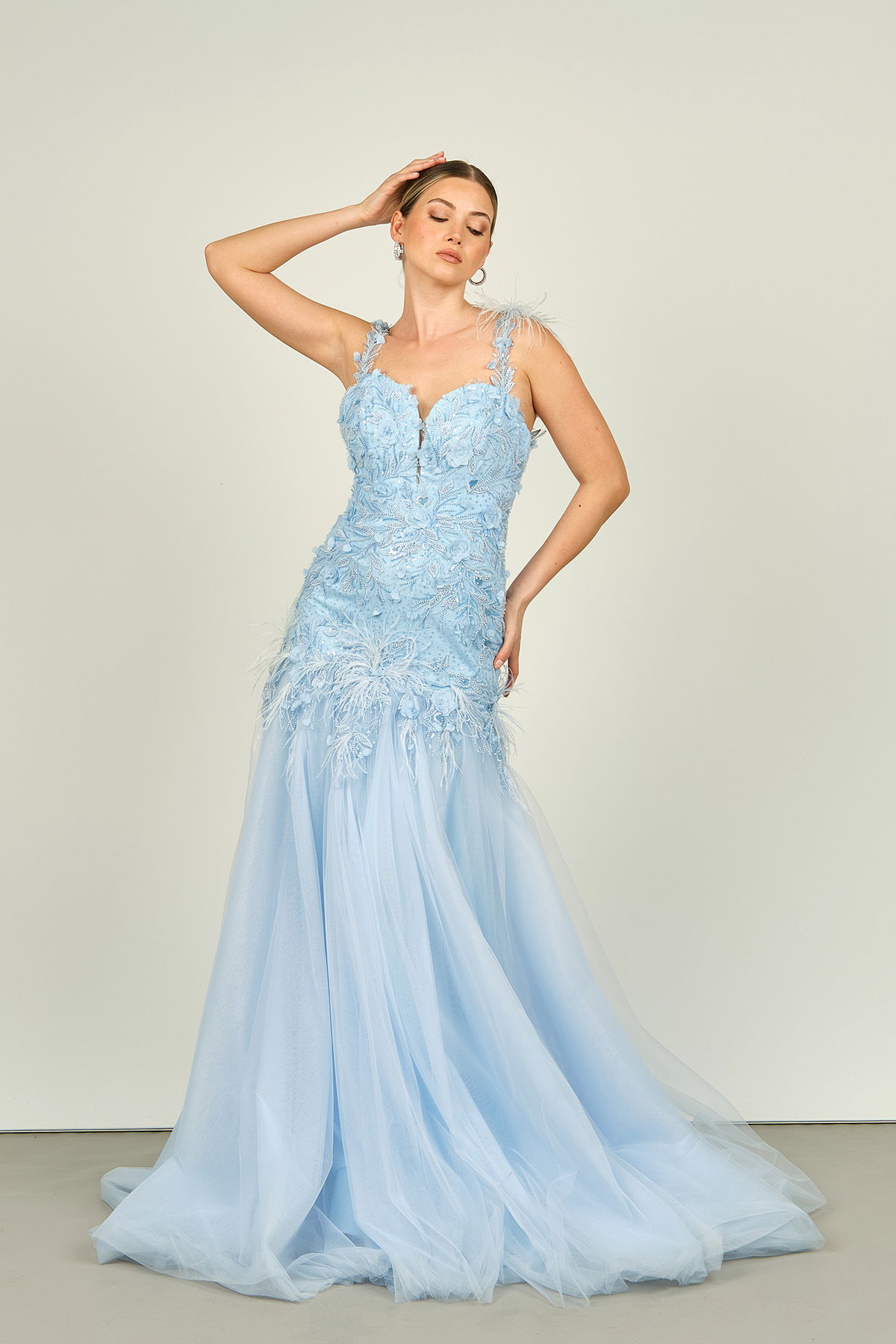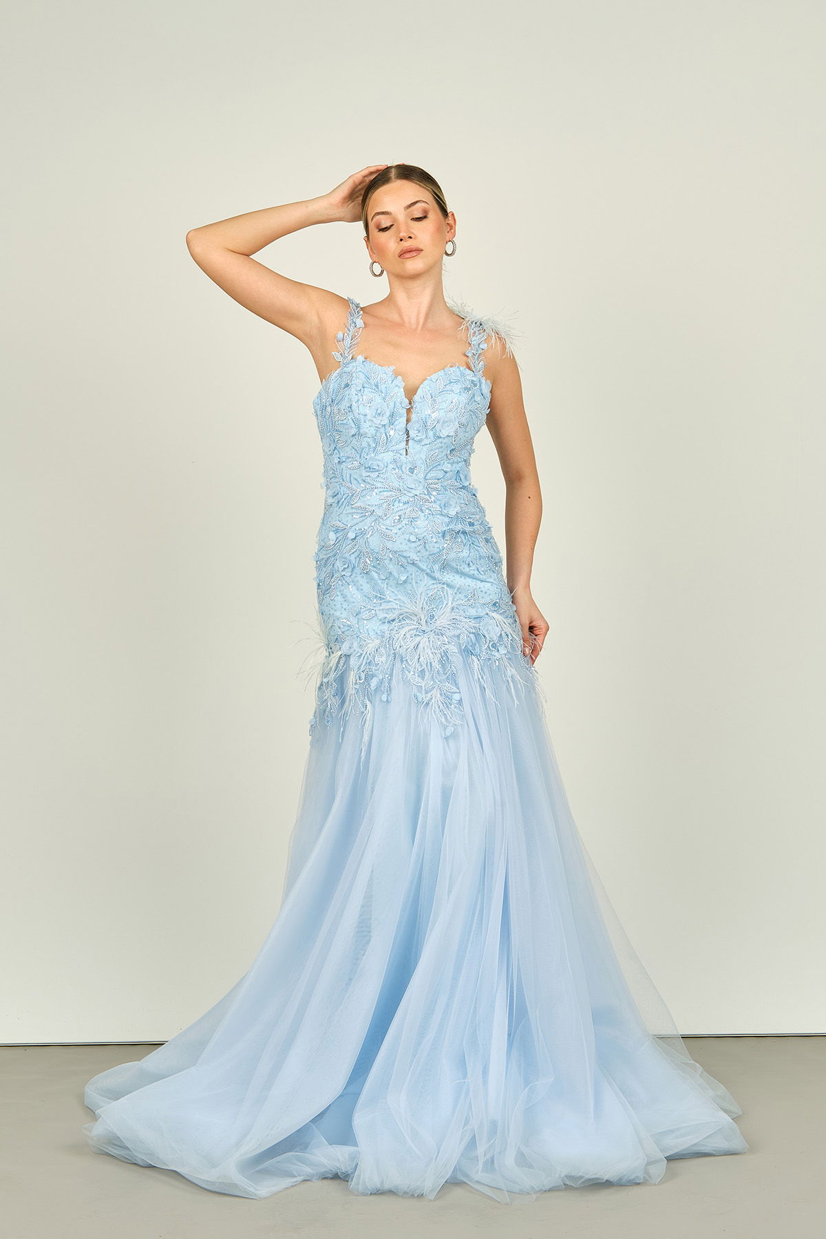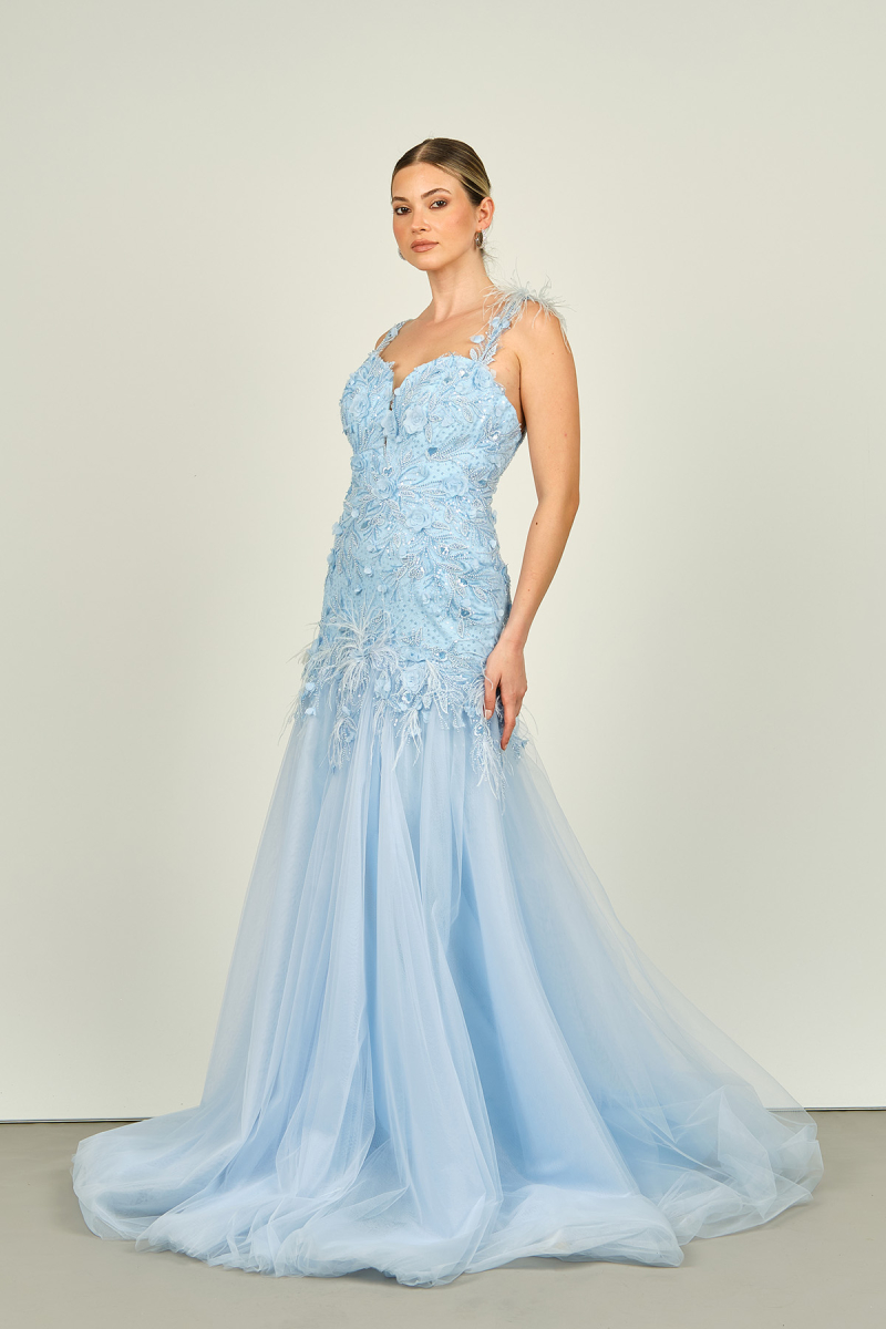 Detay: Askılı, yarım balık form, taş ve çiçek işlemeli, uzun, astarlı, abiye elbise;