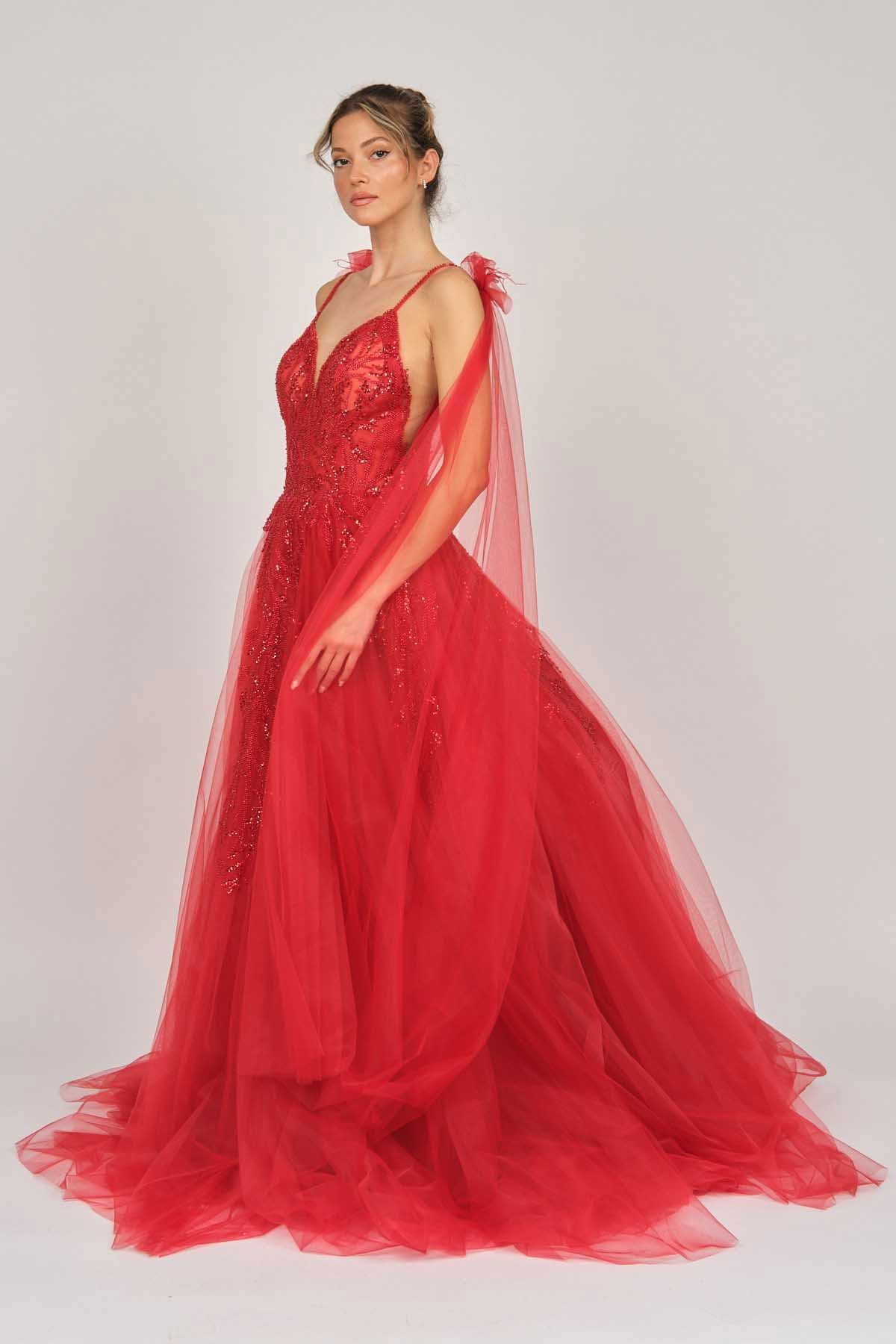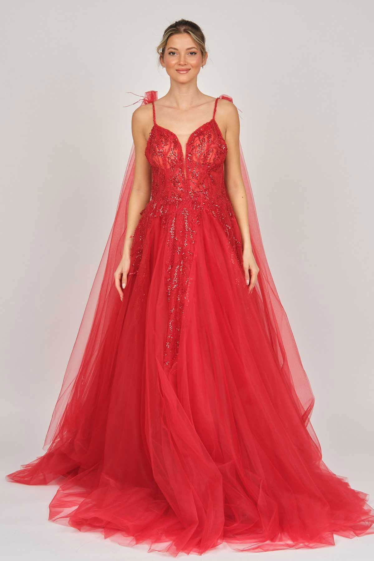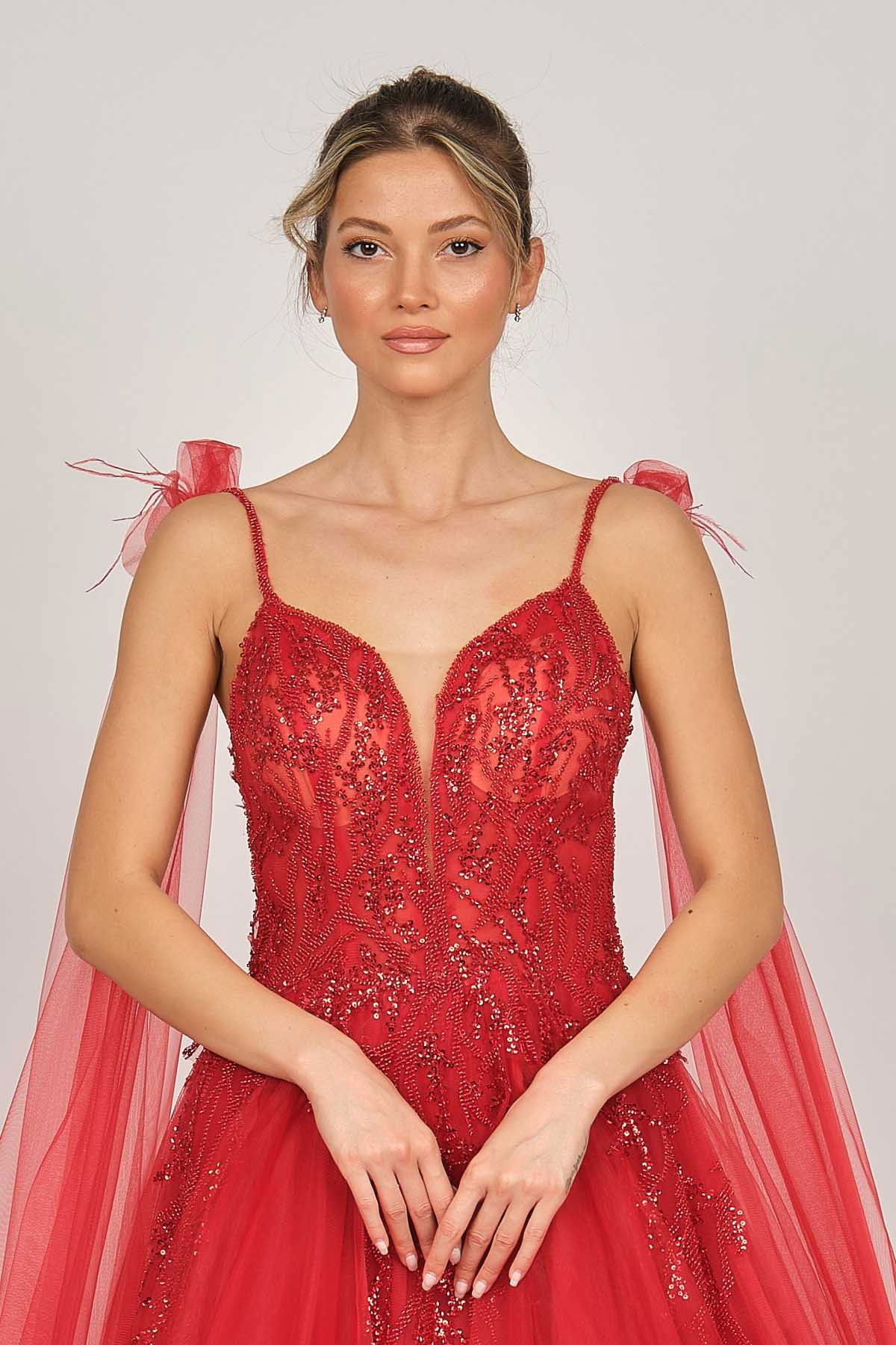 Detay: Üst pul ve boncuk detaylı, uzun, astarlı abiye elbise;