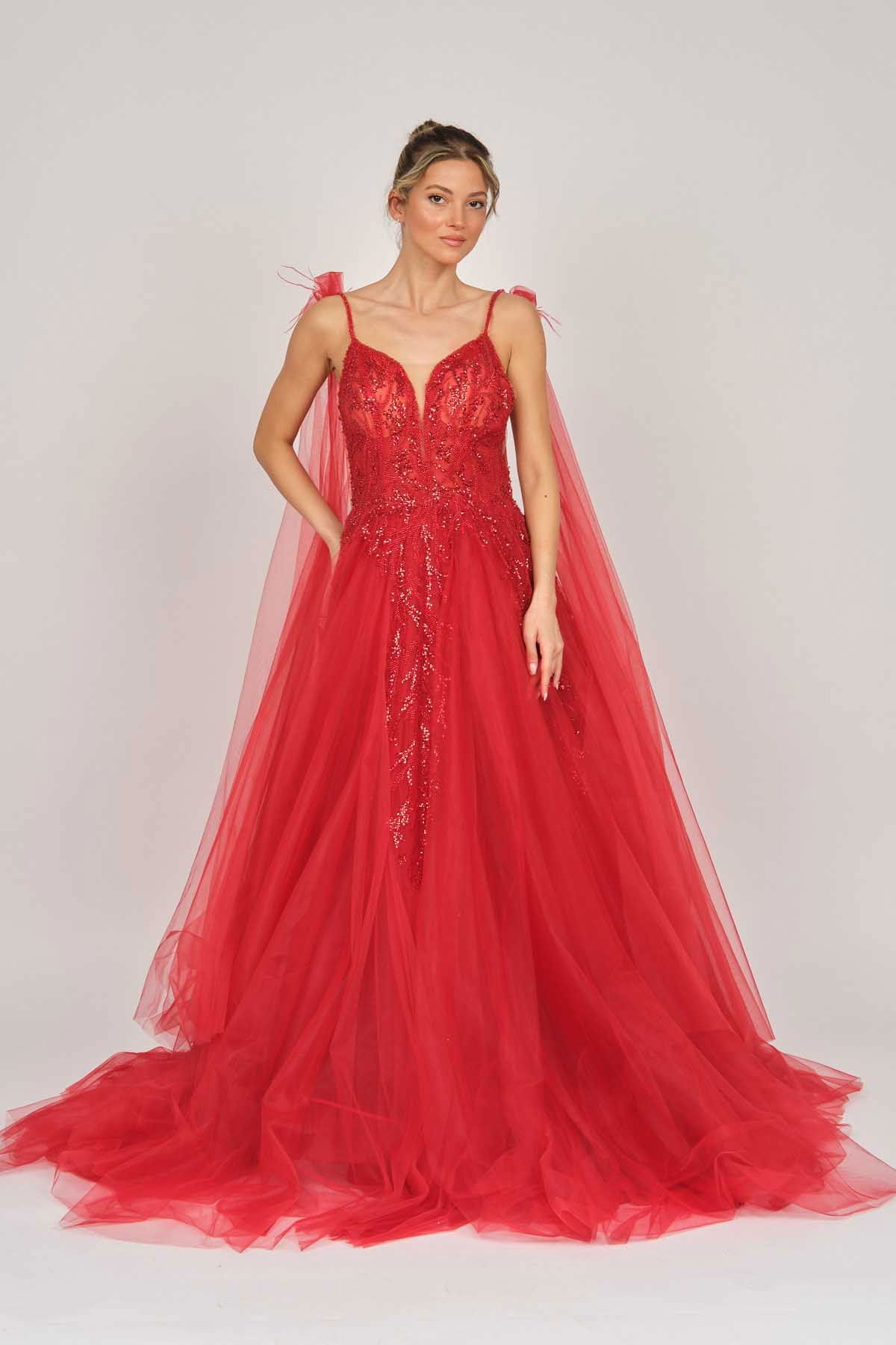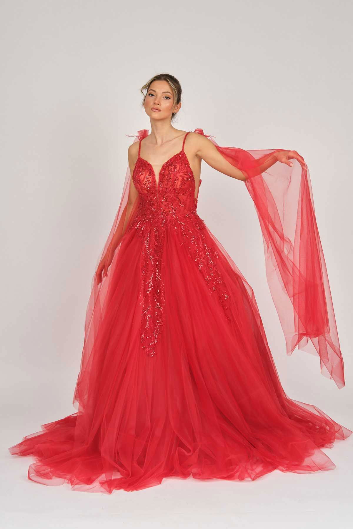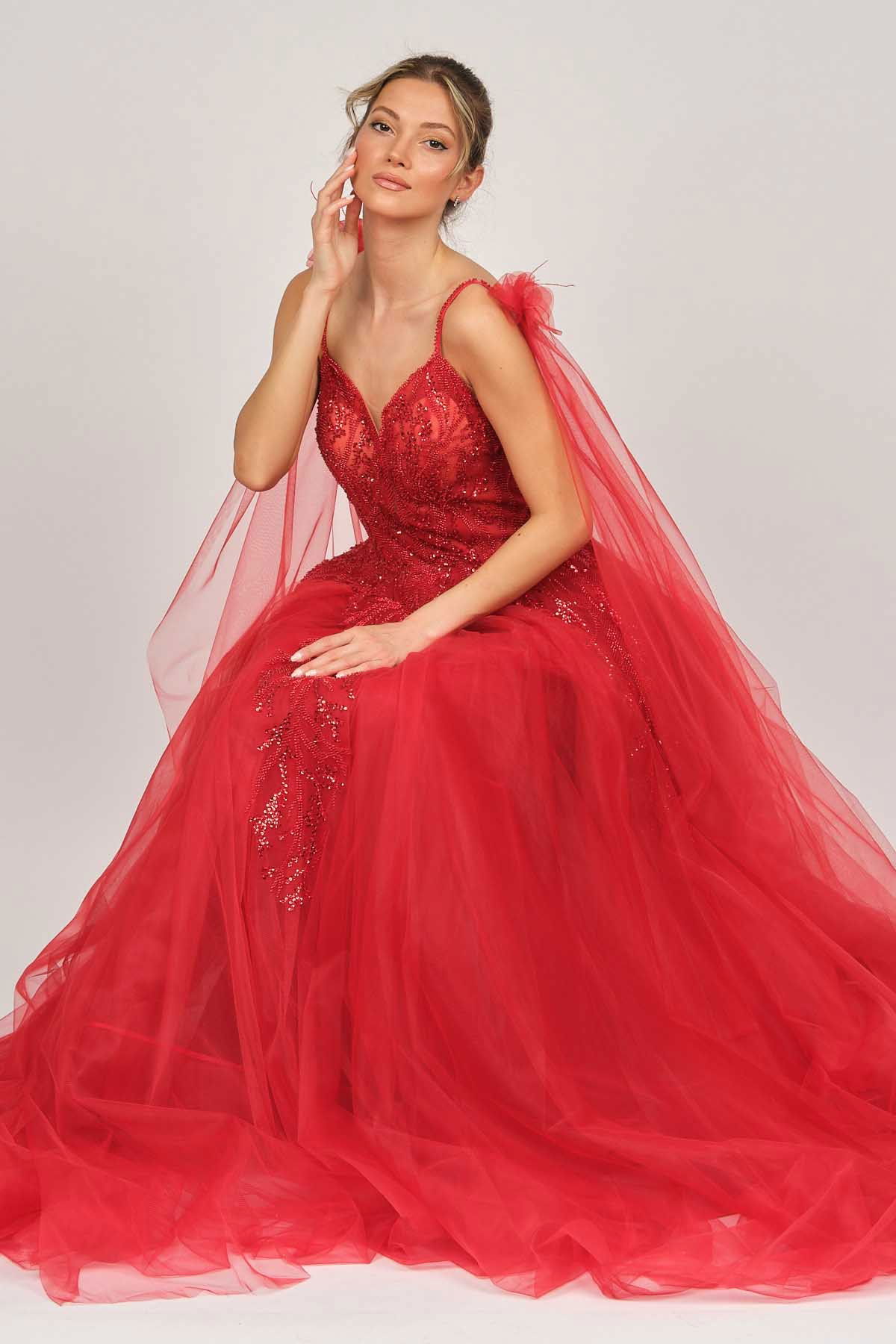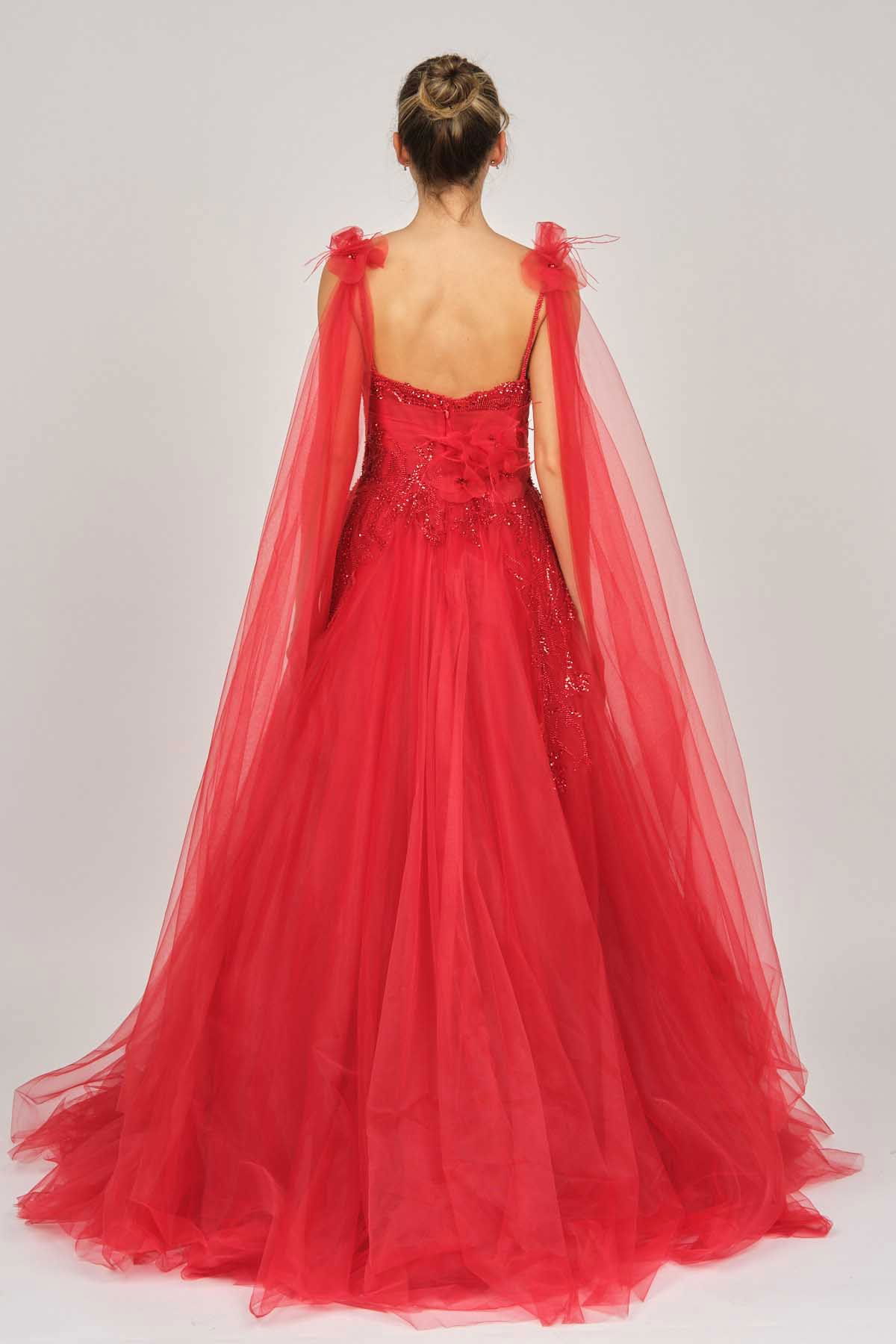 Detay: Üst pul ve boncuk detaylı, uzun, astarlı abiye elbise;
