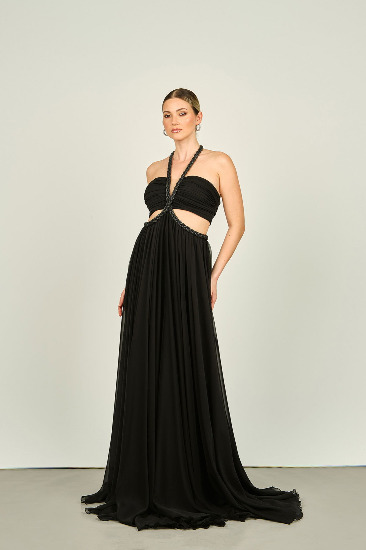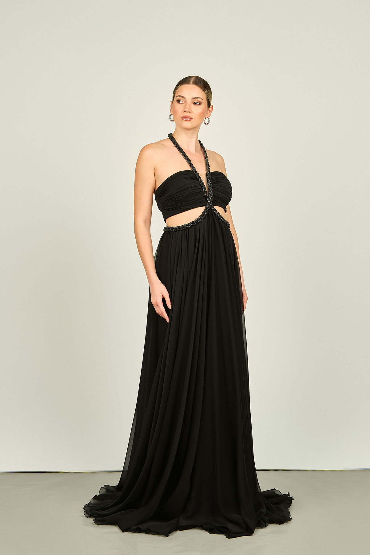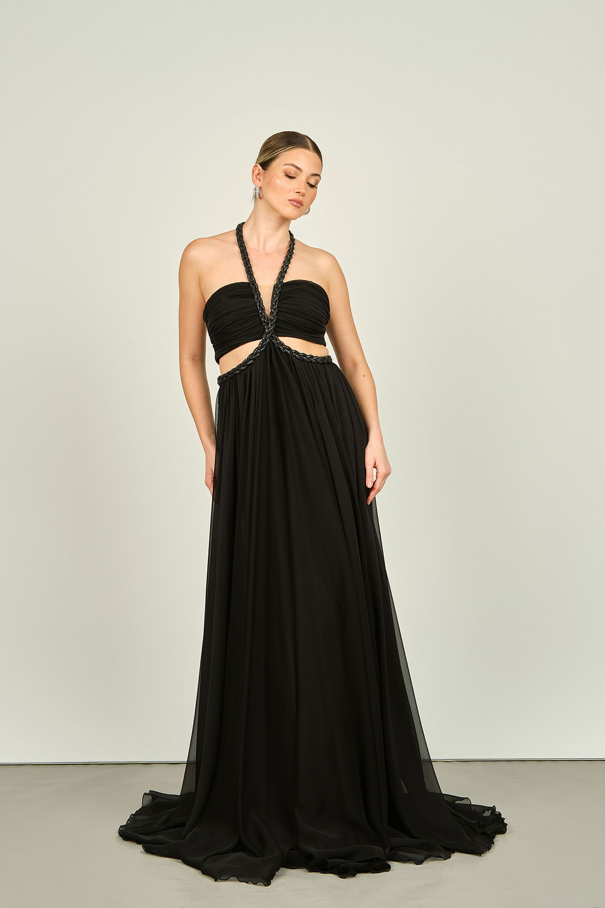 Detay: Boyundan örgü bağlamalı ve örgüsü taş detaylı, Derin V yaka, sırt dekolteli, astarlı, uzun abiye elbise;