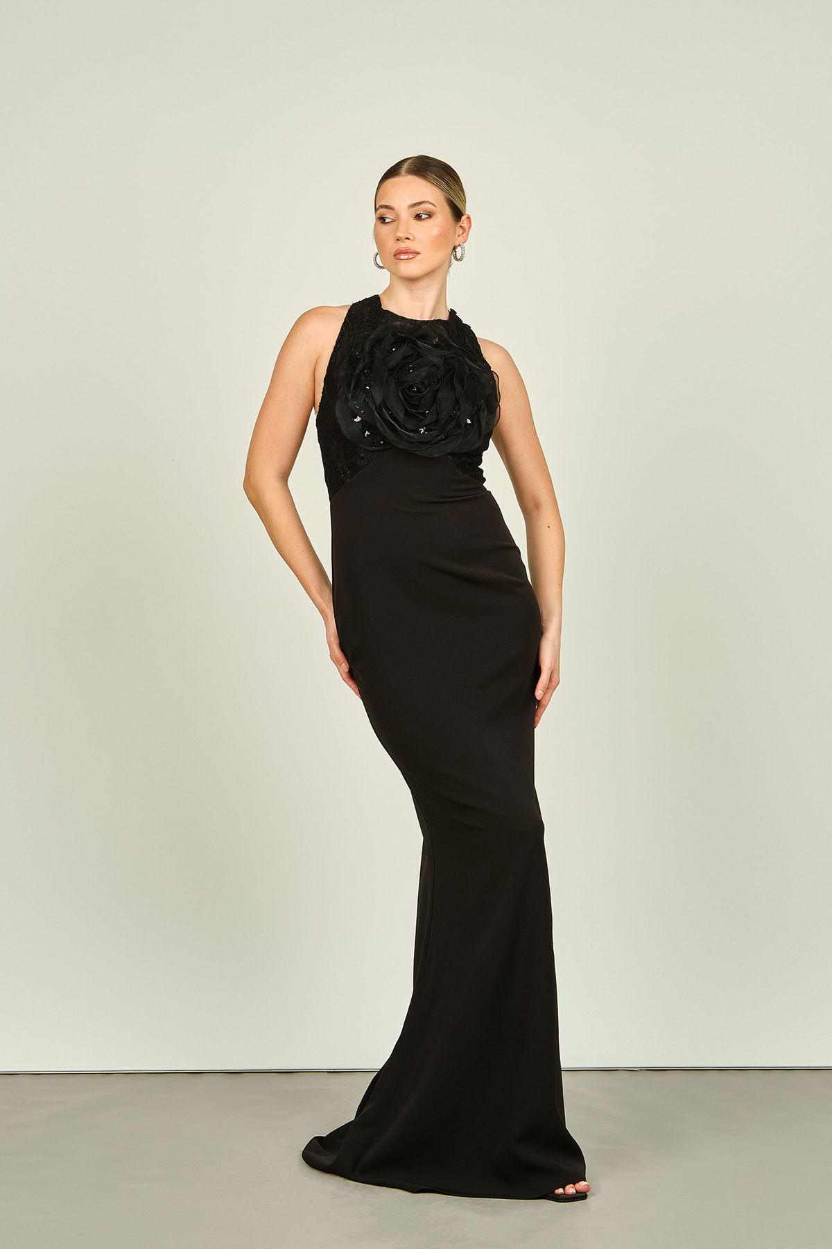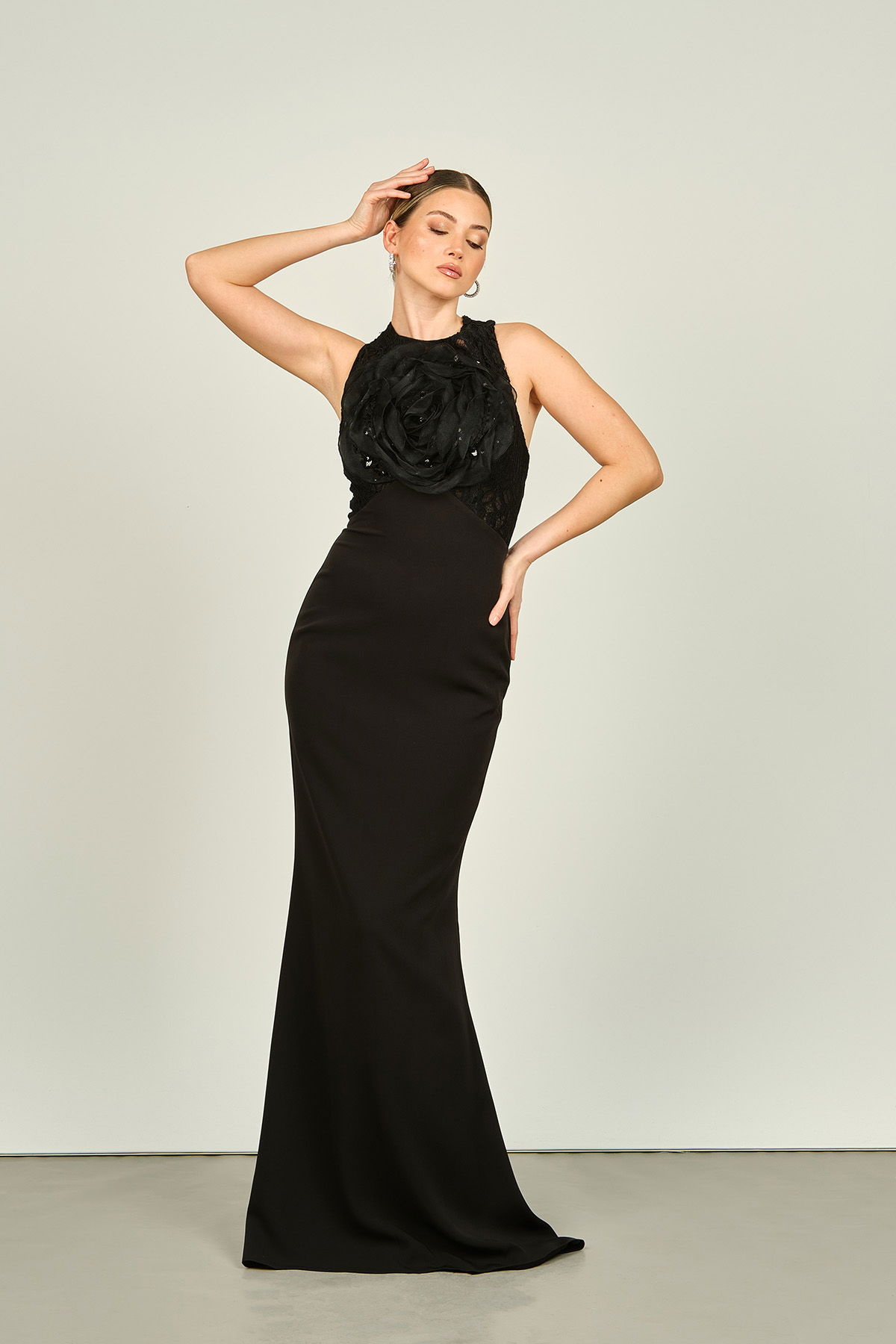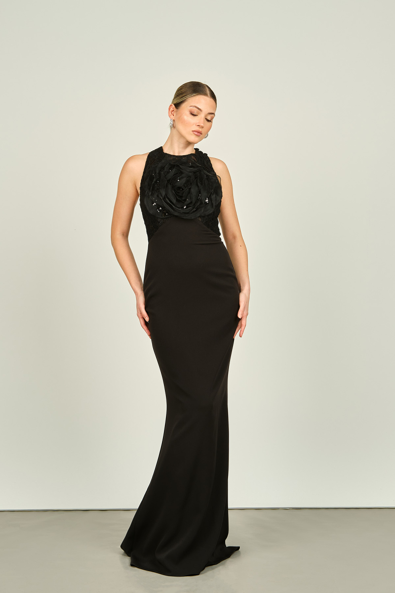 Detay: Sırt çapraz detaylı, halter yaka, balık form. astarlı, uzun abiye elbise;